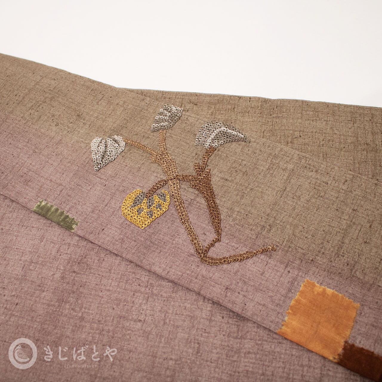 正絹紬 臙脂鼠に刺繍のなごや