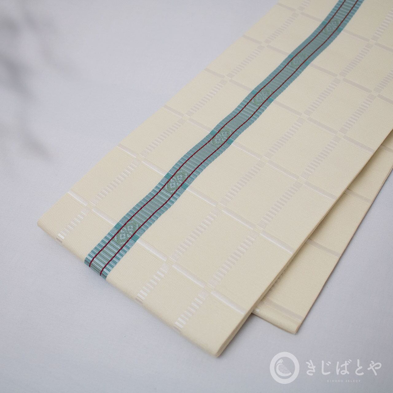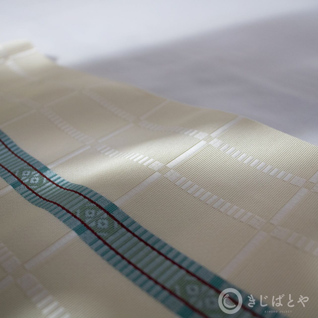 地は練色(ねりいろ:橙みの白)で、やわらかなクリーム色というと近いでしょうか。きっぱりと走る青磁のラインが美しく、シンプルなようですが地に白く織られた白の格子が美しく浮かび上がり、上品な表情があります。