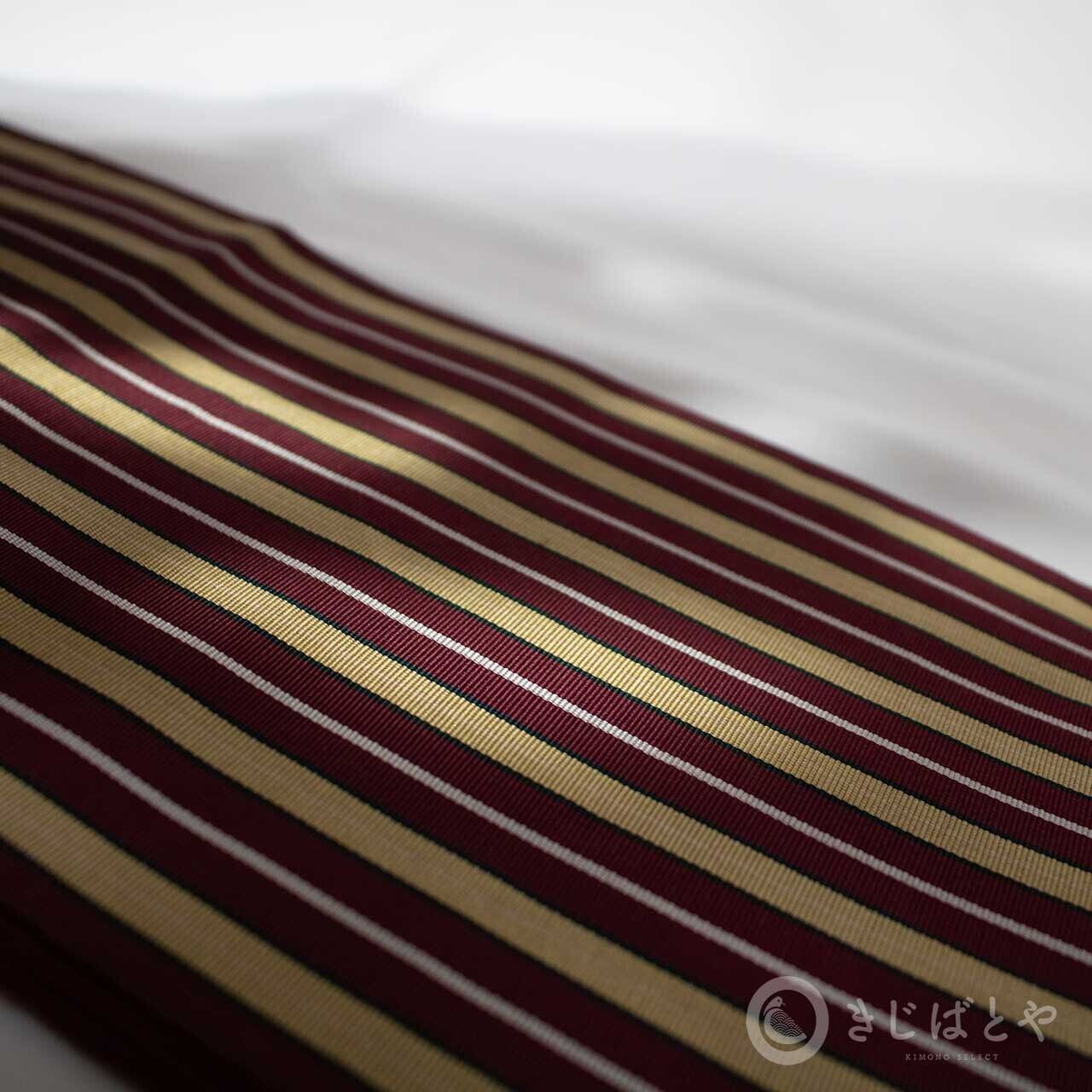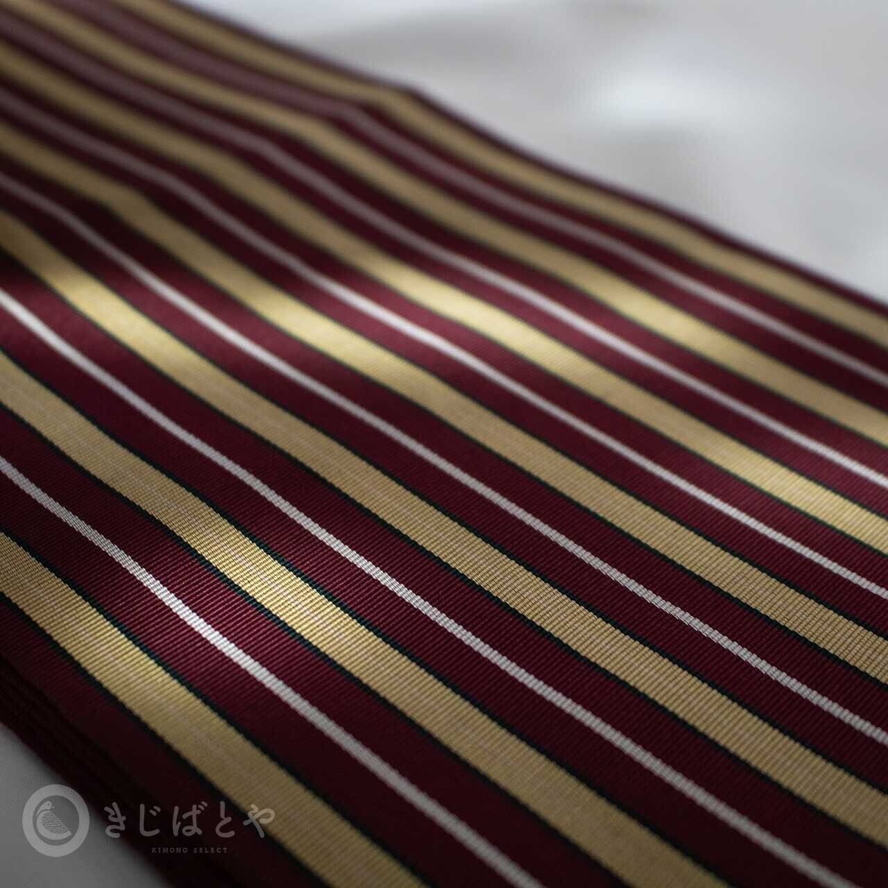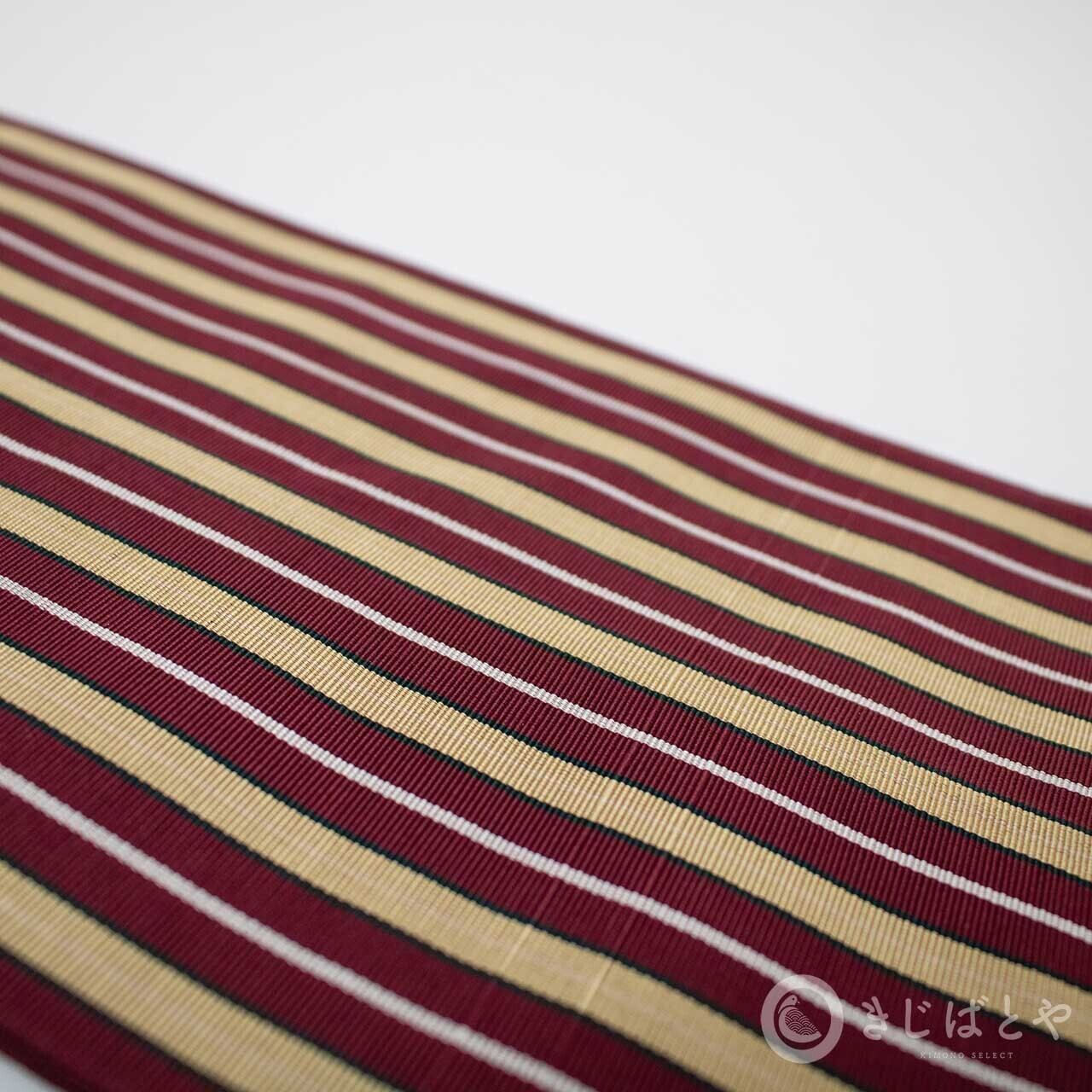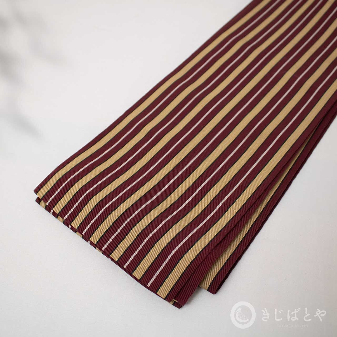 深緋(ふかきあけ:暗い紅赤)に楊梅色(やまももいろ:明るく渋い橙)の縞が映え、どこか懐かしいようでもあり、モダンでもあり。合わせる着物や浴衣、コーデによって表情を変えられる帯だと思います。