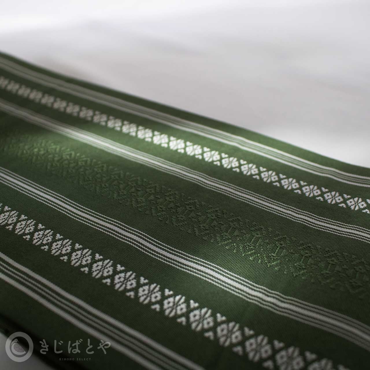 地は青丹(あおに:暗い黄緑)で、和の色事典では暗い黄緑と書かれていますが、見た印象ではそれほど黄色みは強くありません。深くこっくりとした緑色で、ほんの少し渋みもあり、深みのあるとてもいい色です。深い色に。献上柄の白が明るく美しく映えます。