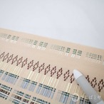 鳶色(とびいろ:深く渋い赤)、空色鼠(そらいろねず:青みの明るい灰)、藍碧(らんぺき:暗い青緑)、光沢のある白などなどで織られた柄がなんともかわいらしく、どこか外国の布を思わせるような色柄です。