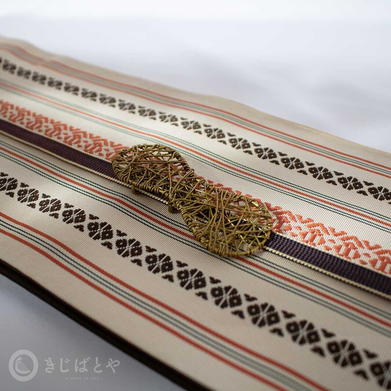 どこか外国の布を思わせるような色の組み合わせでもあり、半幅帯にしてはめずらしい配色だと思います。