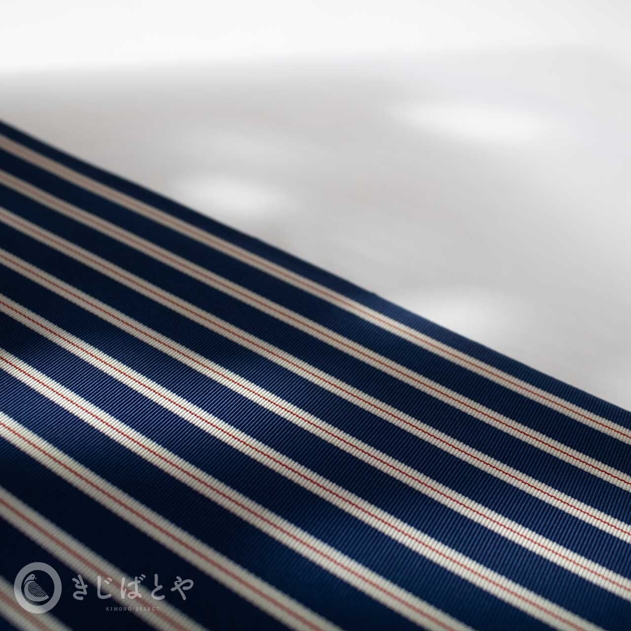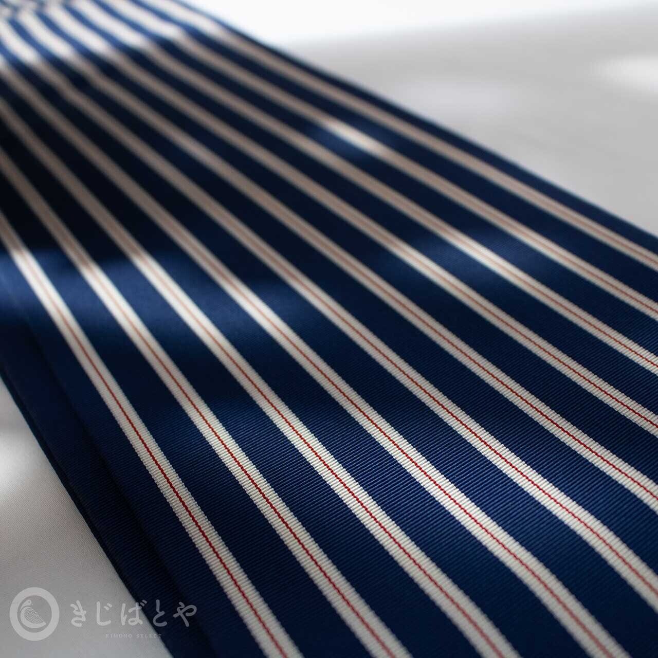 濃紺に白の縞、細く走る赤がなんとも美しく、現代風の柄ゆきでとてもめずらしいです。