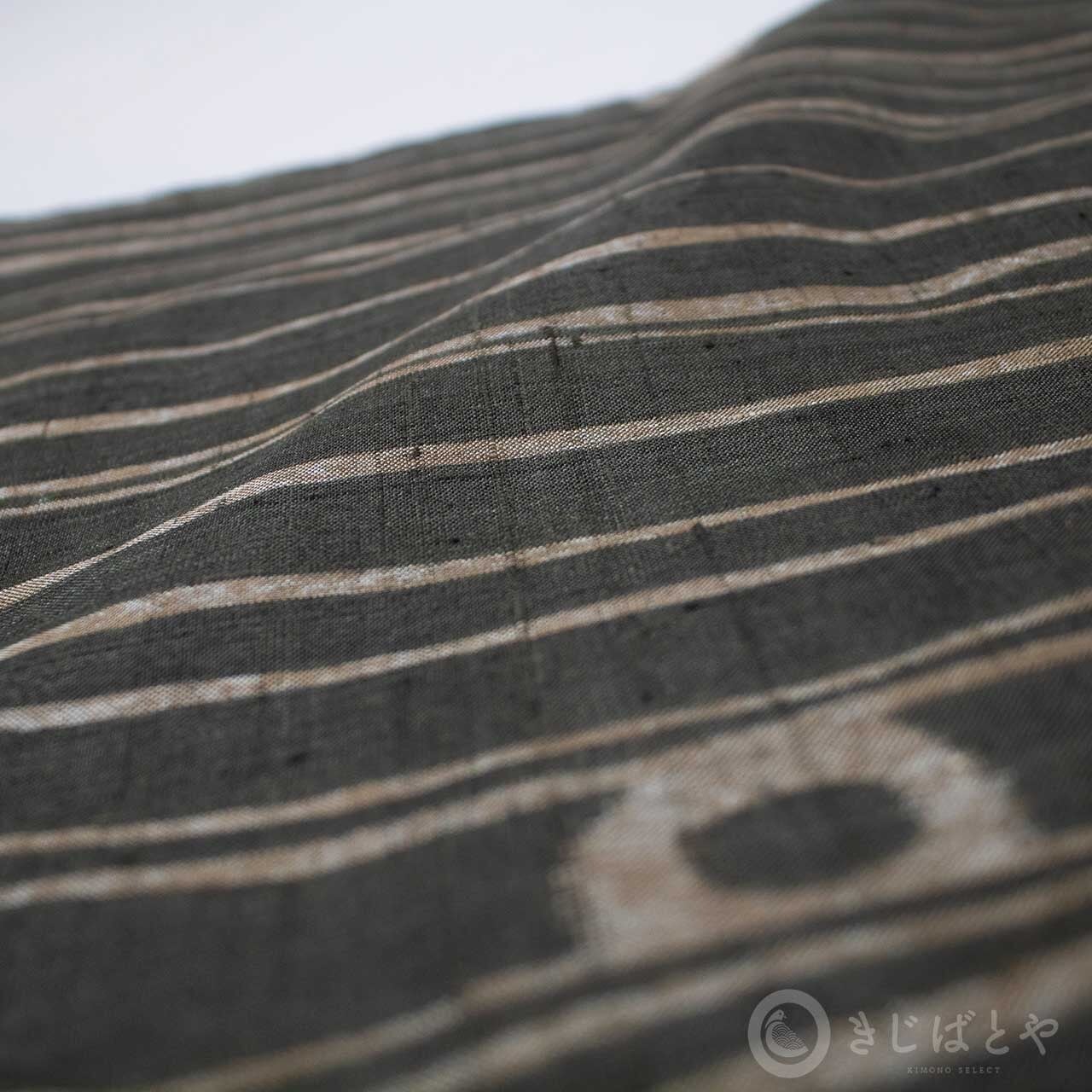 よろけた縞と、ところどころに織られた丸い柄が良いアクセントになっています。縞は着姿をほっそりと見せてくれますが、線が強いと着姿もかたくなりがちです。
