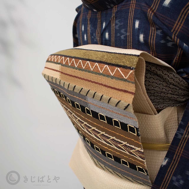 外国の織物を思わせる織り柄が美しい、紬の八寸なごやです。松葉仕立てになっています。