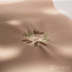 花は芍薬かと思うのですが、葉のかたちがちがうので、なんともいえません。ですが帯揚げですので、表に見えるのはほんの一部となりますので、季節を問わずお召しいただるかと思います。