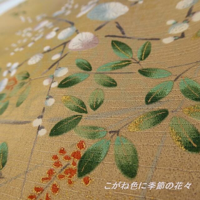 すれたような地模様に、萩や紫陽花、梅などの季節の花々が美しくちりばめられ、とても美しいです。