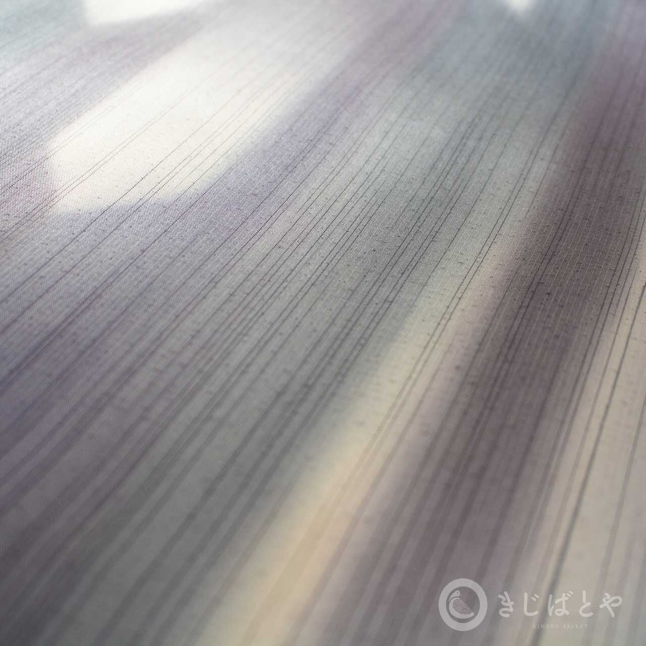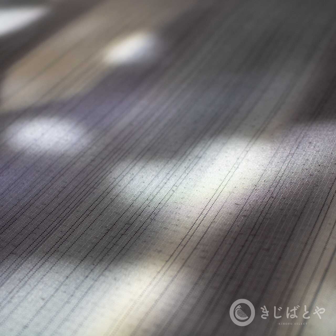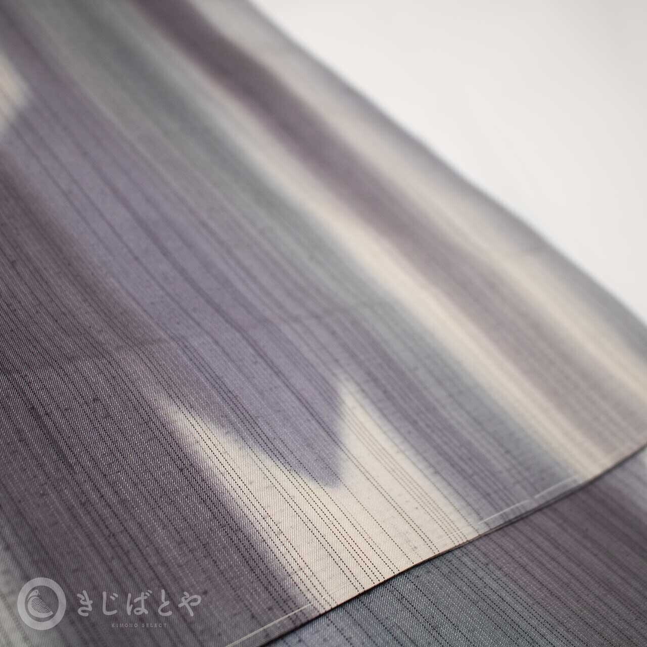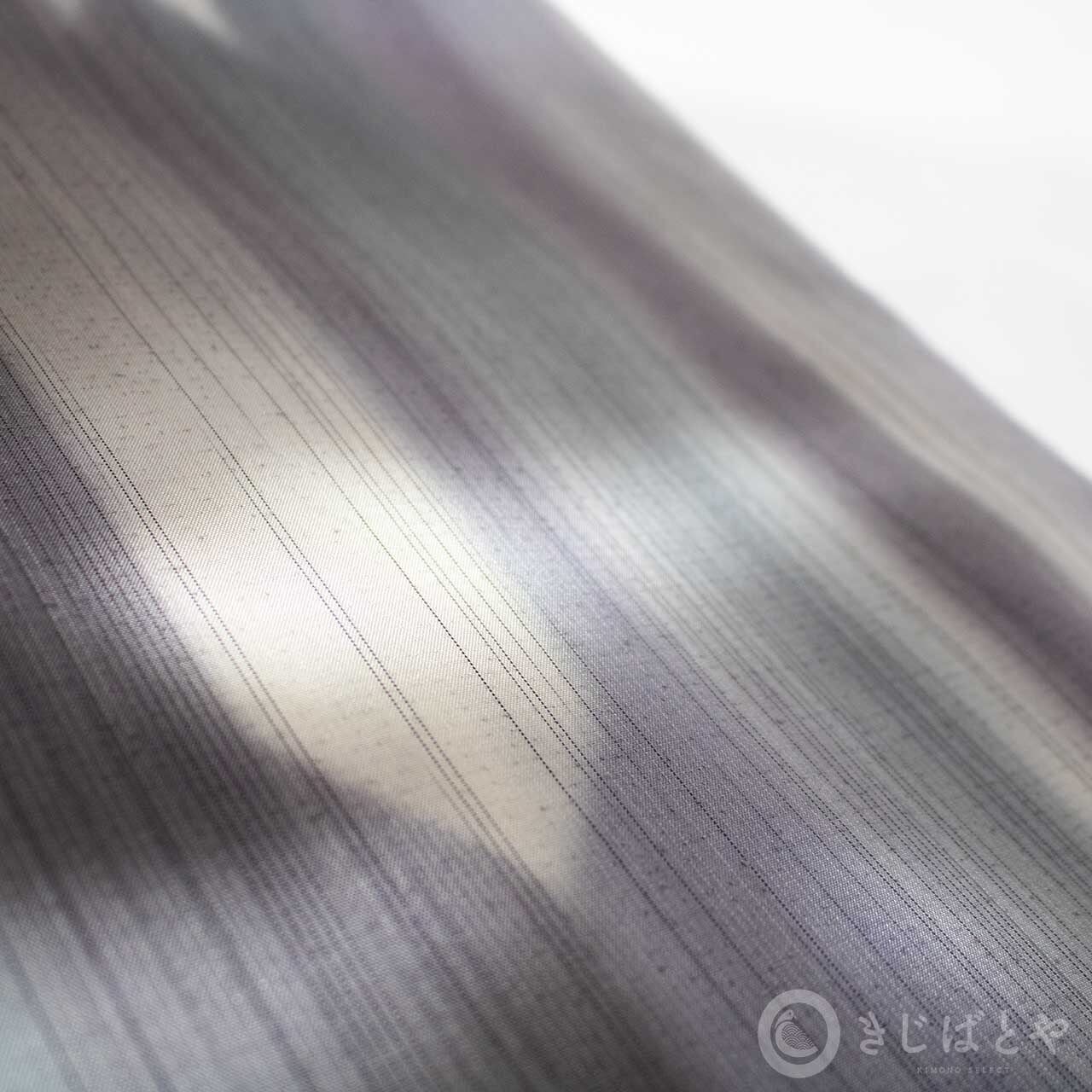 錫紵(しゃくじょ:青みの灰)、薄鈍(うすにび:青みの灰)、空色鼠(そらいろねず:青みの明るい灰)、月白(げっぱく:青みの白)と、青みがかった灰のぼかしで、白い矢羽根が美しく浮かび上がります。縦に流れる深い色の糸が表情を深くして、本当に美しいです。色というのは不思議なもので、ほんの少し使われている紫や深い緑の色を目が拾うので、地色自体にその色がなくても、表情や深みとして感じます。