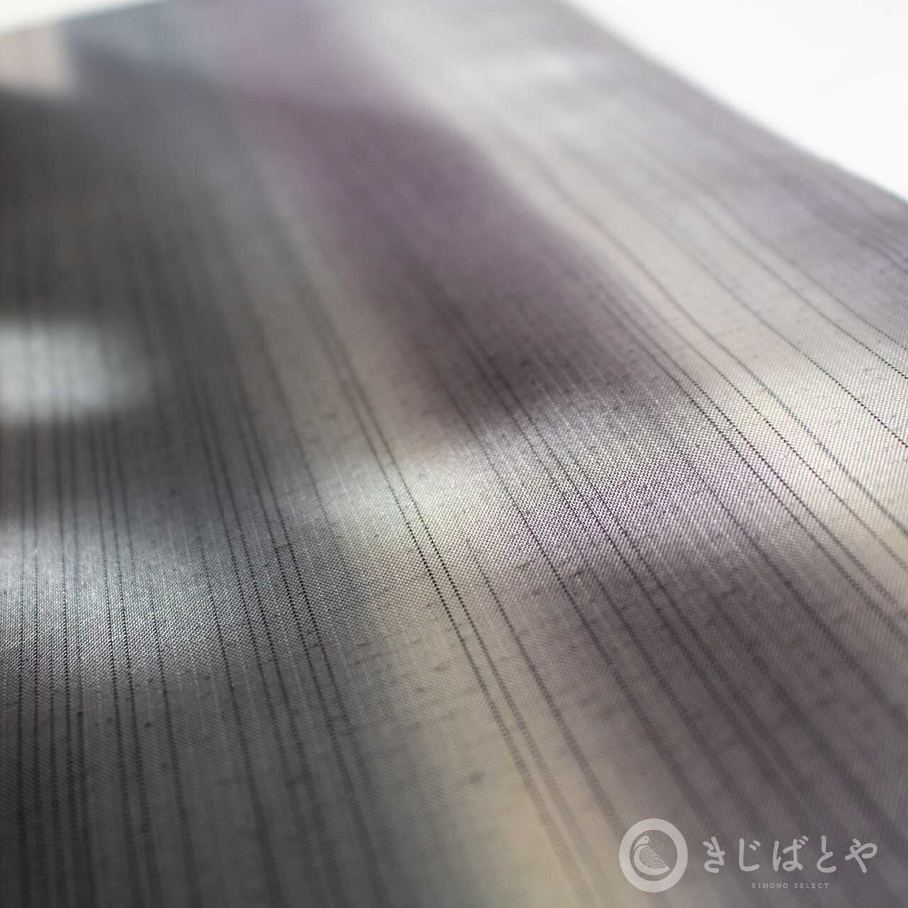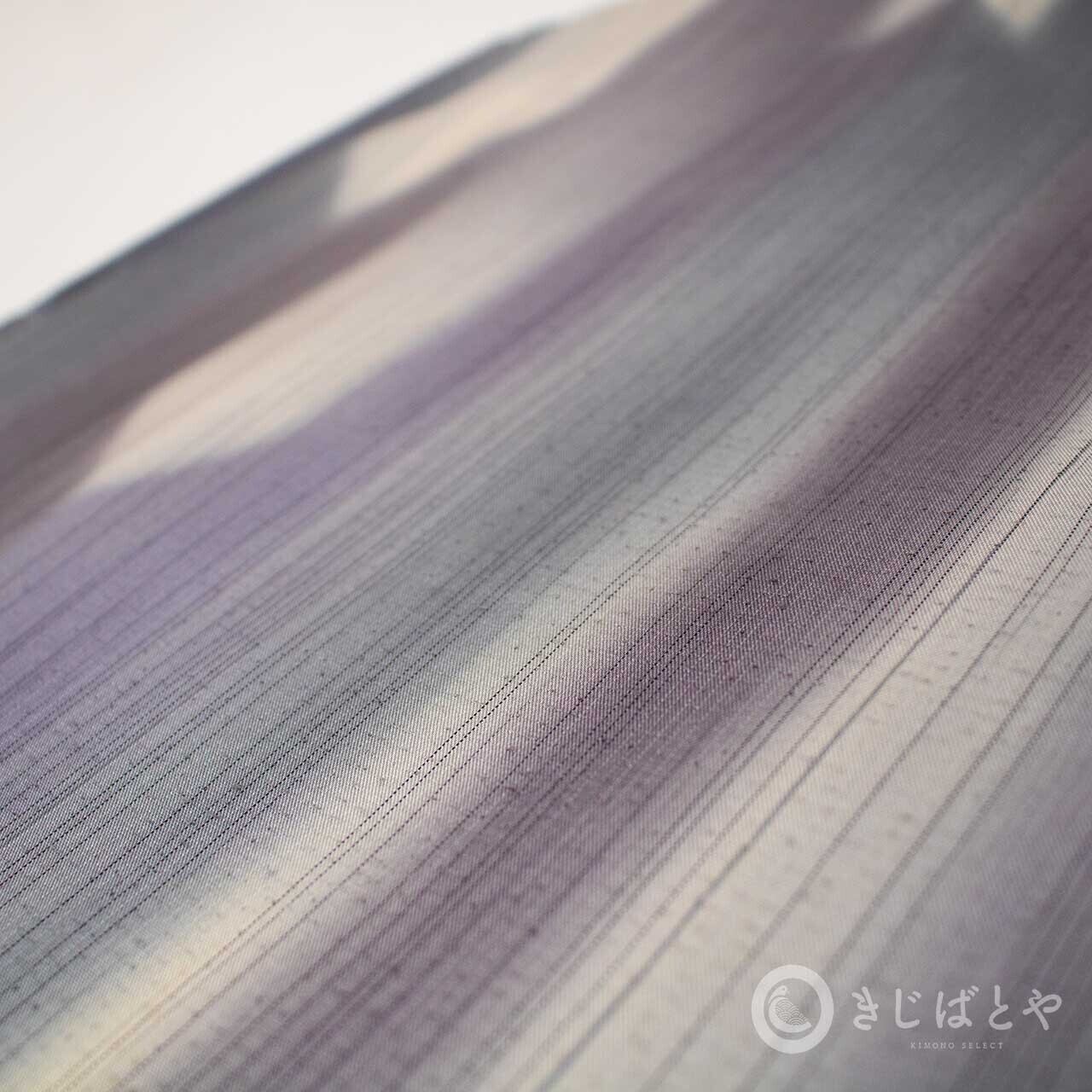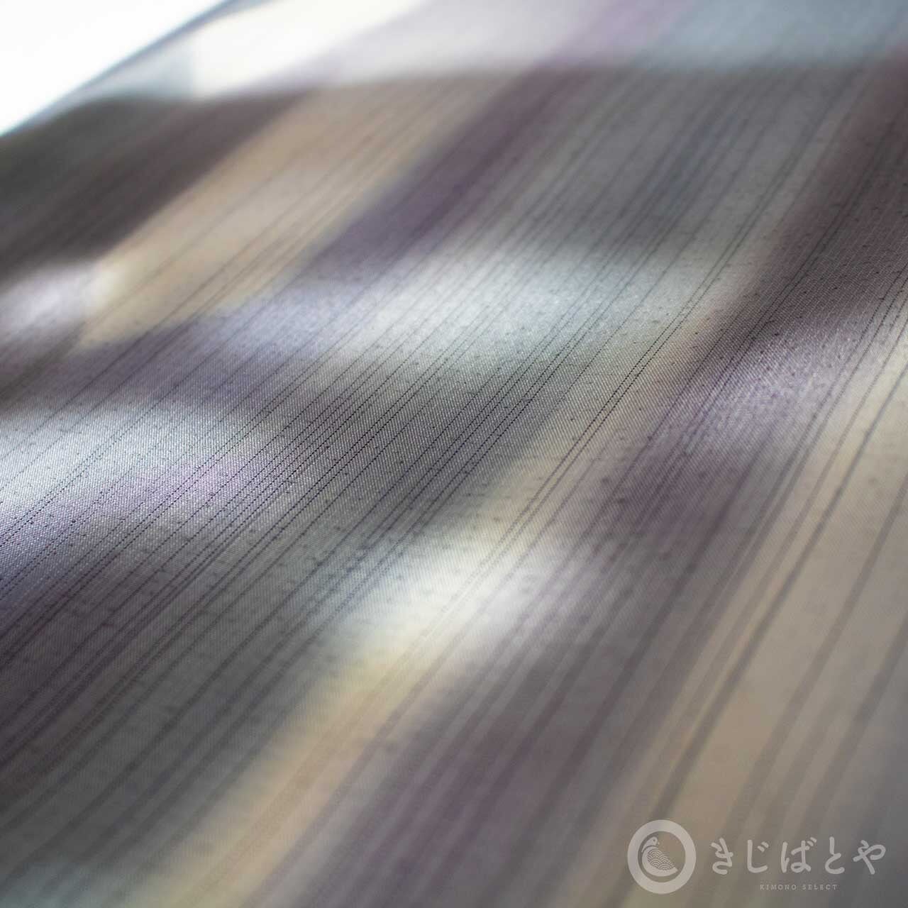 錫紵(しゃくじょ:青みの灰)、薄鈍(うすにび:青みの灰)、空色鼠(そらいろねず:青みの明るい灰)、月白(げっぱく:青みの白)と、青みがかった灰のぼかしで、白い矢羽根が美しく浮かび上がります。縦に流れる深い色の糸が表情を深くして、本当に美しいです。色というのは不思議なもので、ほんの少し使われている紫や深い緑の色を目が拾うので、地色自体にその色がなくても、表情や深みとして感じます。