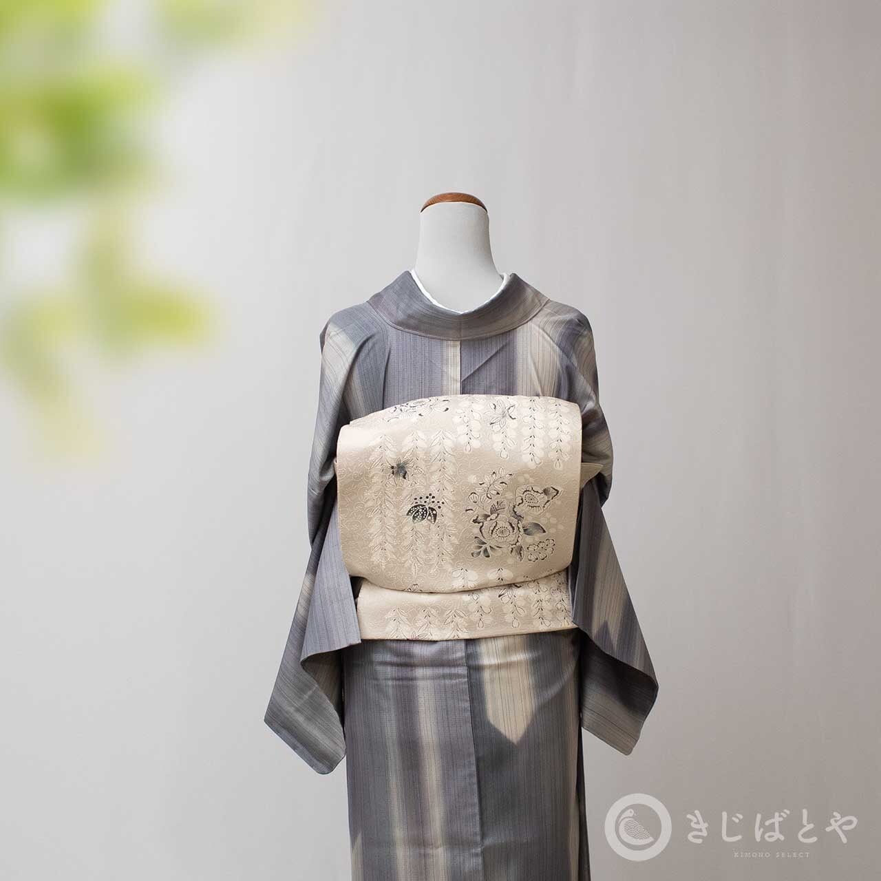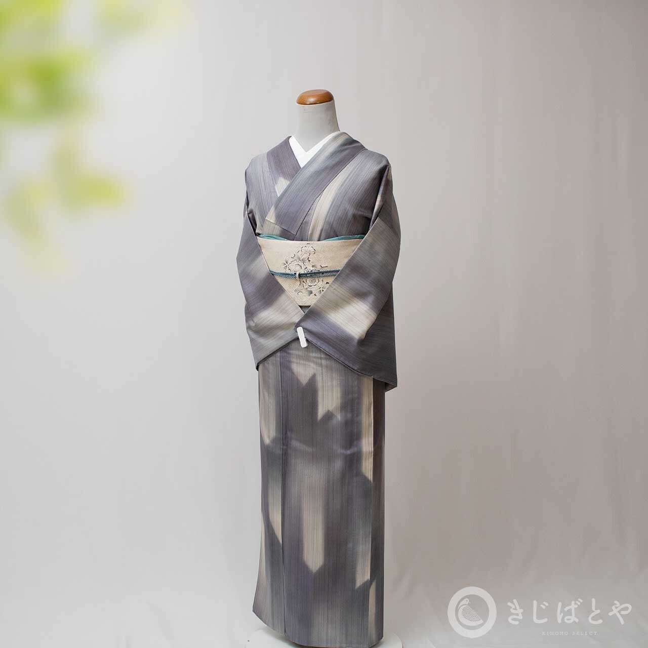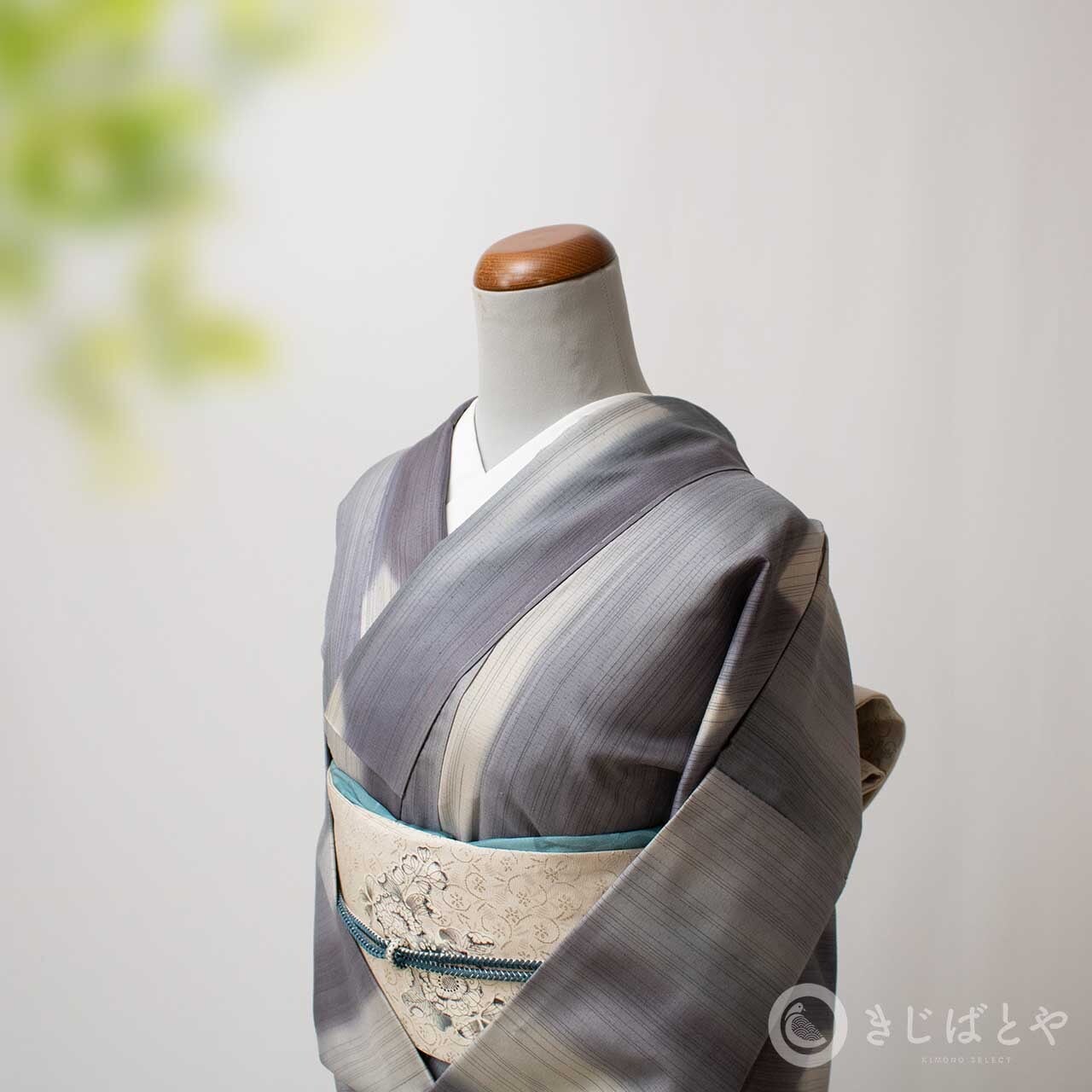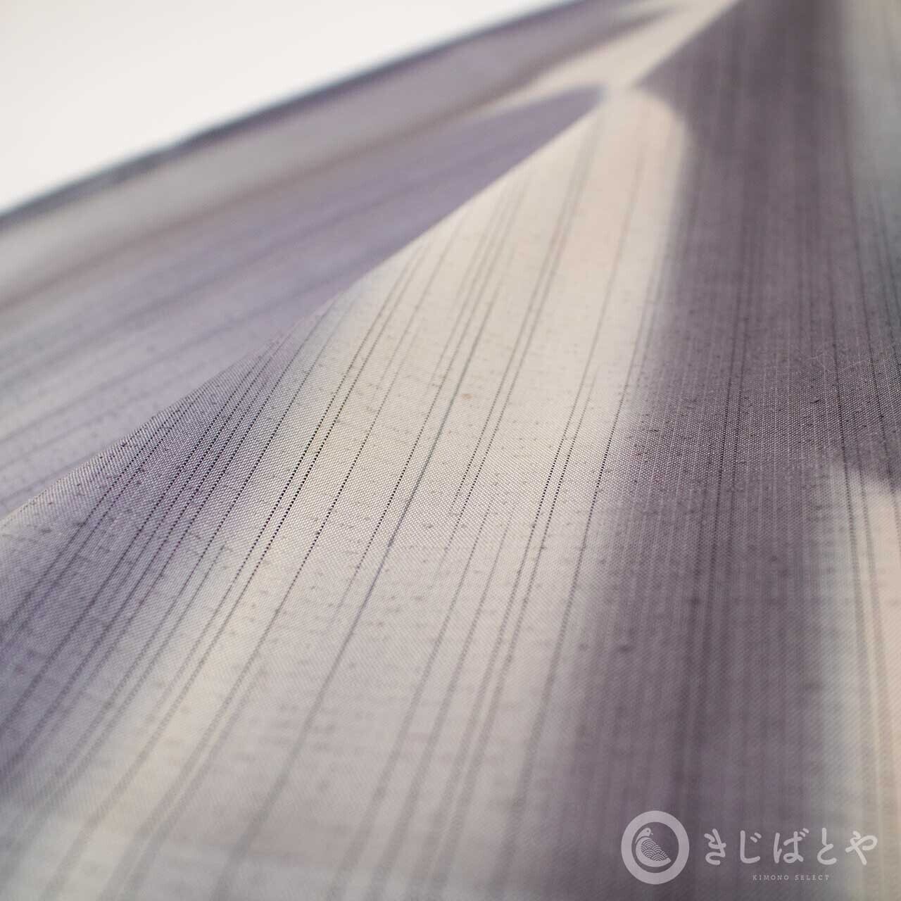 錫紵(しゃくじょ:青みの灰)、薄鈍(うすにび:青みの灰)、空色鼠(そらいろねず:青みの明るい灰)、月白(げっぱく:青みの白)と、青みがかった灰のぼかしで、白い矢羽根が美しく浮かび上がります。縦に流れる深い色の糸が表情を深くして、本当に美しいです。色というのは不思議なもので、ほんの少し使われている紫や深い緑の色を目が拾うので、地色自体にその色がなくても、表情や深みとして感じます。
