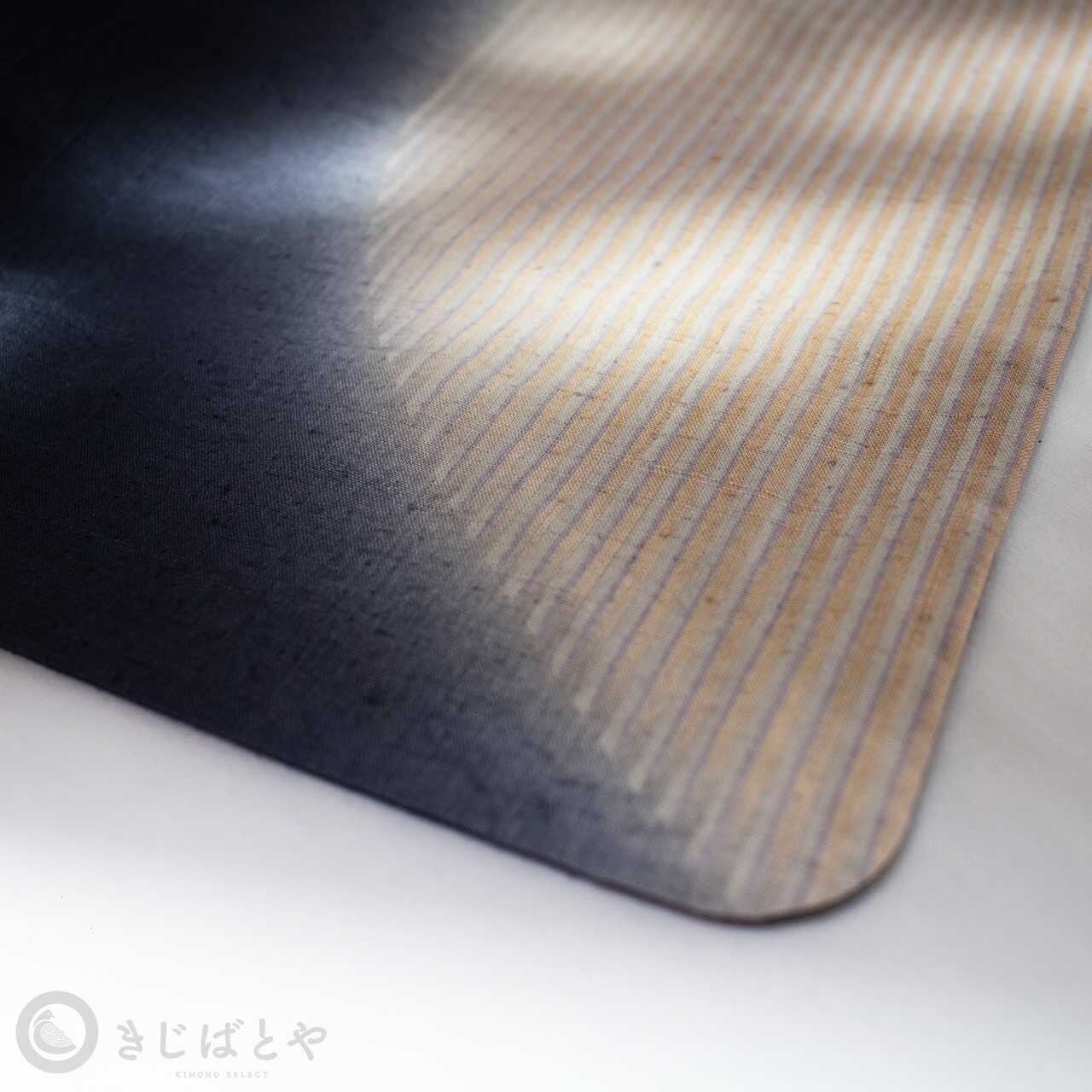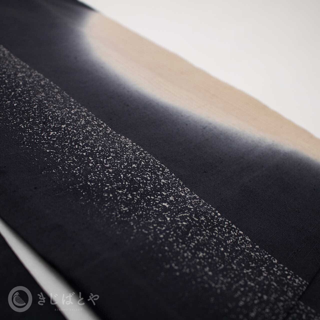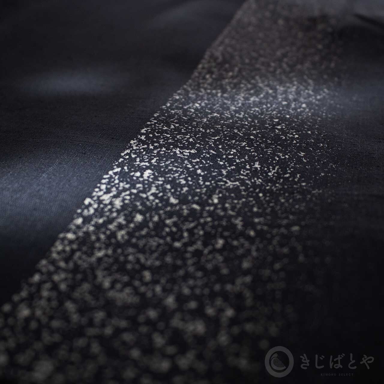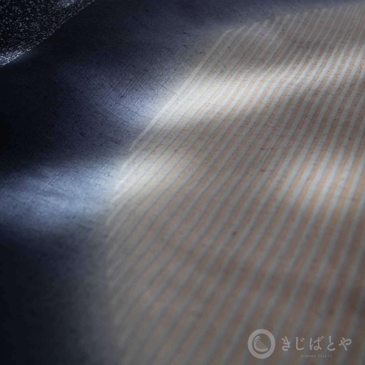 縦に流れるあられと、袖と裾に入った薄香(うすこう:淡く渋い橙)のぼかしが美しいアクセントになっています。薄香の中には縦にはしる淡いブルーグレーの縞があるのですが、陰影のおかげで発光するように見え、なんとも不思議な美しさがあります。