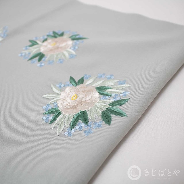 こちらは宝石のアマゾナイト(和名:天河石)を思わせる色みで、青磁も薄墨もよくつかわれる色ではありますが、地模様のせいか丹後ちりめんの光の反射のせいか少し白みがかって見え、見た瞬間に、アマゾナイトの色を思いました。