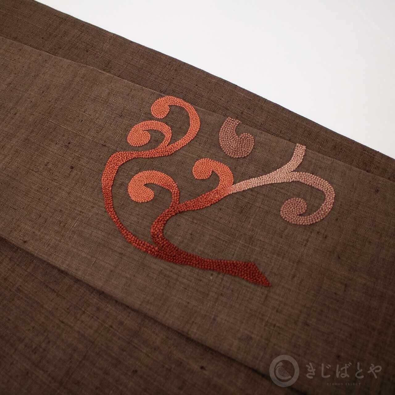 地は燻色(ふすべいろ:深く渋い橙)が近いでしょうか。深く渋みのある焦げ茶に、うすく灰をかけたような色・・・というと近いでしょうか。紬の風合いのおかげで、地には陰影があり、そこに美しい和の色で相良刺繍がほどこされています。色の濃淡と刺繍の立体的な陰影がとても美しく、見ていて飽きることがありません。