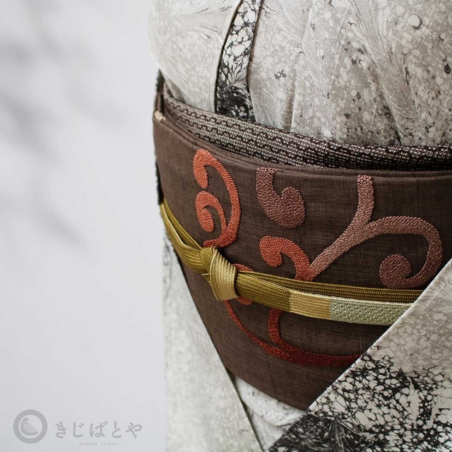 ざっくりしすぎていない紬の上品ななごやはとても使いやすいです。こちらの帯のような質感と色柄でしたら大島や結城などに合わせてもバランスがとれますので、重宝するかと思います。