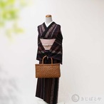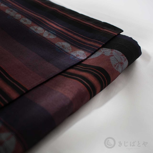 地は褐色(かちいろ:深く渋い紫)、深紫(ふかきむらさき:深く渋い紫)、二人静(ふたりしずか:深く渋い紅紫)、蘇芳(すおう:強い赤)の縞で、蘇芳の中に薄鈍(うすにび:青みの灰)の蜘蛛絞りがほどこされています。