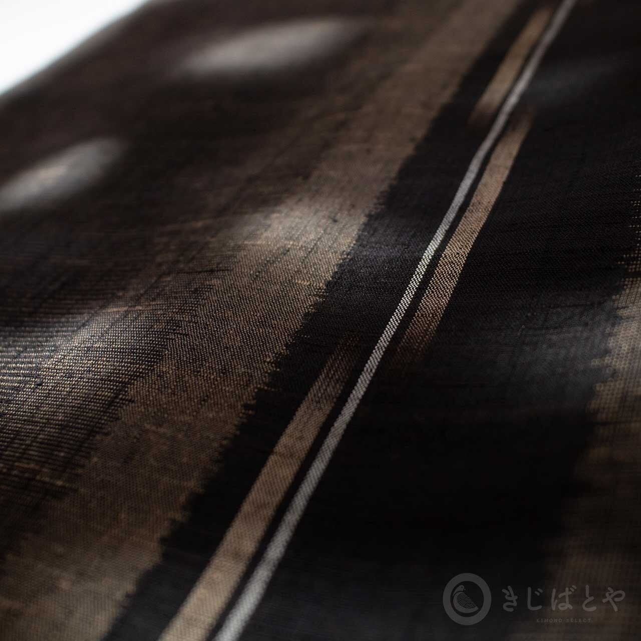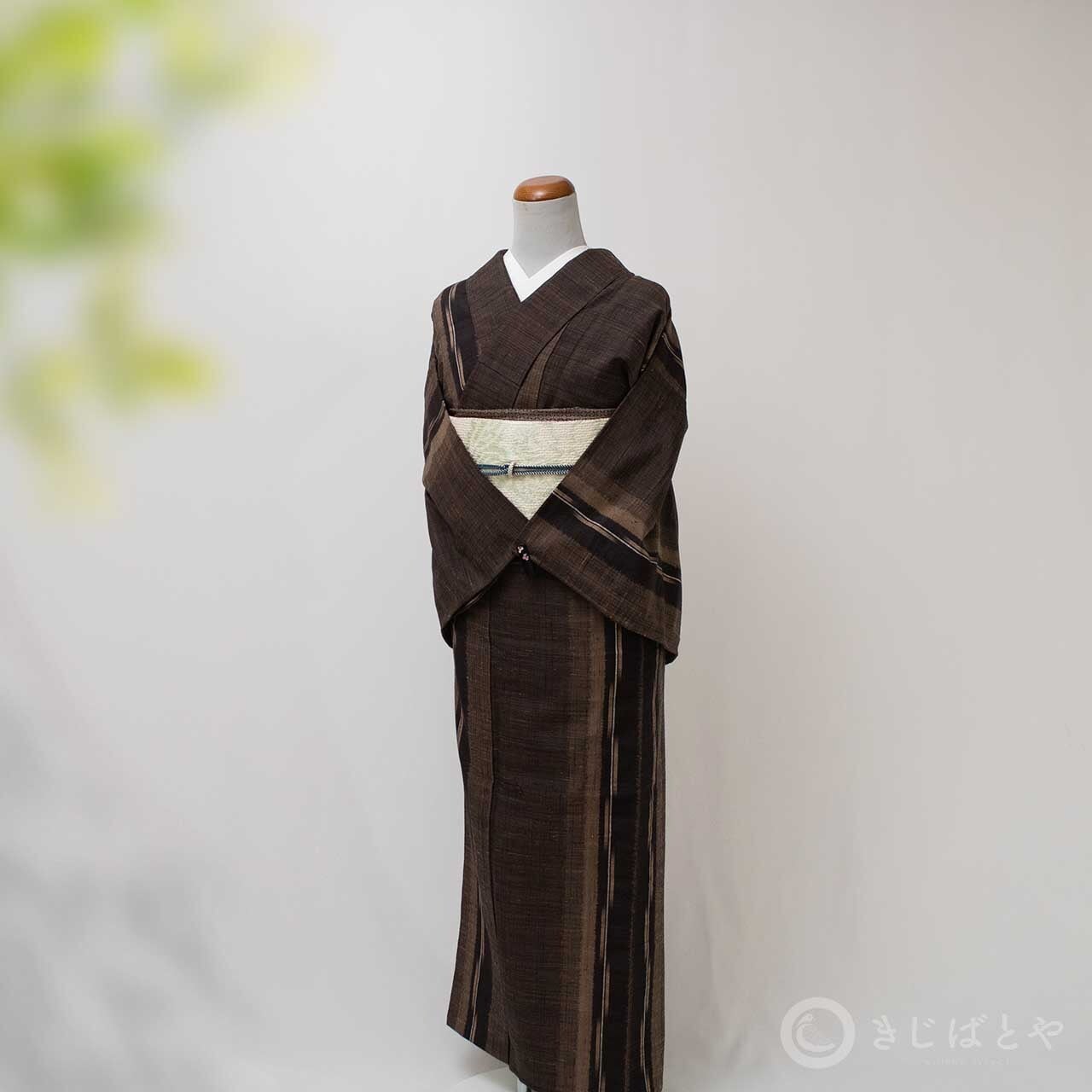 地は暗鳶色(あんとびいろ:赤みの黒)で、和の色事典では「黒に近い、かすかに赤みがかった黒」とされています。暗鳶色と鳶色(とびいろ:深く渋い赤)の縞の濃淡が美しく、紬の風合いがさらに表情深く、シンプルなようでなんとも味わい深いお着物です。