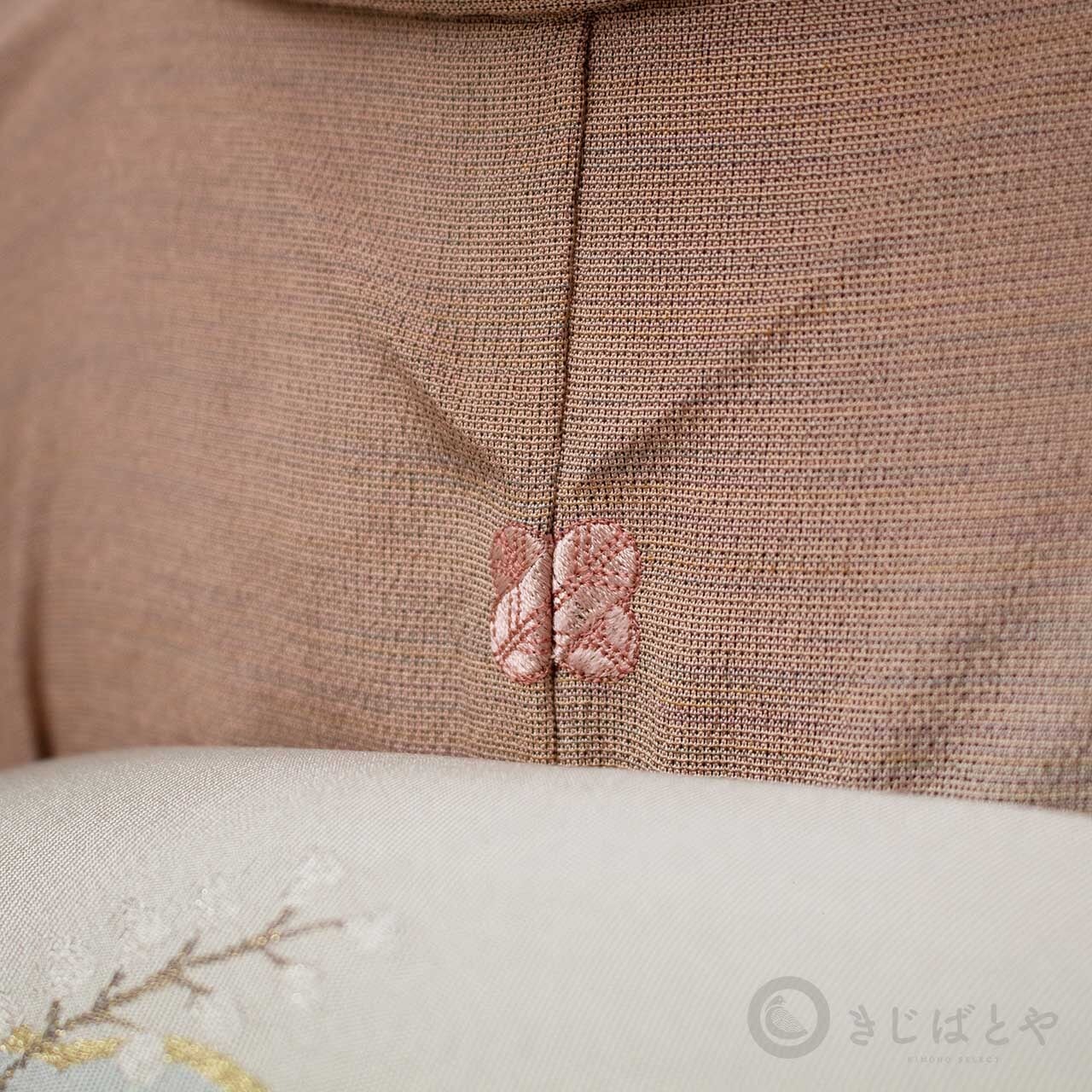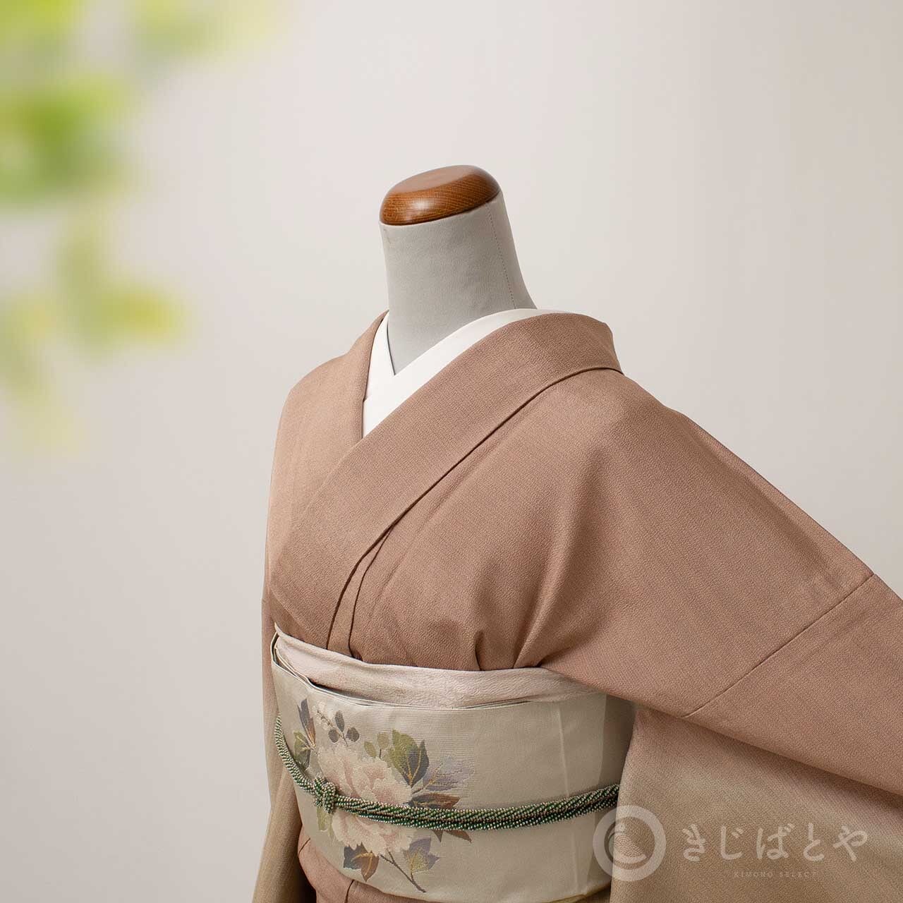 嵯峨鼠はやわらかでやさしい色みですが、それを裾の薄黒が引き締めてくれ、袖の丁子煤竹が明るさを加え、なんとも絶妙なバランスの色づかいです。