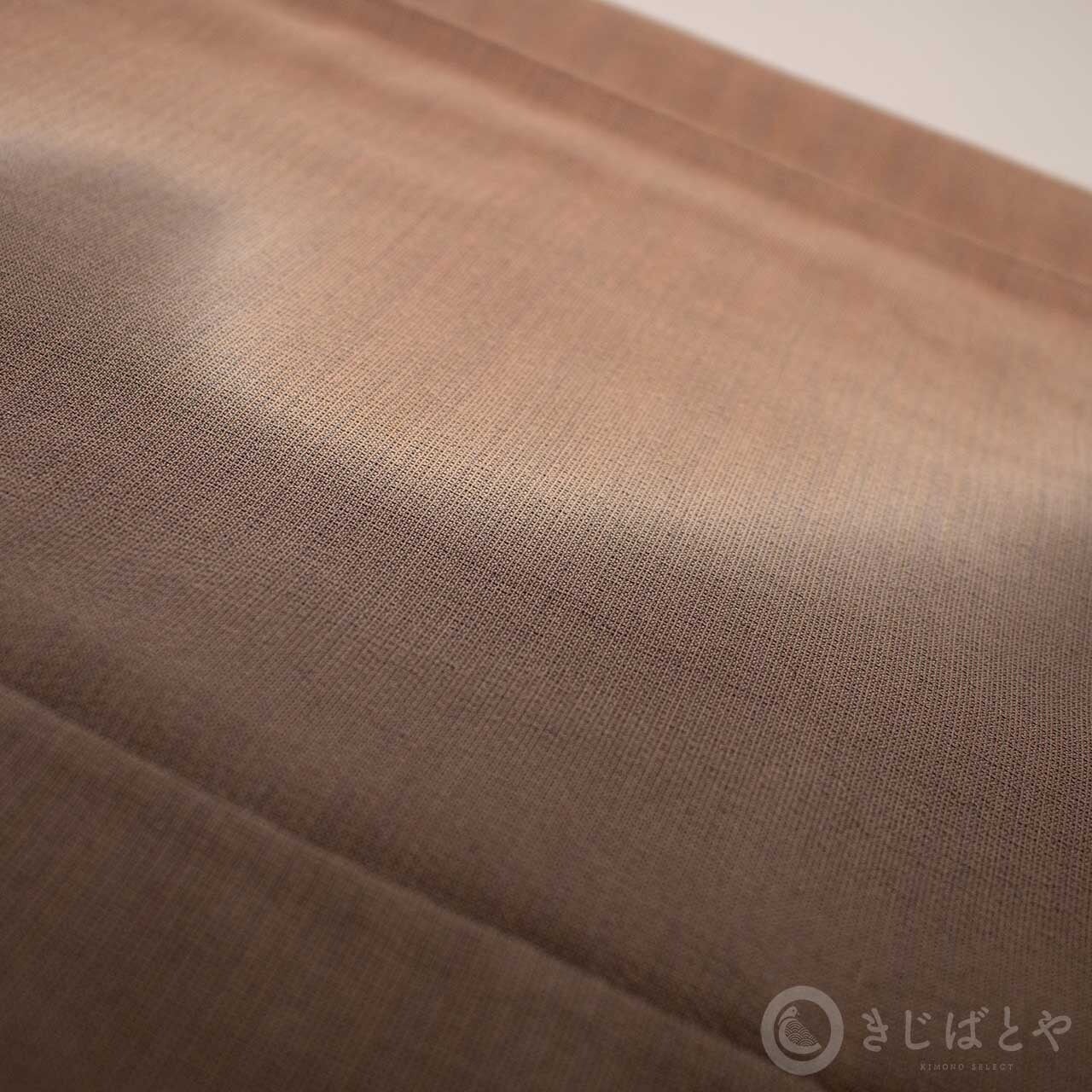 地は嵯峨鼠(さがねず:赤みの灰)で、裾には薄黒(うすぐろ:暗い灰)、袖と後ろの裾には丁子煤竹(ちょうじすすたけ:明るく渋い橙)のぼかしが入っています。