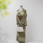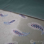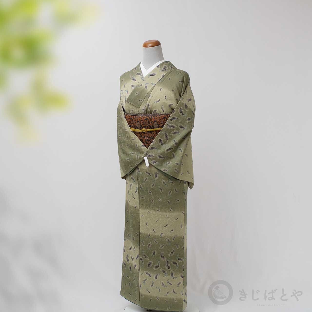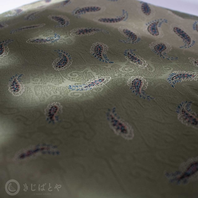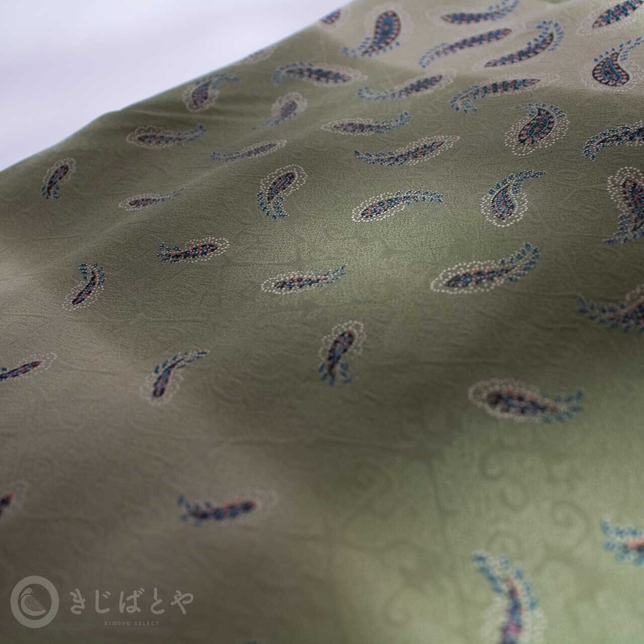 地は柳煤竹(やなぎすすたけ:深く渋い黄緑)と裏柳(うらやなぎ:明るく渋い黄)の市松ぼかしで、ペイズリーのとび柄があしらわれています。