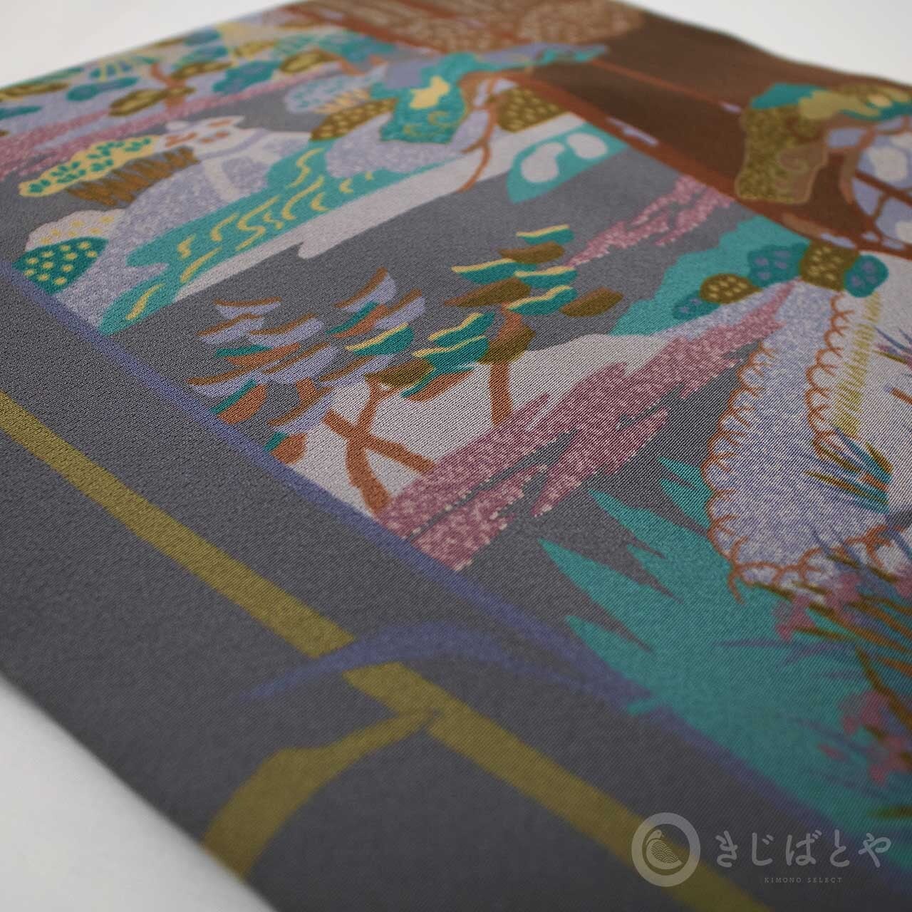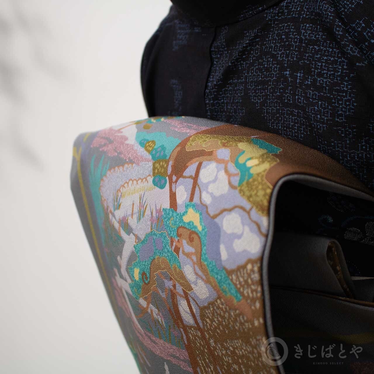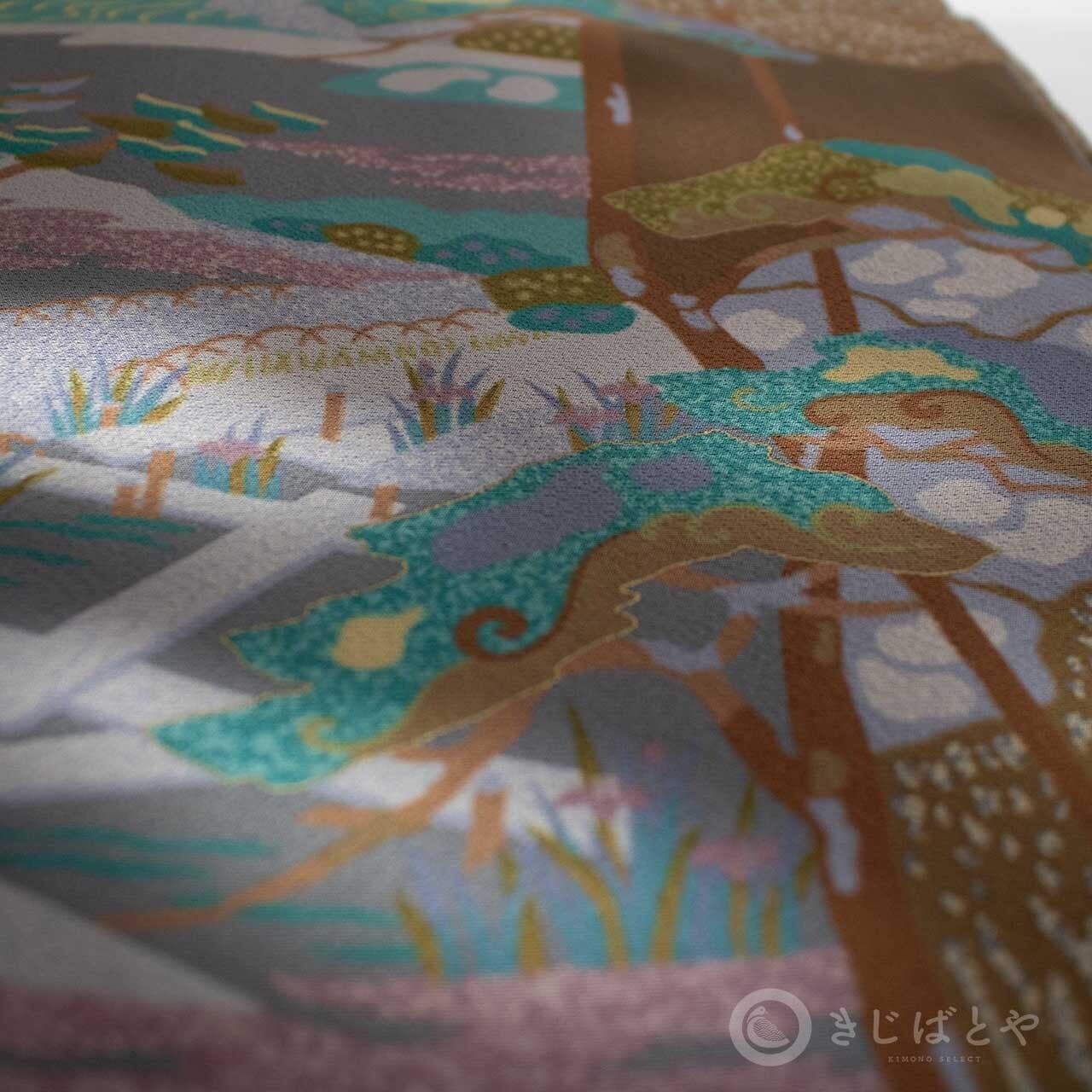地は具墨色(ぐずみいろ:青みの暗い灰)で、網干、灯篭、季節の木々や花々が染められています。多くの色柄が入っていますが、全体にうすく灰がかかったような色みなのでやさしく馴染んでいて、その中から白銀色や孔雀色などの強い色がほどよくアクセントとして浮かび上がり、絶妙なバランスで調和しています。