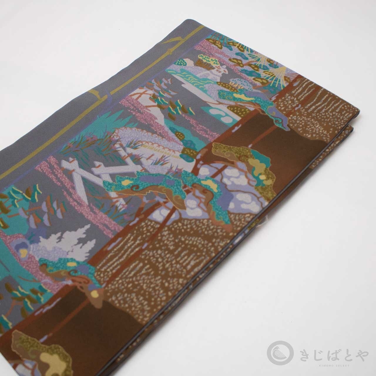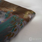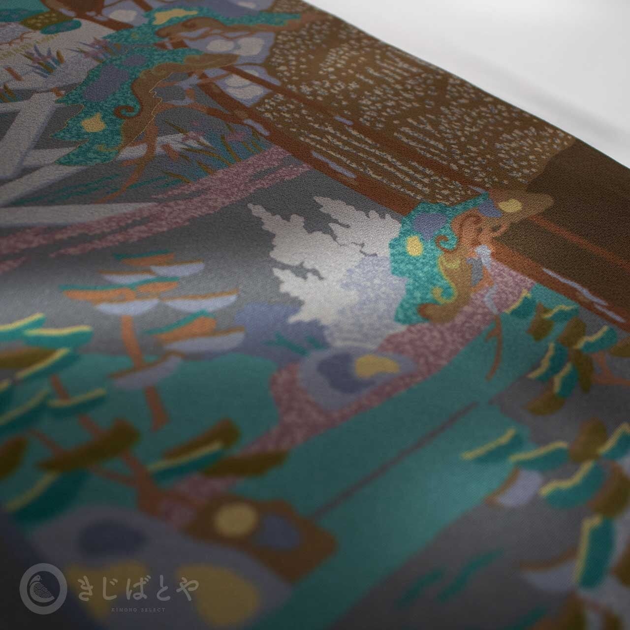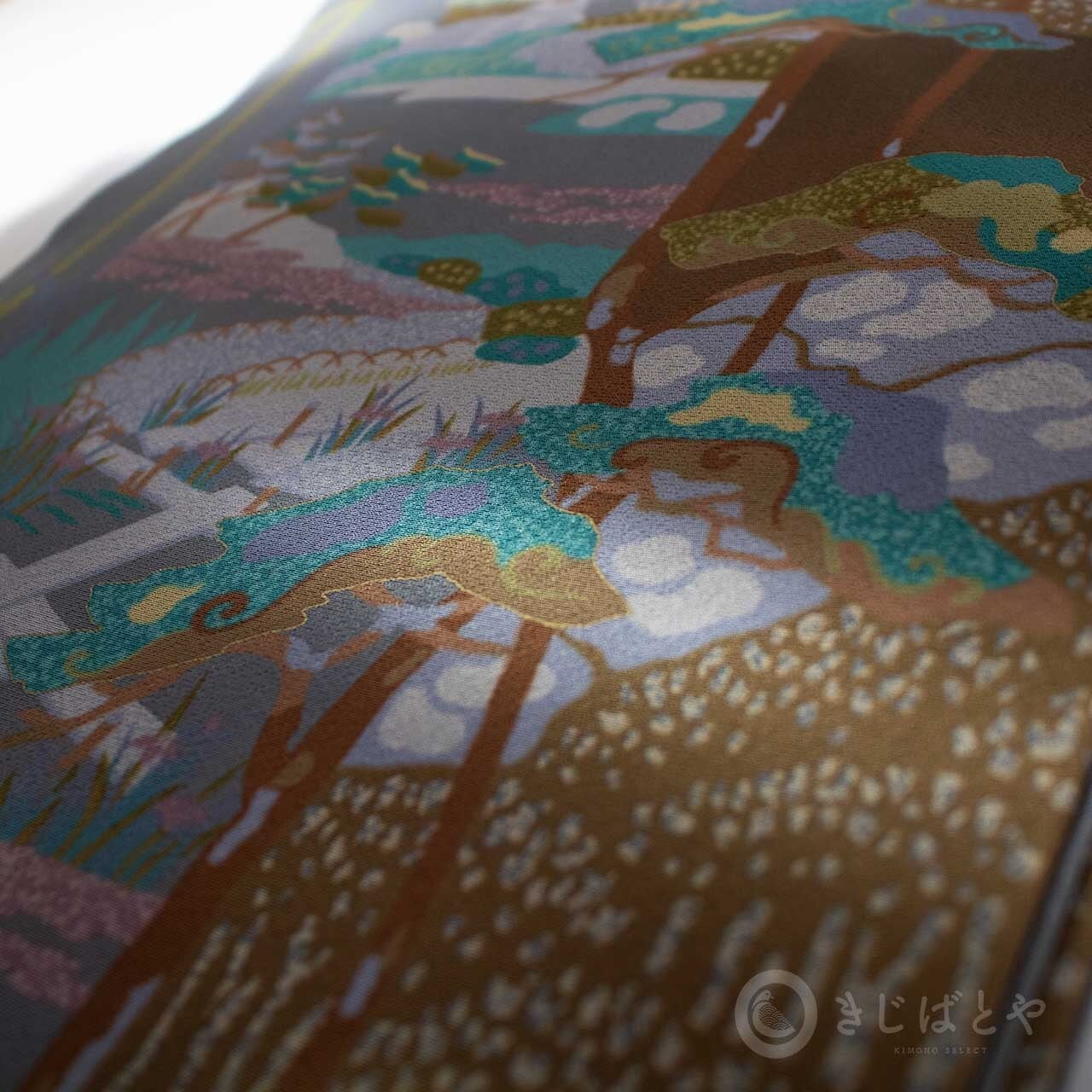 地は具墨色(ぐずみいろ:青みの暗い灰)で、網干、灯篭、季節の木々や花々が染められています。多くの色柄が入っていますが、全体にうすく灰がかかったような色みなのでやさしく馴染んでいて、その中から白銀色や孔雀色などの強い色がほどよくアクセントとして浮かび上がり、絶妙なバランスで調和しています。