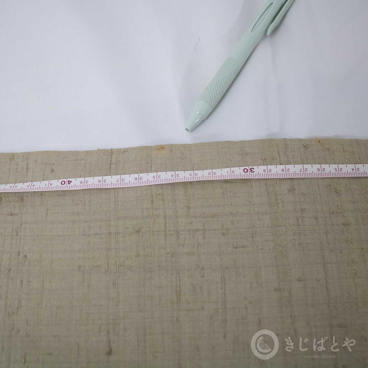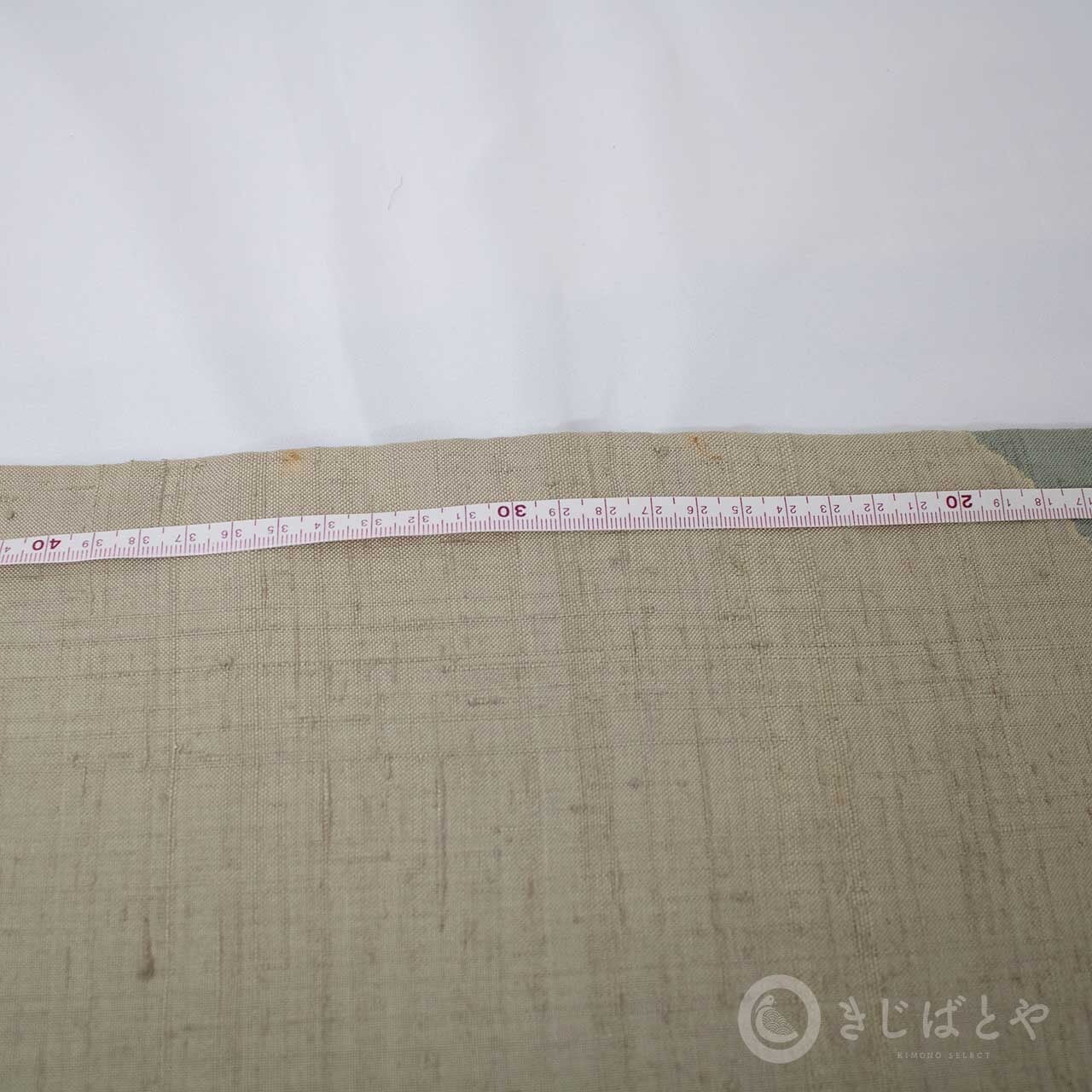 帯の裏、たれ先から25センチと35センチほどのところに、小さなしみがあります。アクが出ているのか、あるいは一緒に保管されていた帯や着物から移ったしみなのかは分かりませんが、裏のみなので着用に支障はありません。
