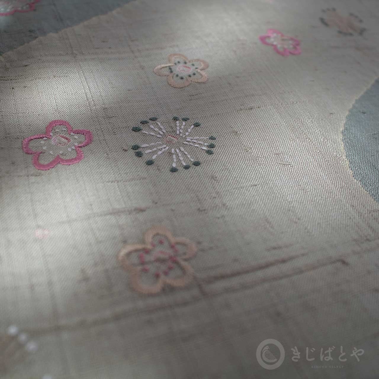 ほどよく上品で、ほどよく気軽で。落ち着いた色みの中にかわいらしい色で小さな刺繍が散りばめられており、落ち着いた中にかわいらしさがあり、年齢を重ねても楽しめる帯です。