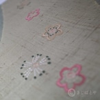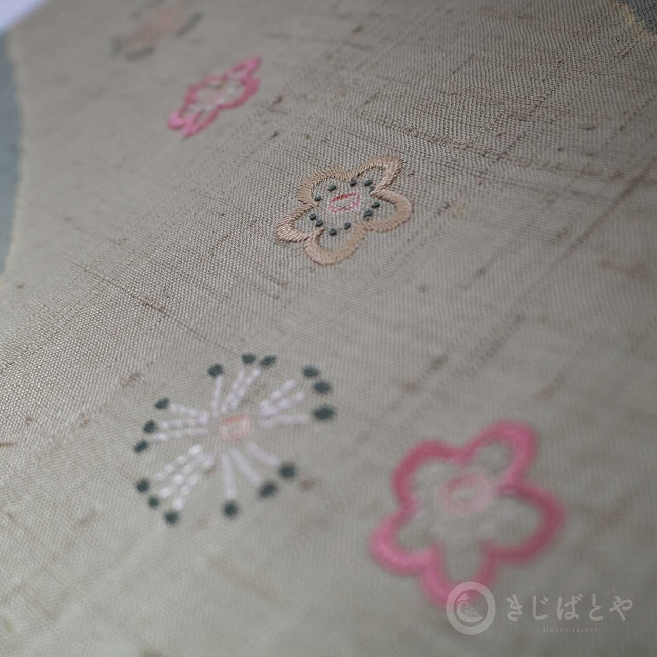 地は浅青朽葉(うすあおくちば:明るく渋い黄)と利休鼠(りきゅうねず:緑みの灰)に染めわけられており、そこに小さな花をかたどった刺繍がほどこされています。