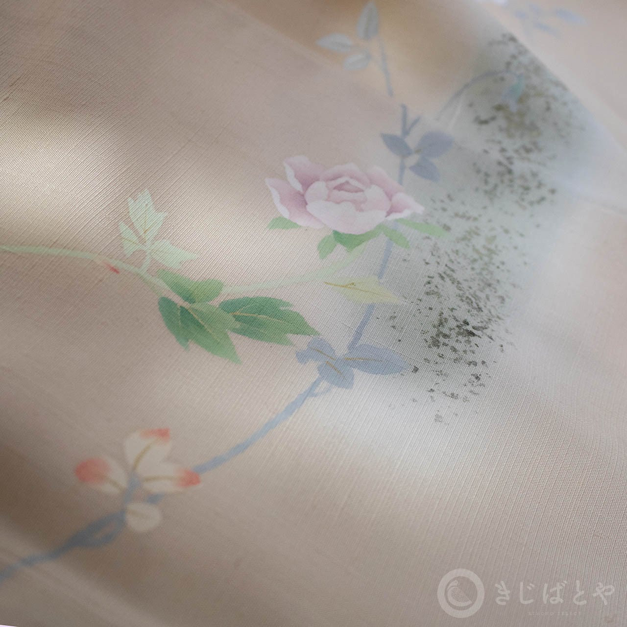 地は尾花色(おばないろ:橙みの白)で、やわらかな地に芍薬と薔薇でしょうか、花の柄があしらわれています。柄ゆきは華やかなのですが、やわらかで淡い色みなので派手派手しくなく、ほどよい華やかさと上品さで、とても着やすいです。