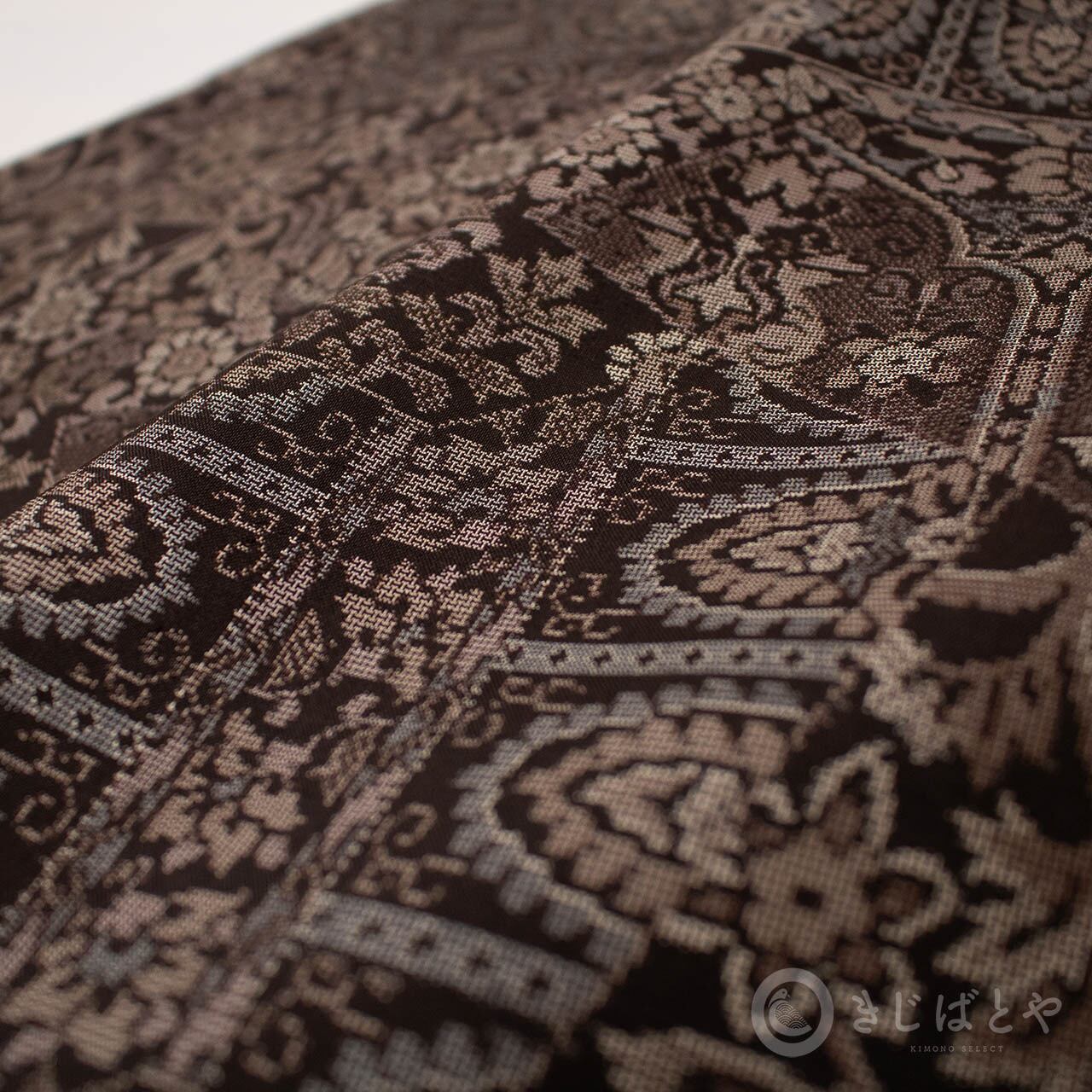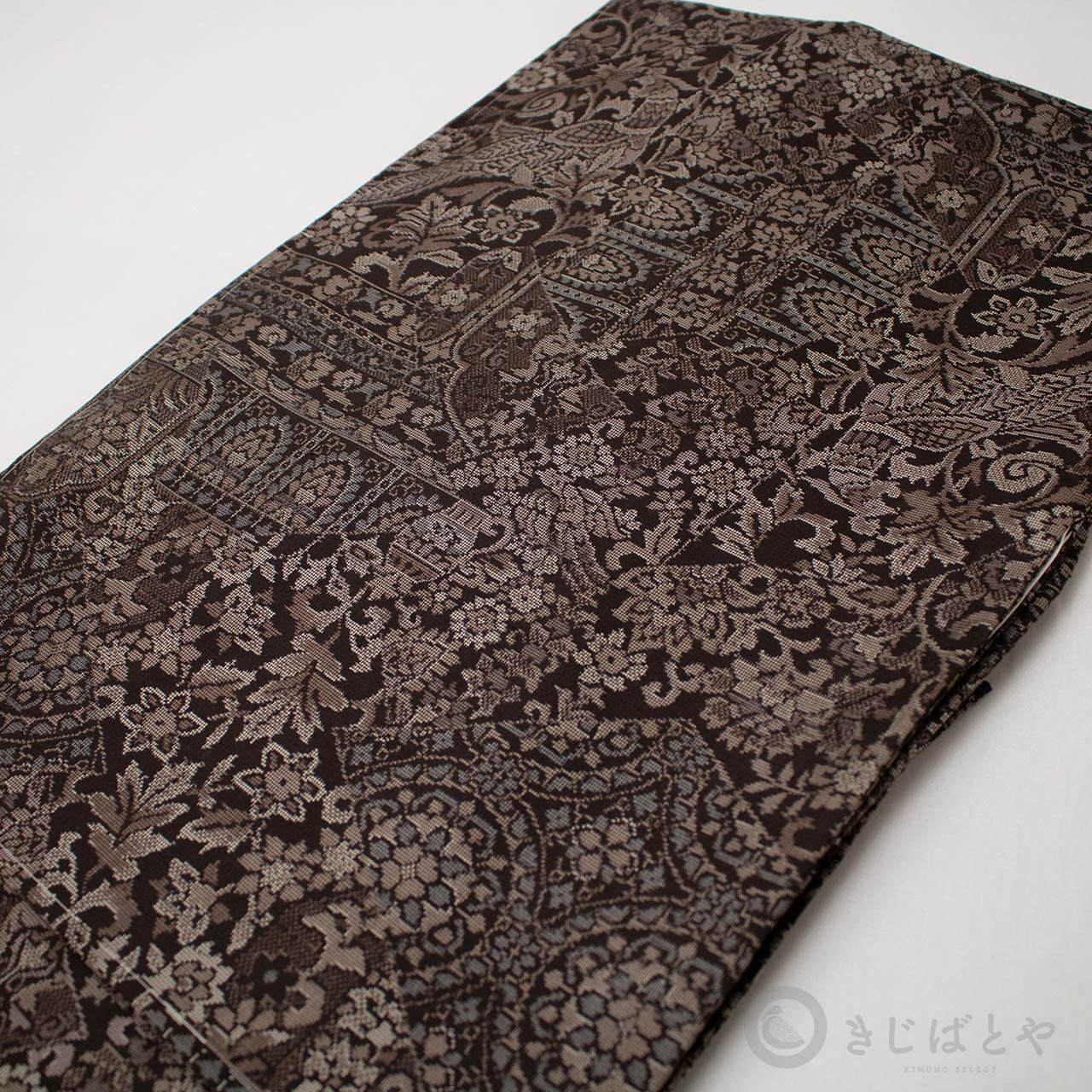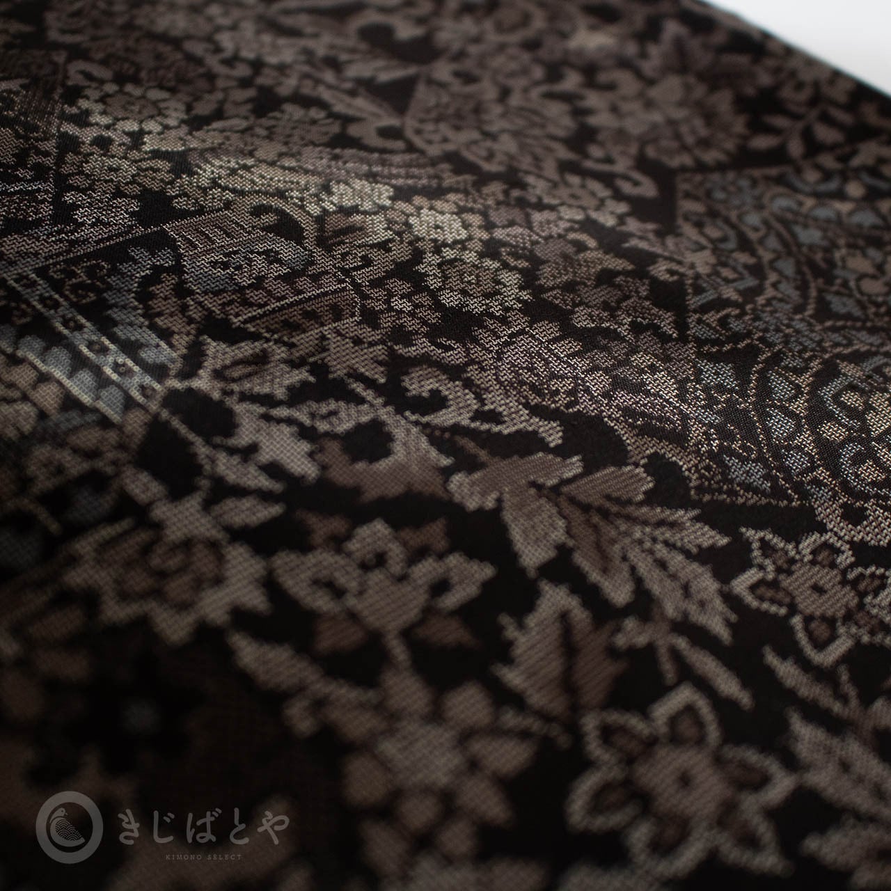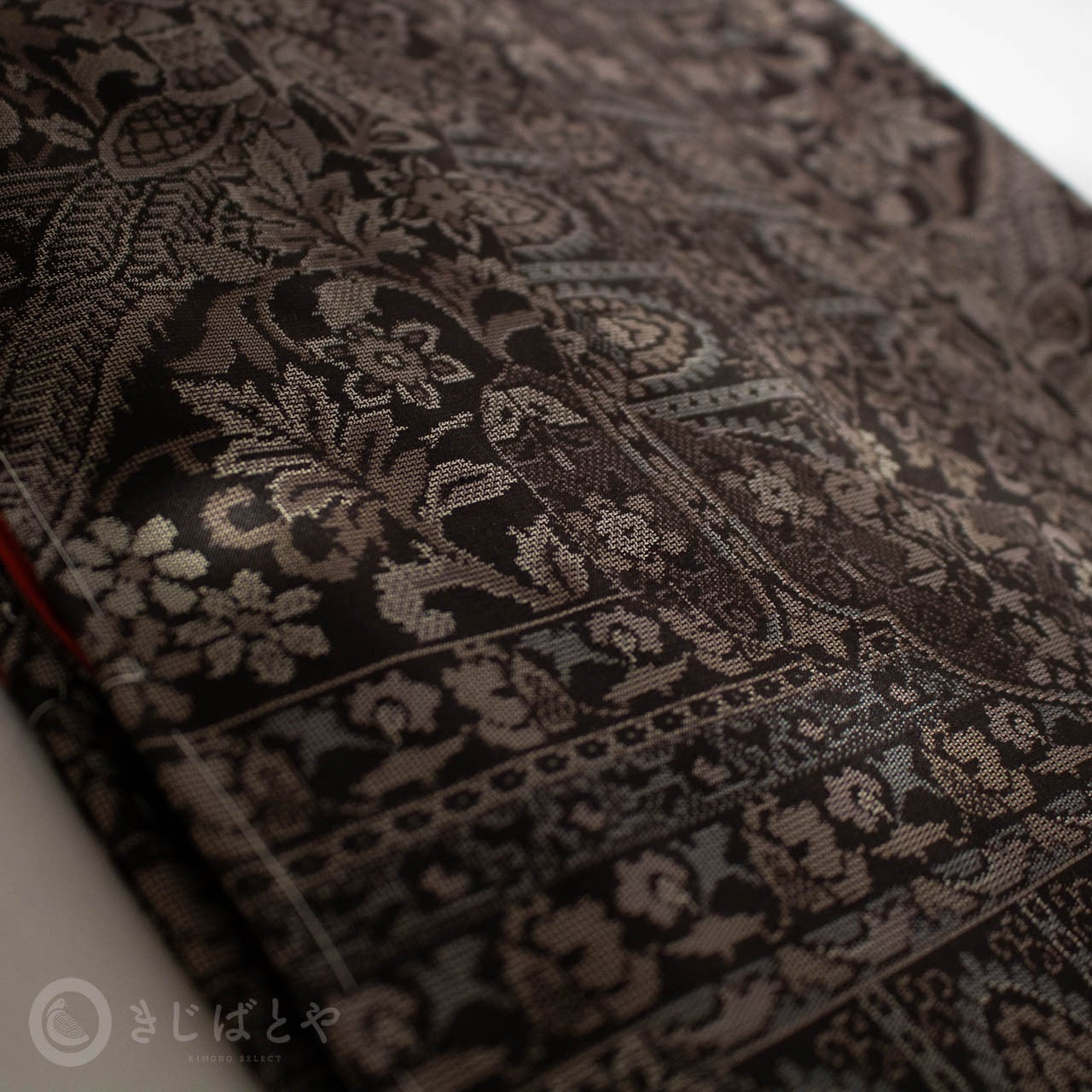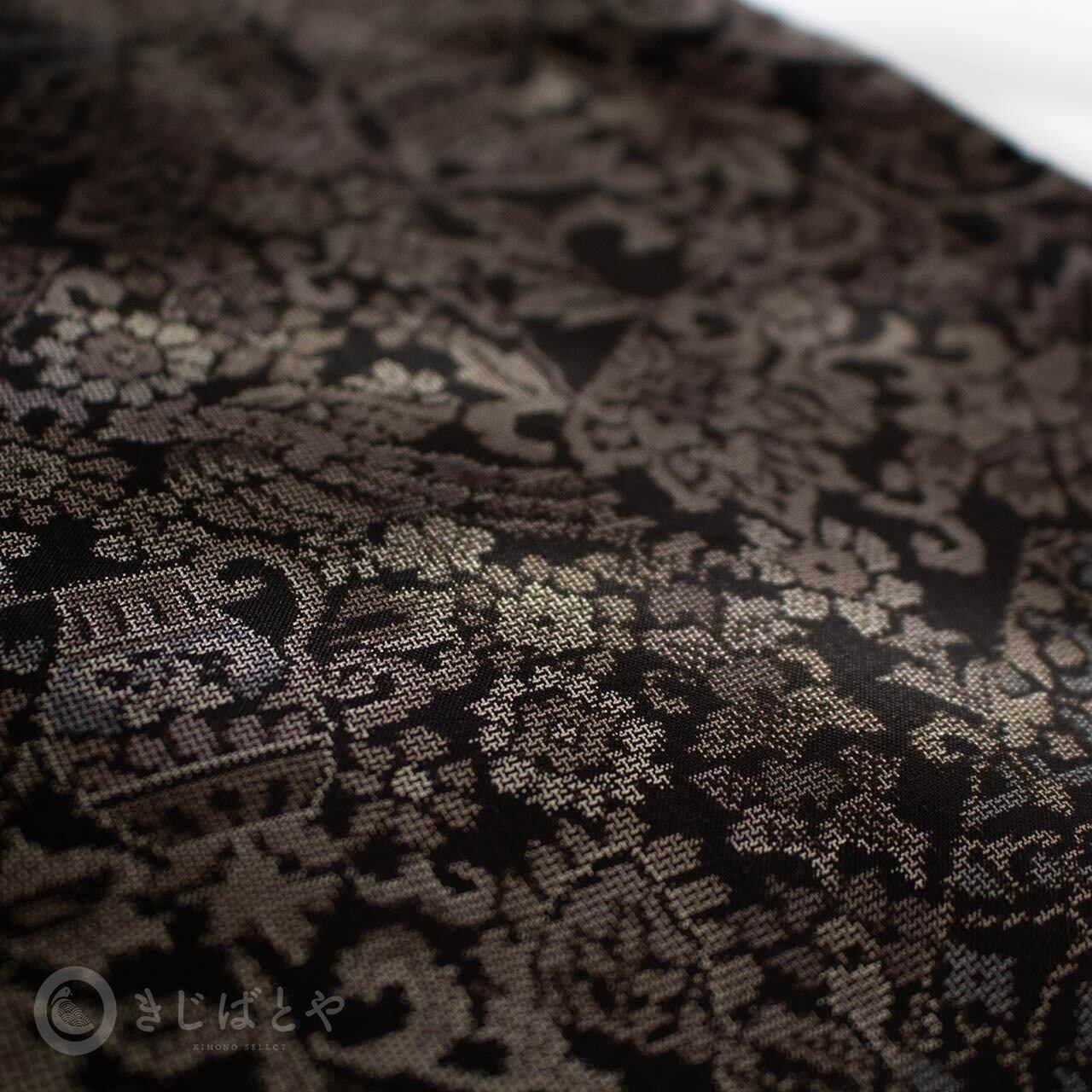 地は漆黒で、渋い茶系で花鳥の柄が織られています。ところどころに入る青が美しく浮かび上がり、なんともいえず美しいです。