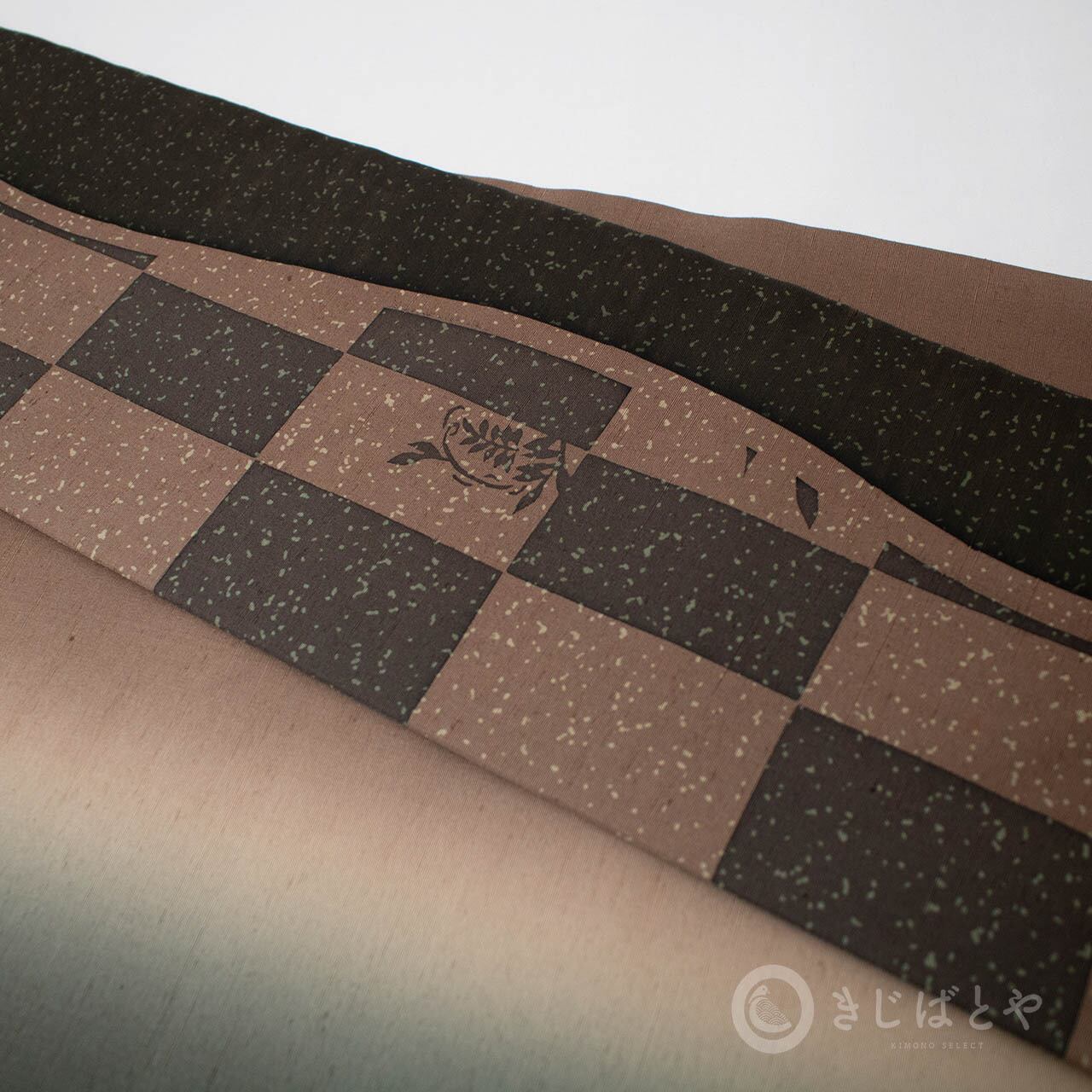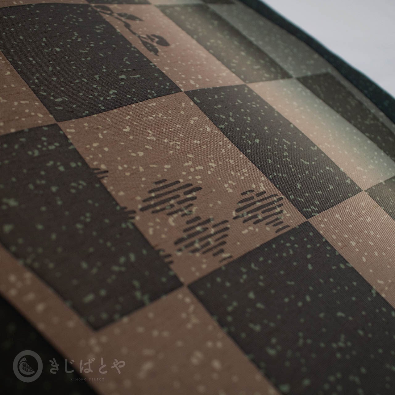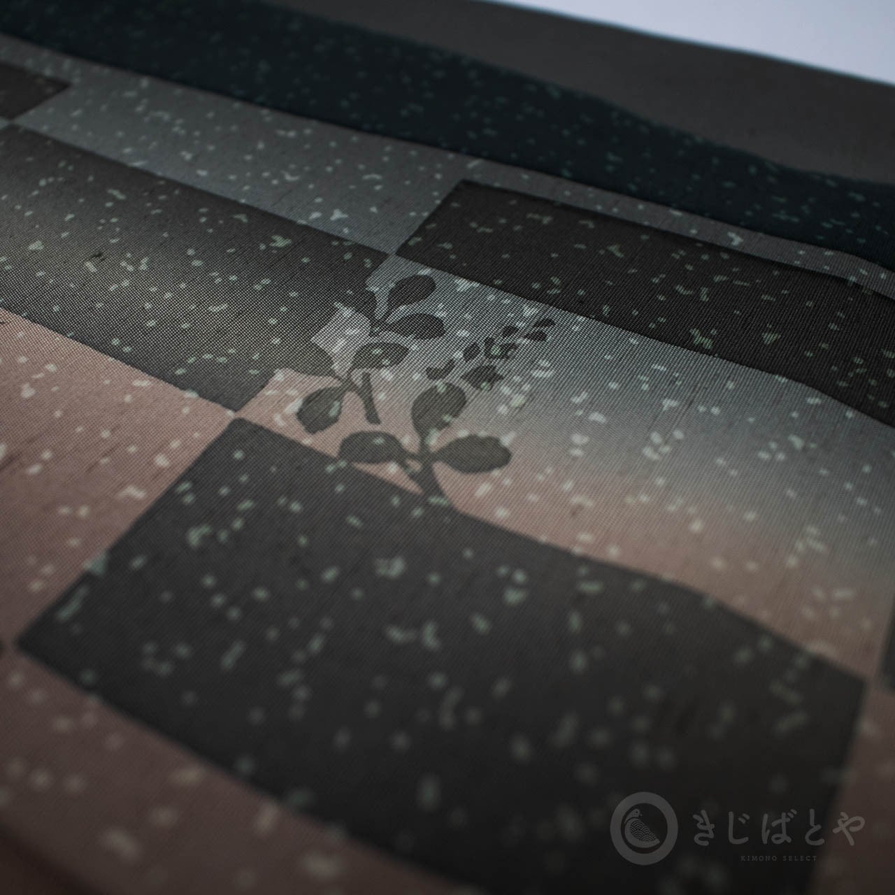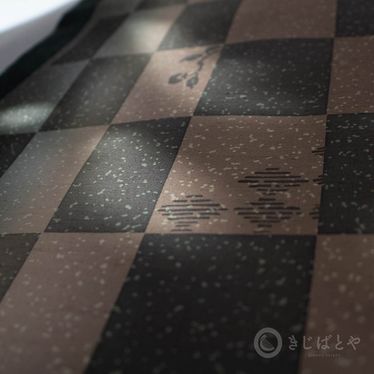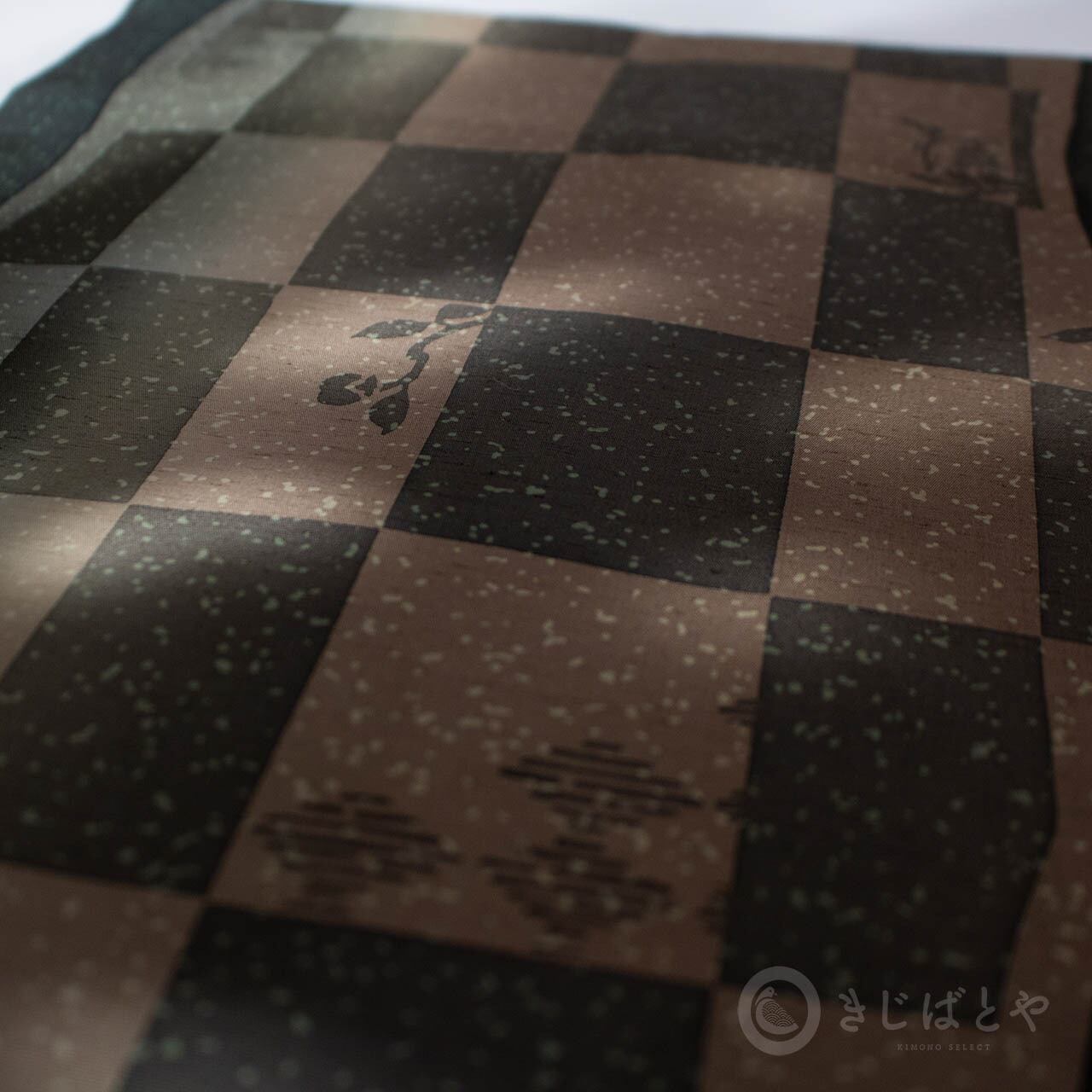 地は黒橡(くろつるばみ:緑みの黒)で、唐茶(からちゃ:深く渋い橙)と青柳鼠(あおやぎねず:黄緑みの灰)で市松が染められています。画像でご覧いただけますが、淡い青柳鼠のあられが全体に散っていて、光のあたり具合や着る人の動きにより、それが淡く浮かび上がって複雑な表情をつくってくれます。