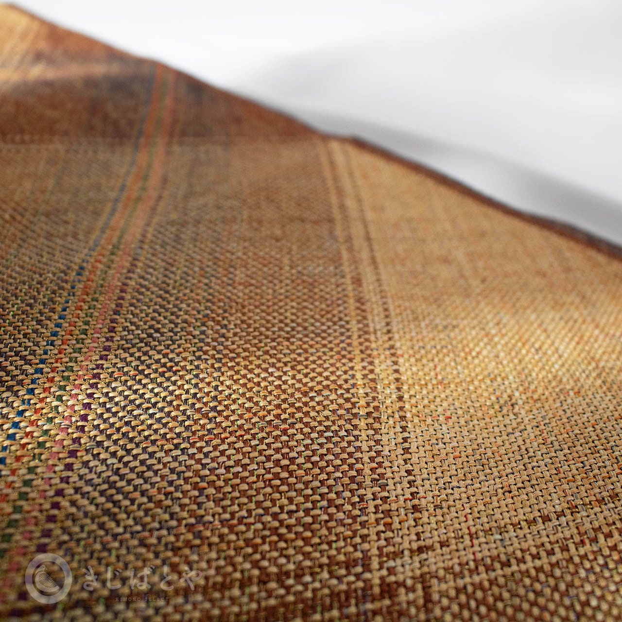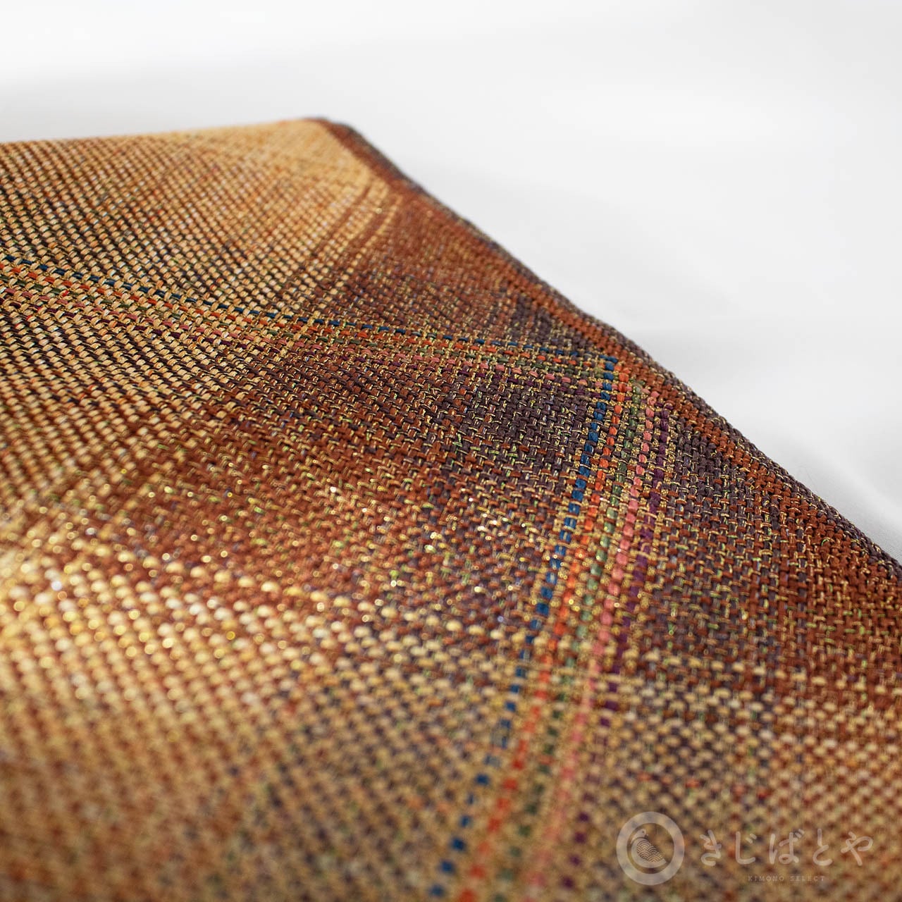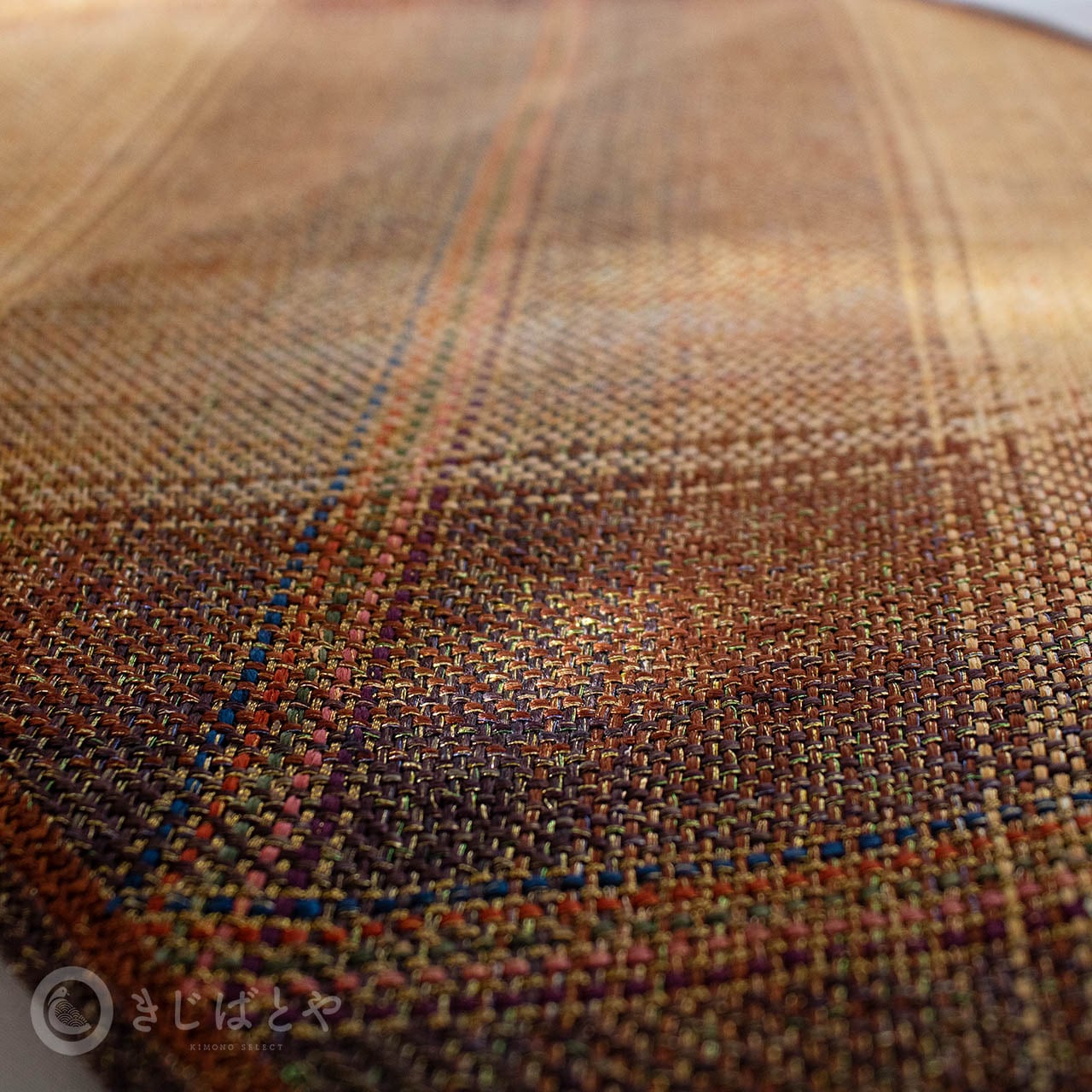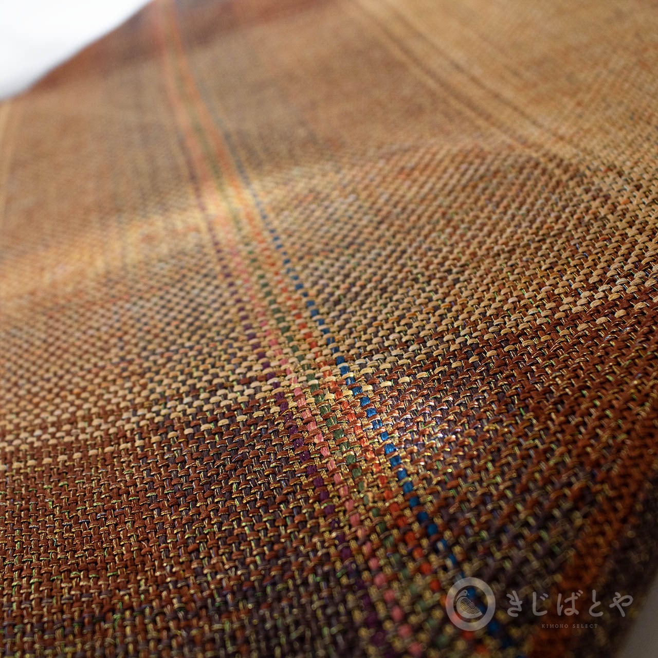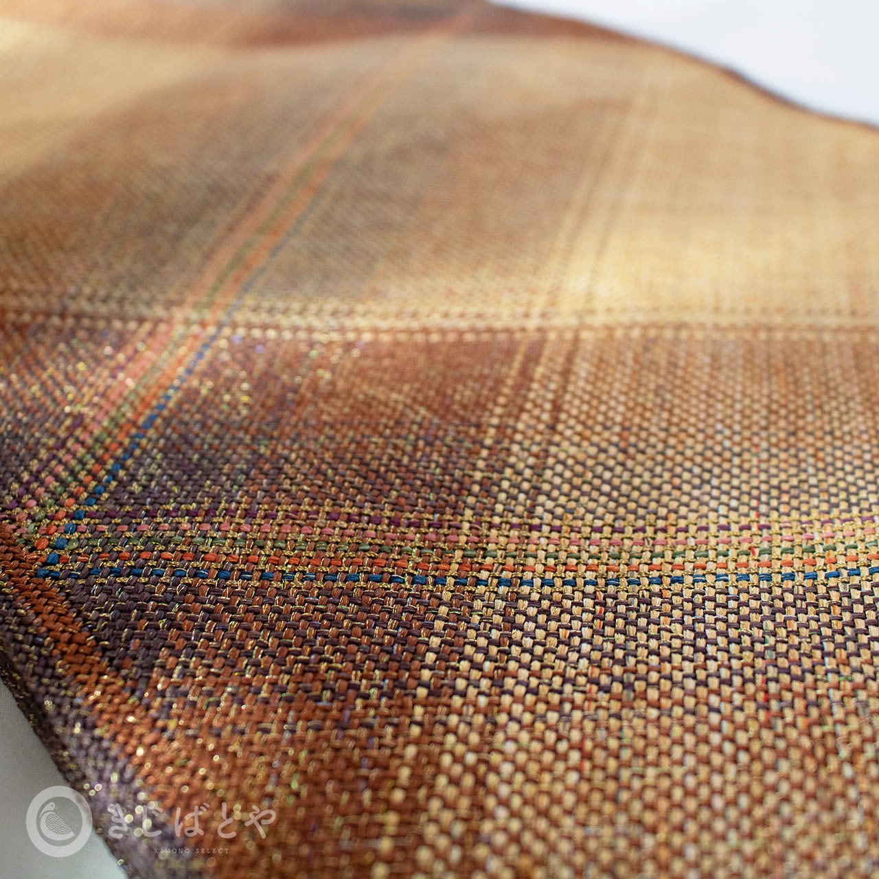 一見、茶系の合わせやすい帯かなと思うのですが、実際は茶の糸で織られているわけではなく、深い紫や至極、孔雀色に青磁、深紅に鴇色・・・などなど、数え切れない色によって構成された色なので、とても表情豊かで、見ていて飽きることがありません。
