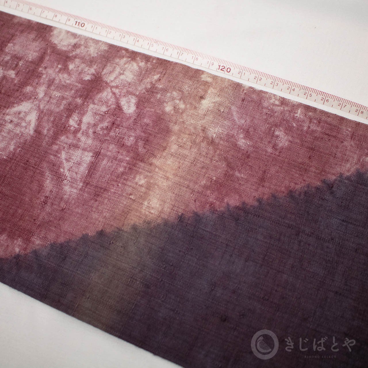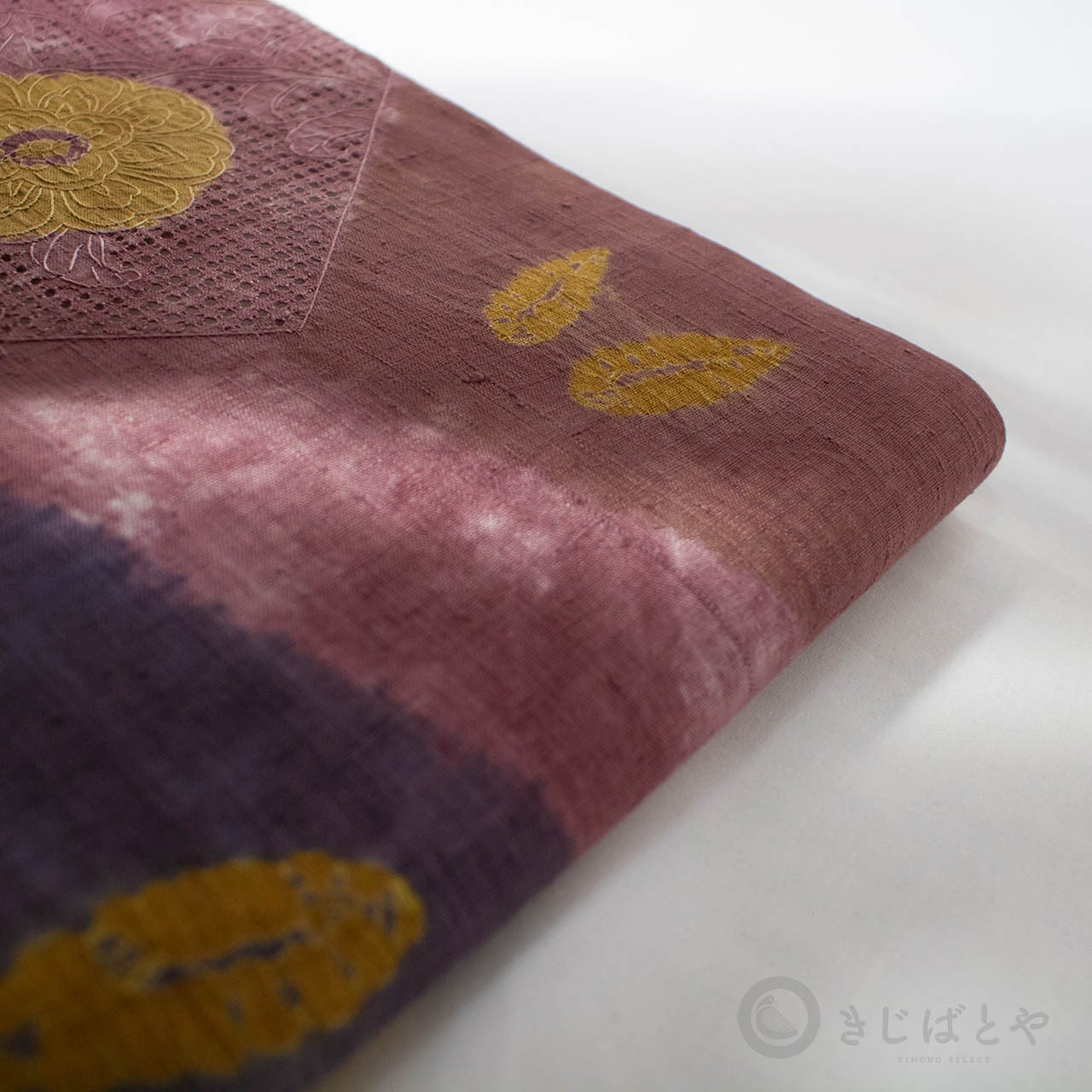 ドローンワークと刺繍もほどこされており、染めの濃淡と刺繍とで、なんとも表情豊かな帯になっています。