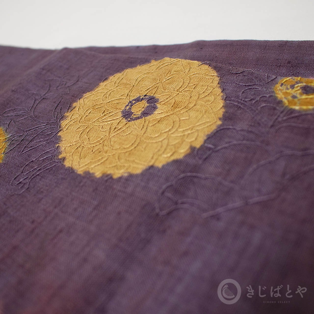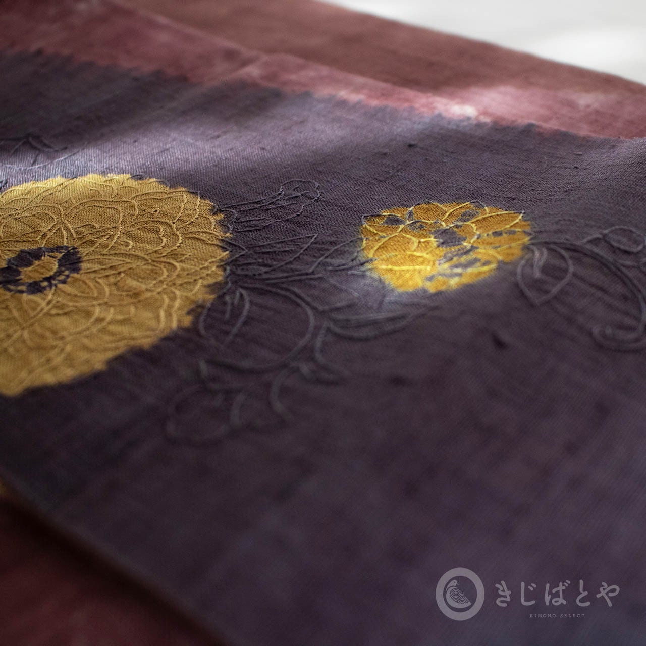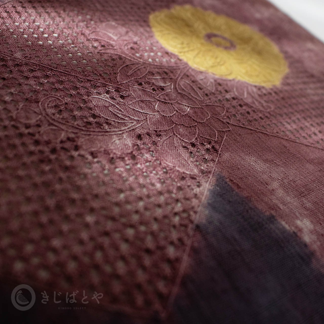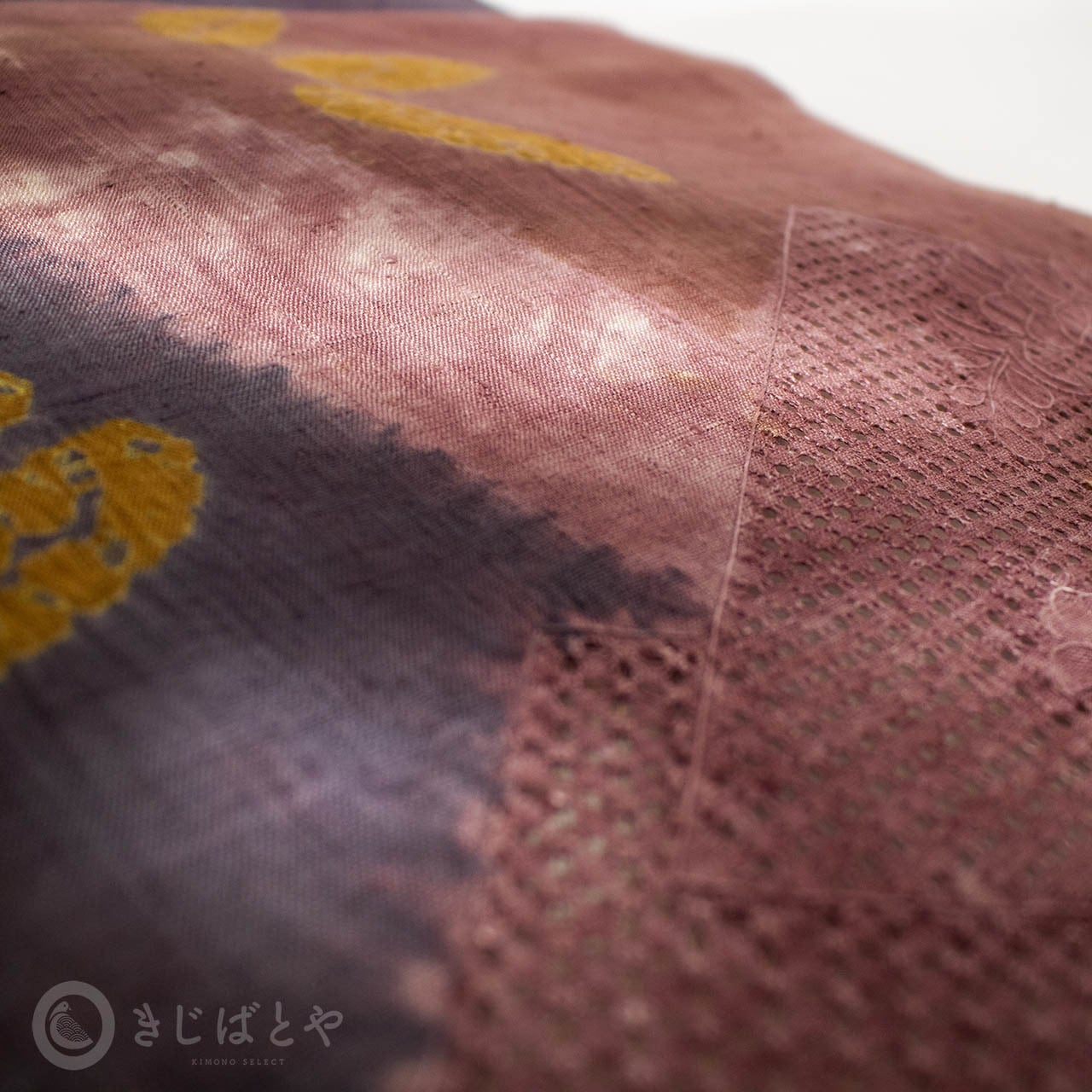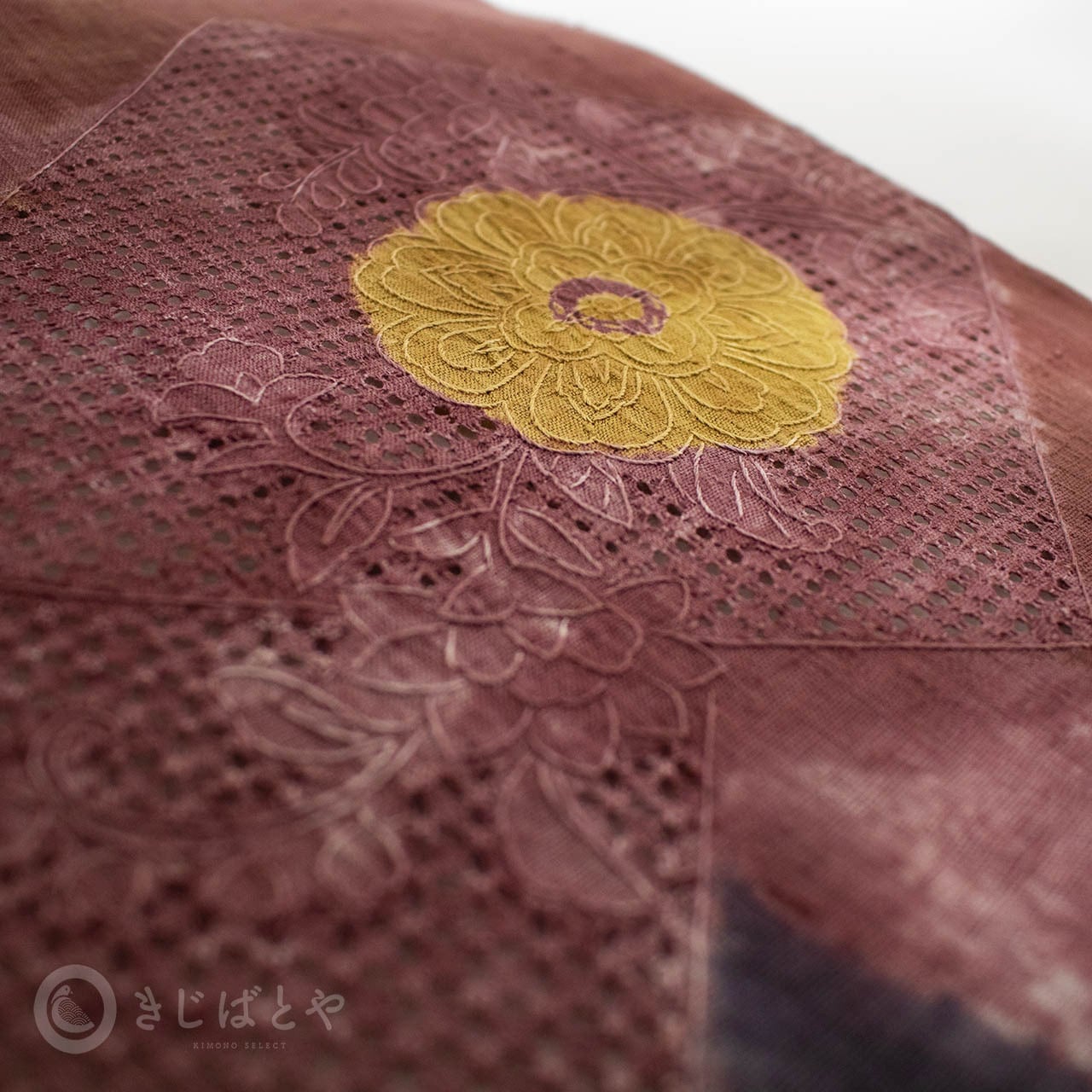 地は葡萄酒色(ぶどうしゅいろ:深く渋い紅)と葡萄鼠(ぶどうねず:深く渋い紫)で、絞りの濃淡の風合いもあり、まさに葡萄酒を思わせる色みです。