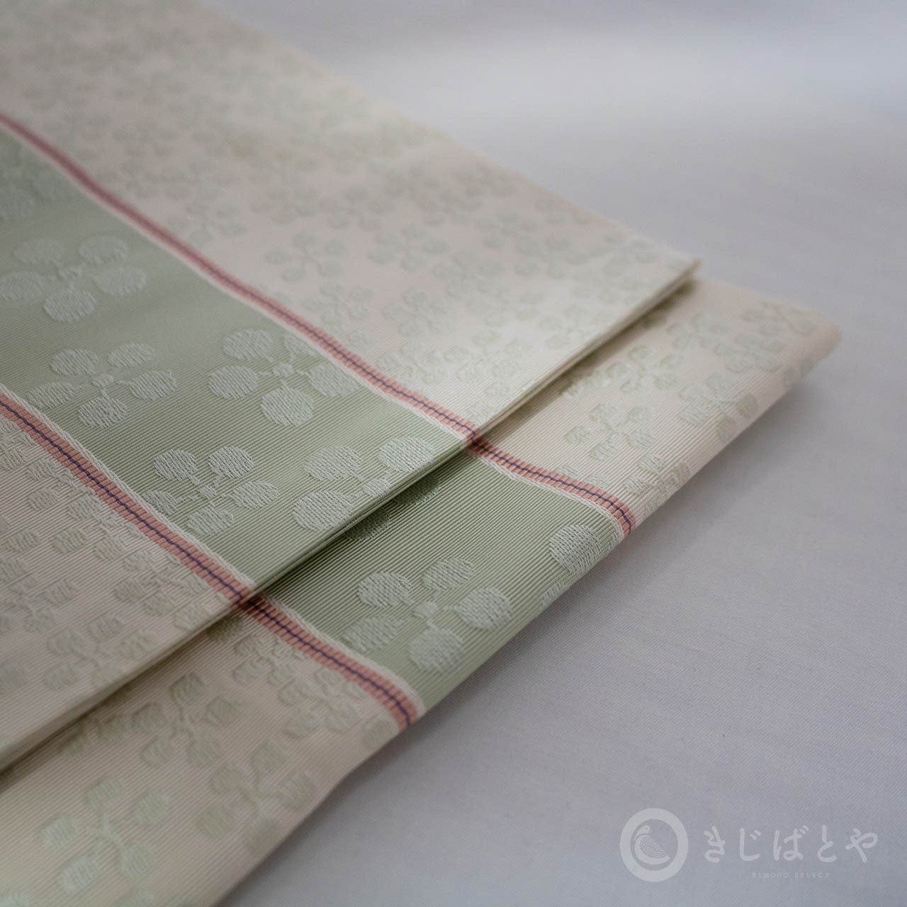淡い色の中に鴇色(ときいろ:明るい赤)の細い線が入ることで、それぞれの色が引き立ち、優しさとやわらかさが加わっています。