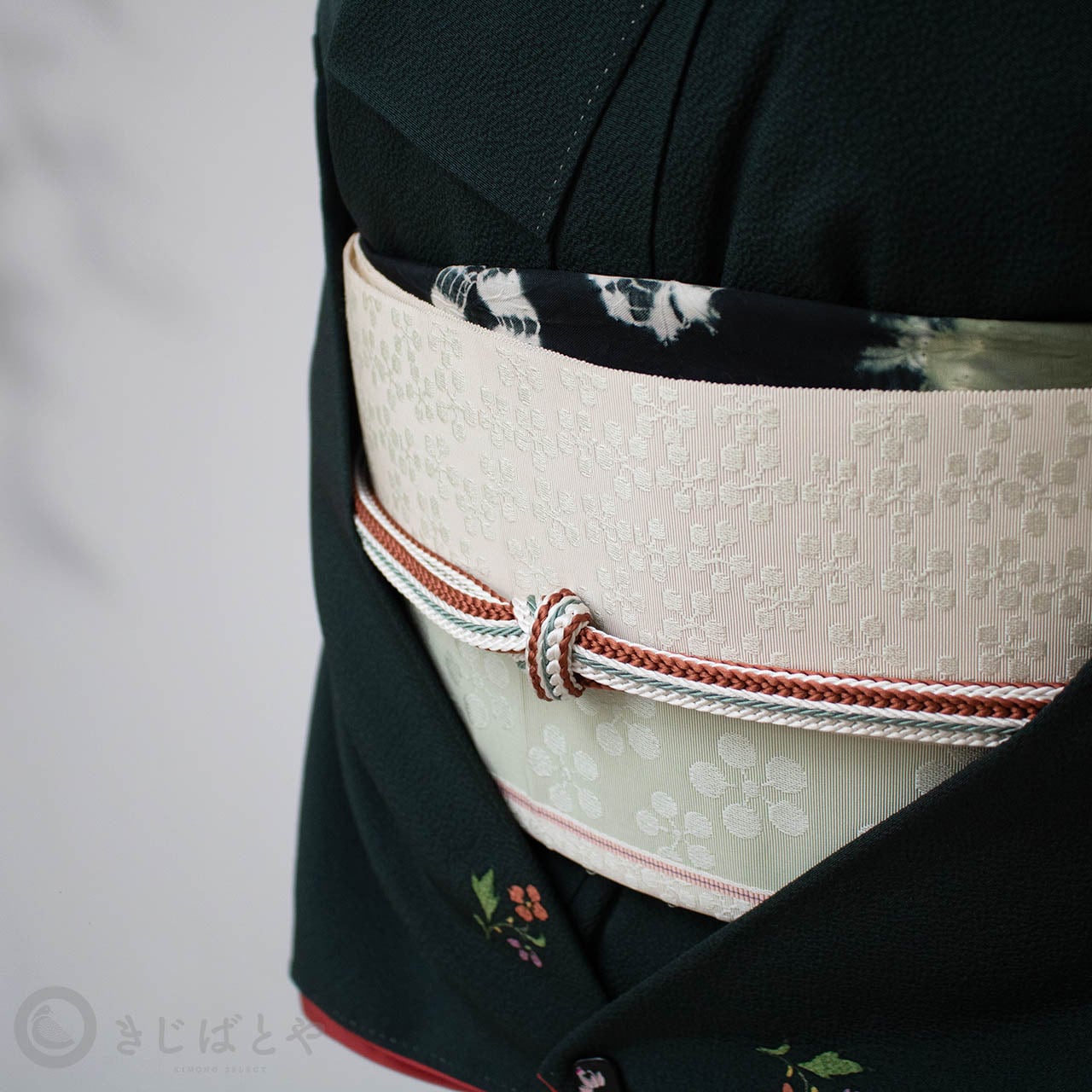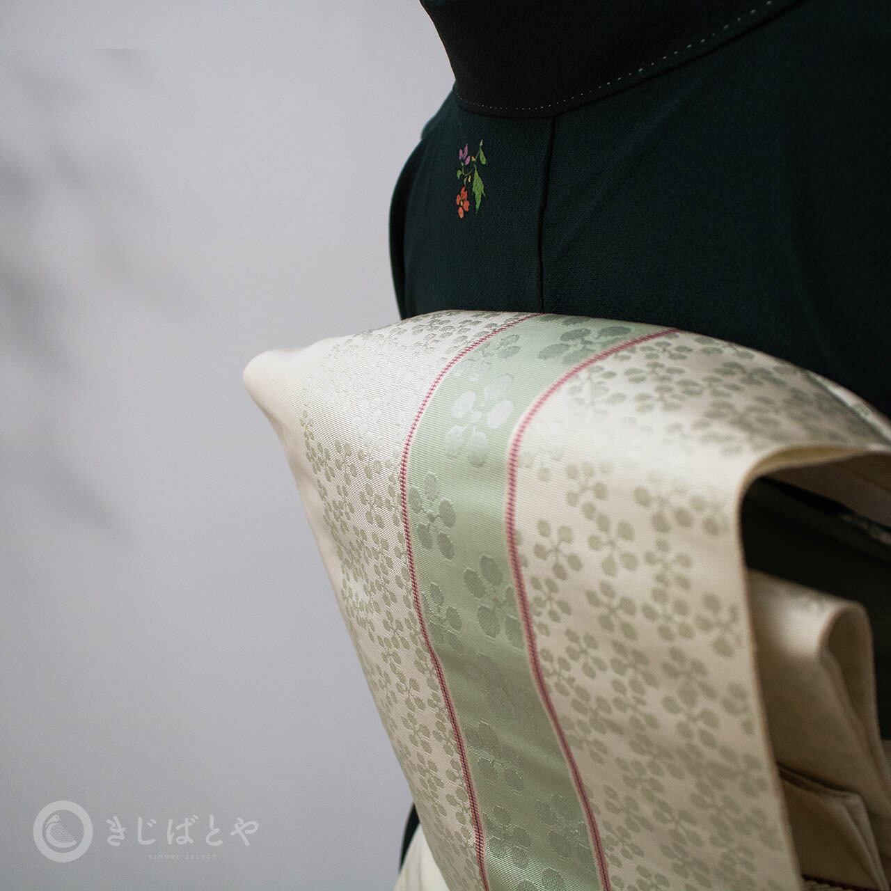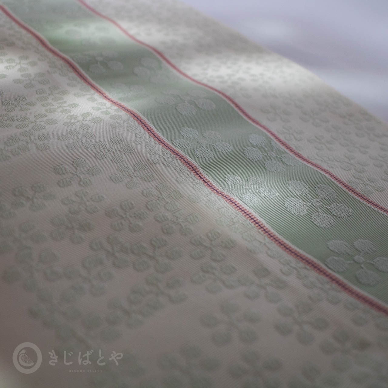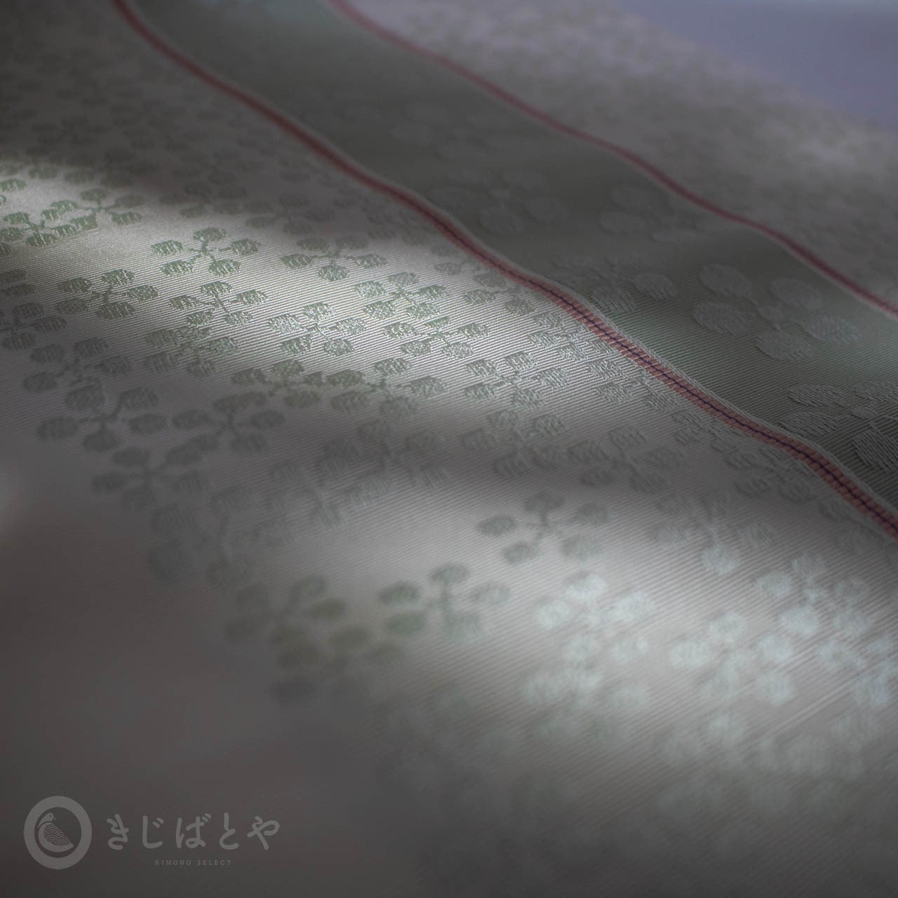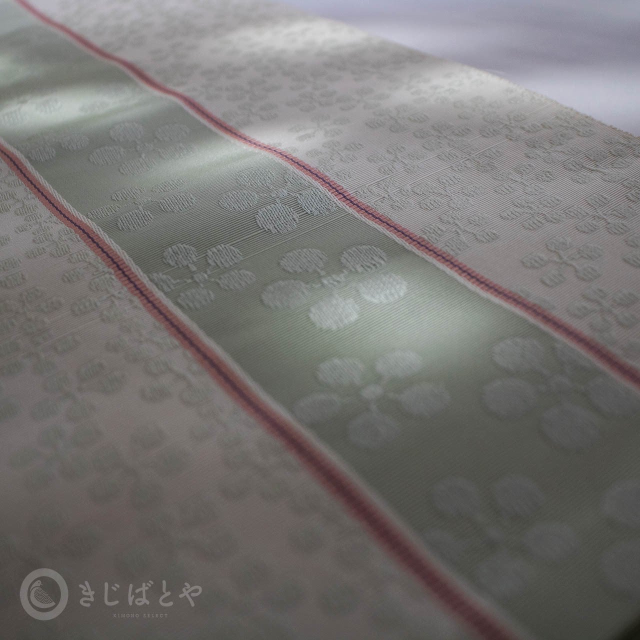 地は明るくやわらかな白地で、ごくごく淡い青磁で梅鉢が織られ、全体に入る青磁の線が爽やに流れています。