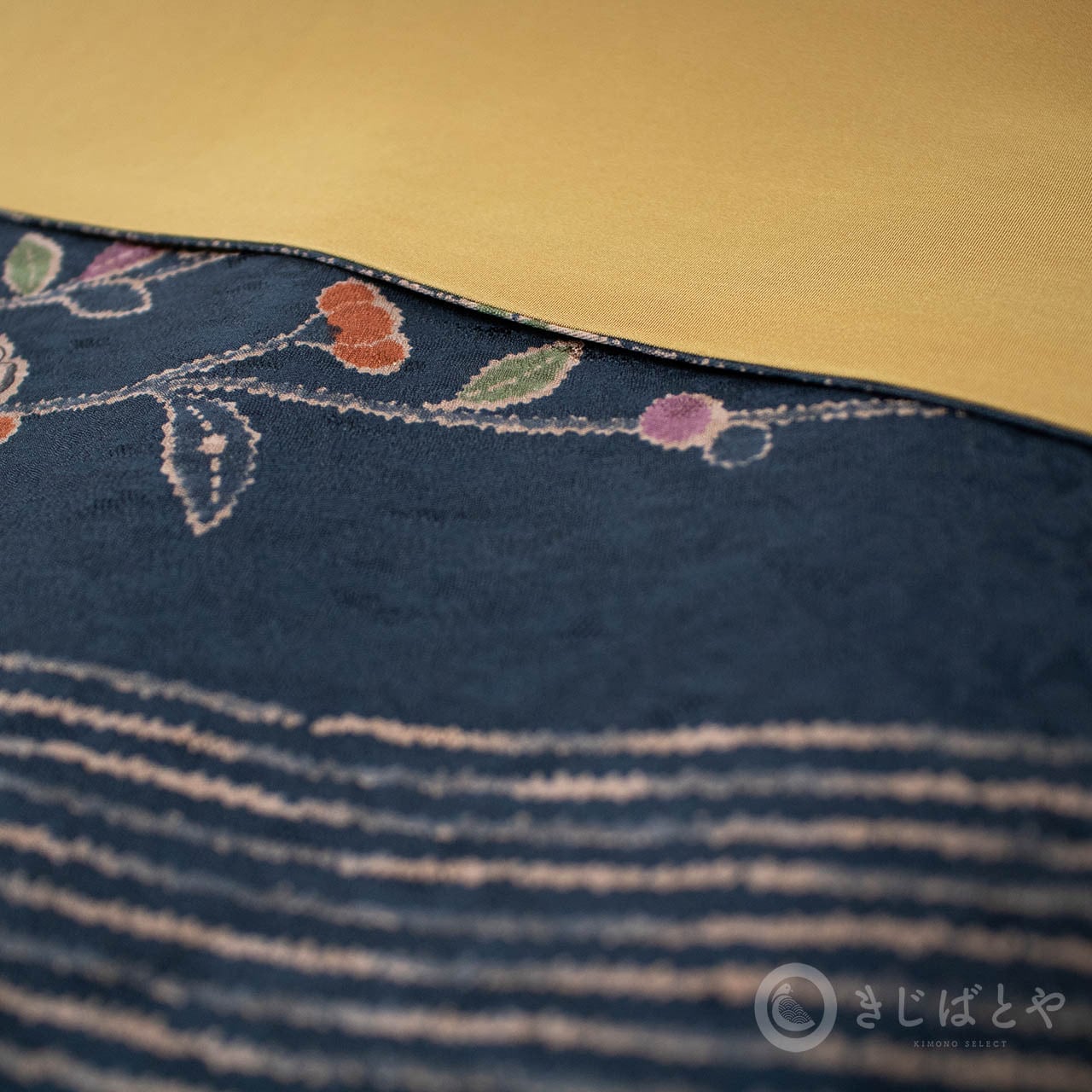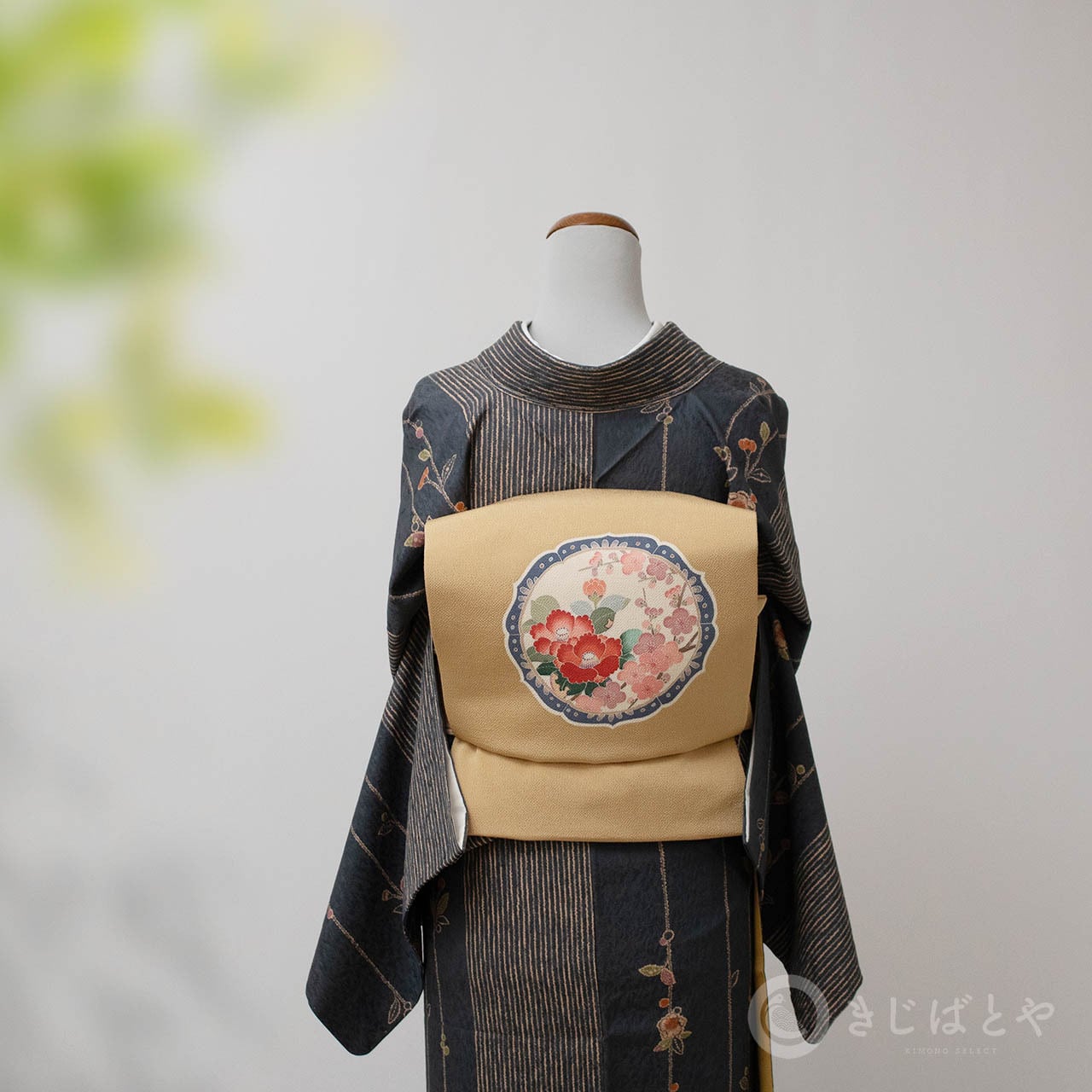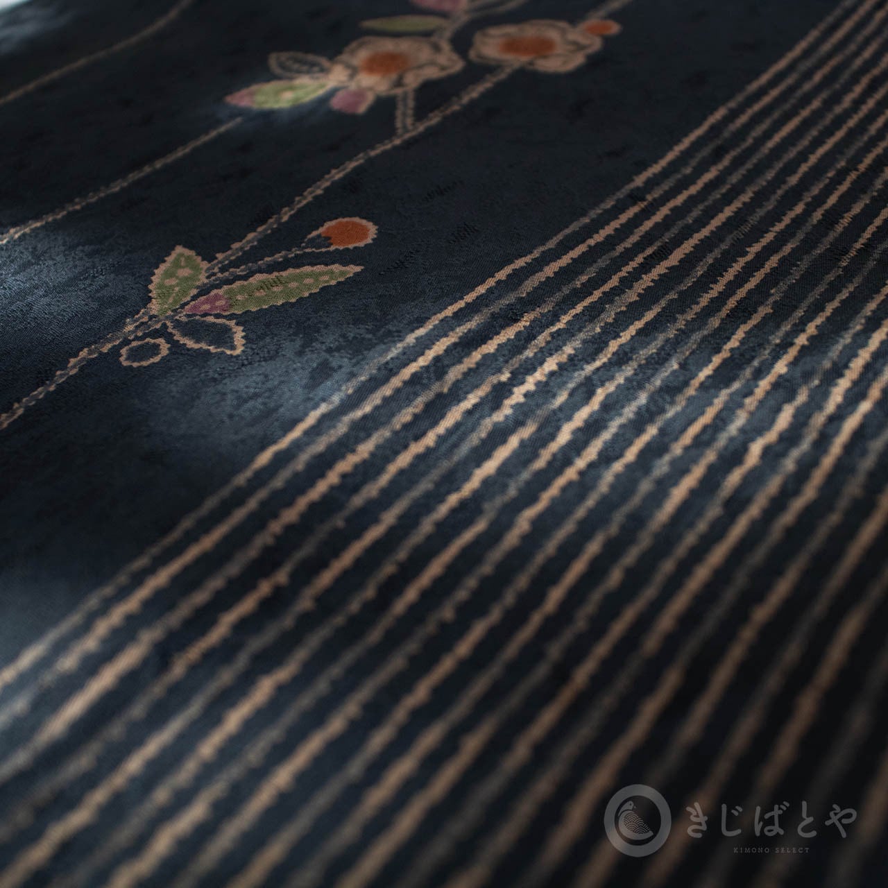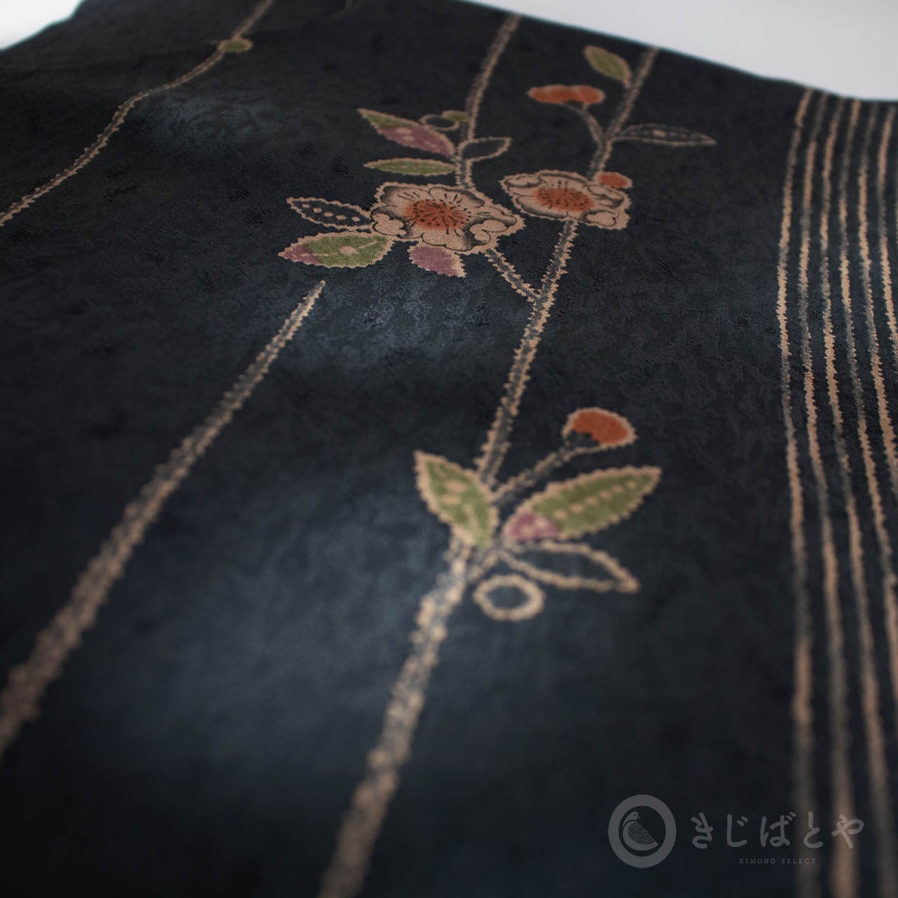深く落ち着いた地の中に、やわらかな色であしらわれた柄が美しく、なんともいえないバランスです。縞は着姿をほっそりと見せてくれますが、粋になりすぎるという難しさもあります。こちらのようなやわらかで動きのある縞でしたら粋になりすぎず、やわらかさもあり、とても着やすいかと思います。