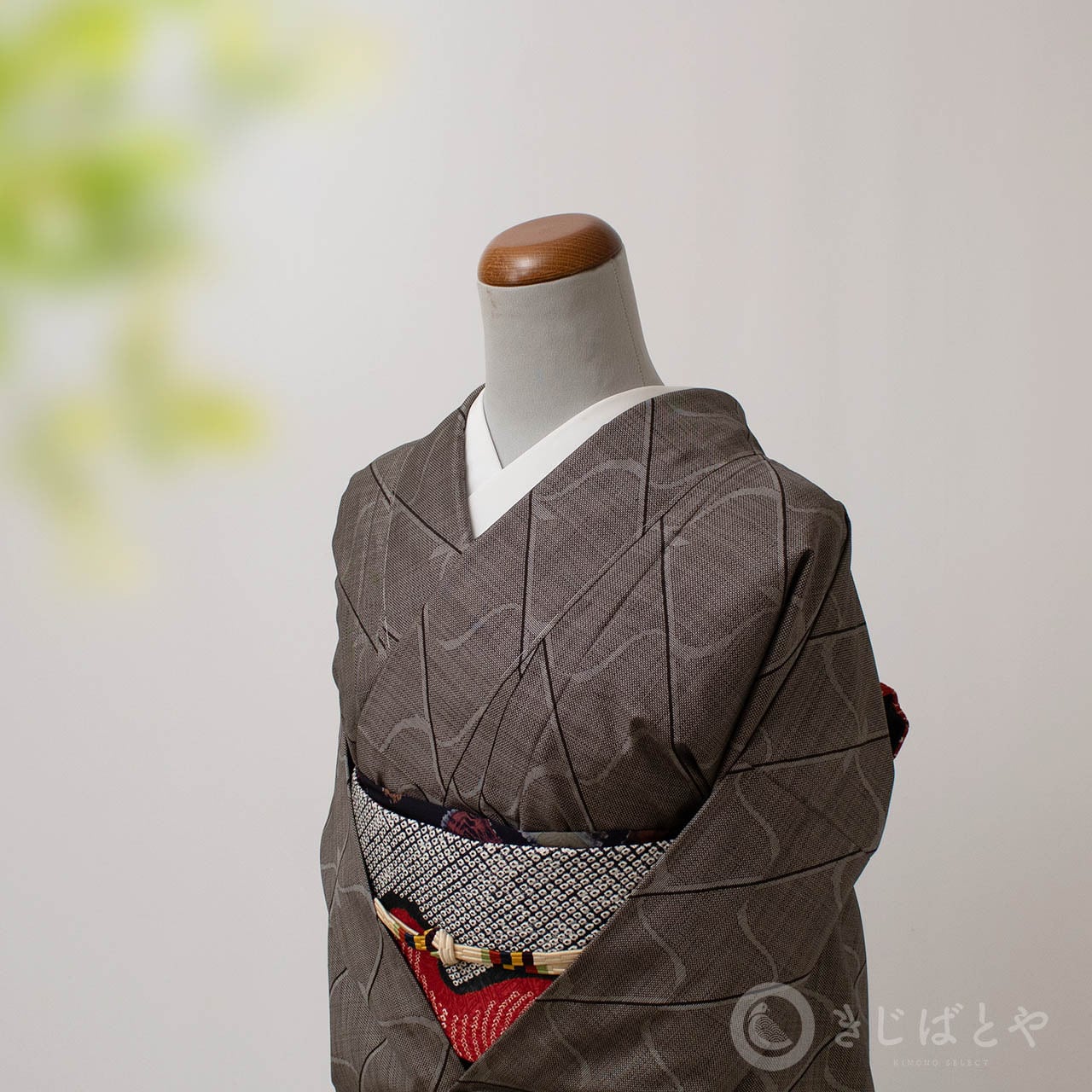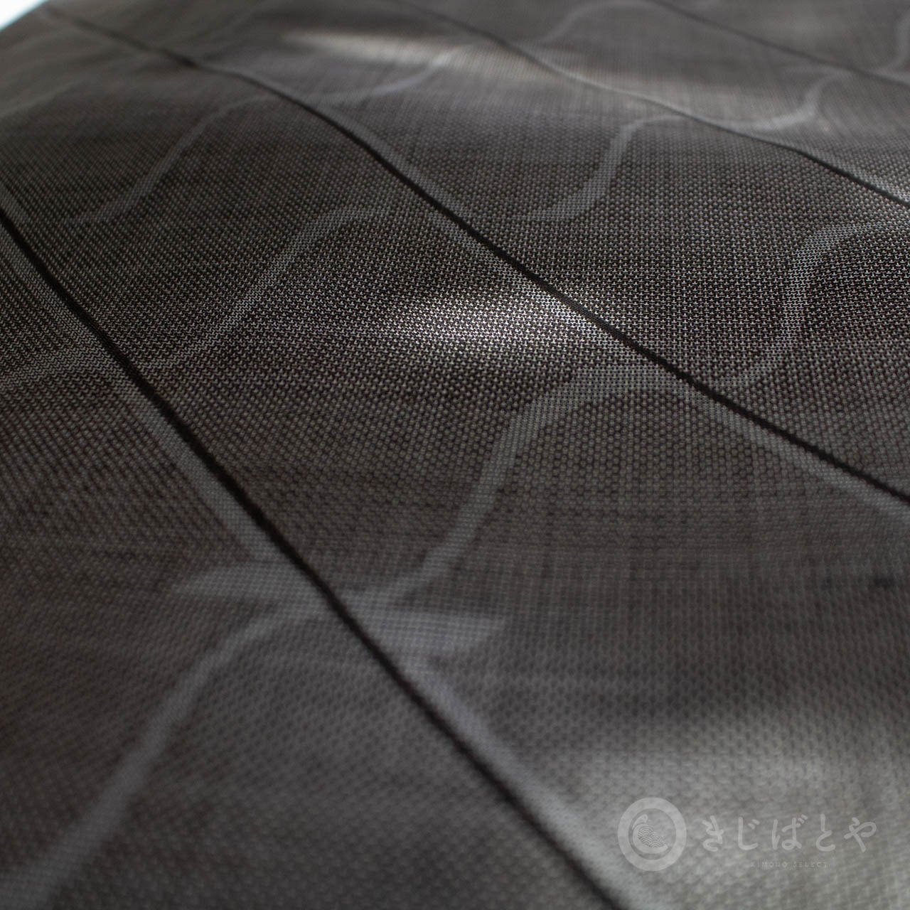 地は消炭色(けしずみいろ:橙みの暗い灰)で、赤みのある焦げ茶に灰をかけたような色・・・というと近いでしょうか。紬の光沢のために硬質な質感があるのですが、柄ゆきと織りの風合いのためにやわらかさもあり、シンプルながらとても表情のある小紋です。