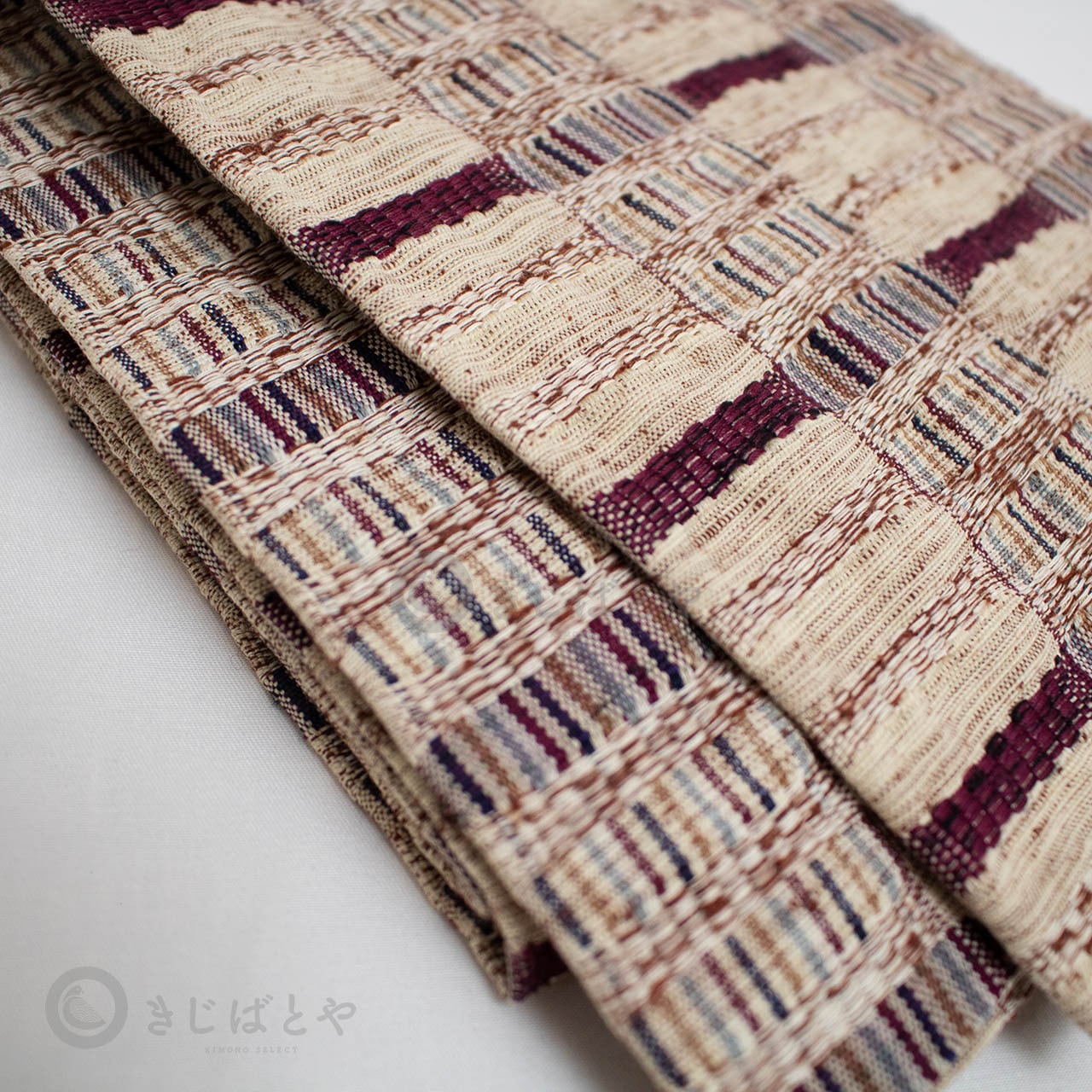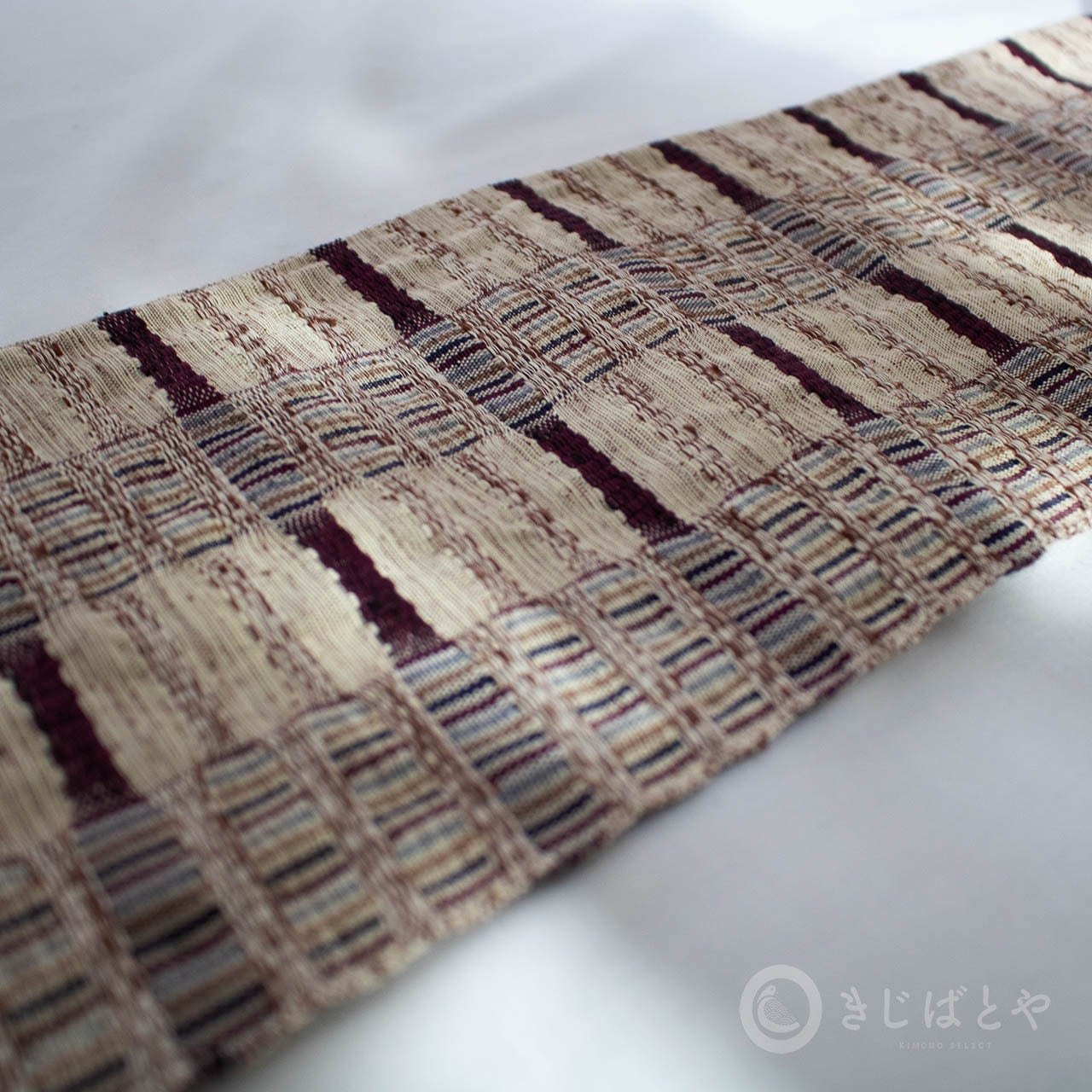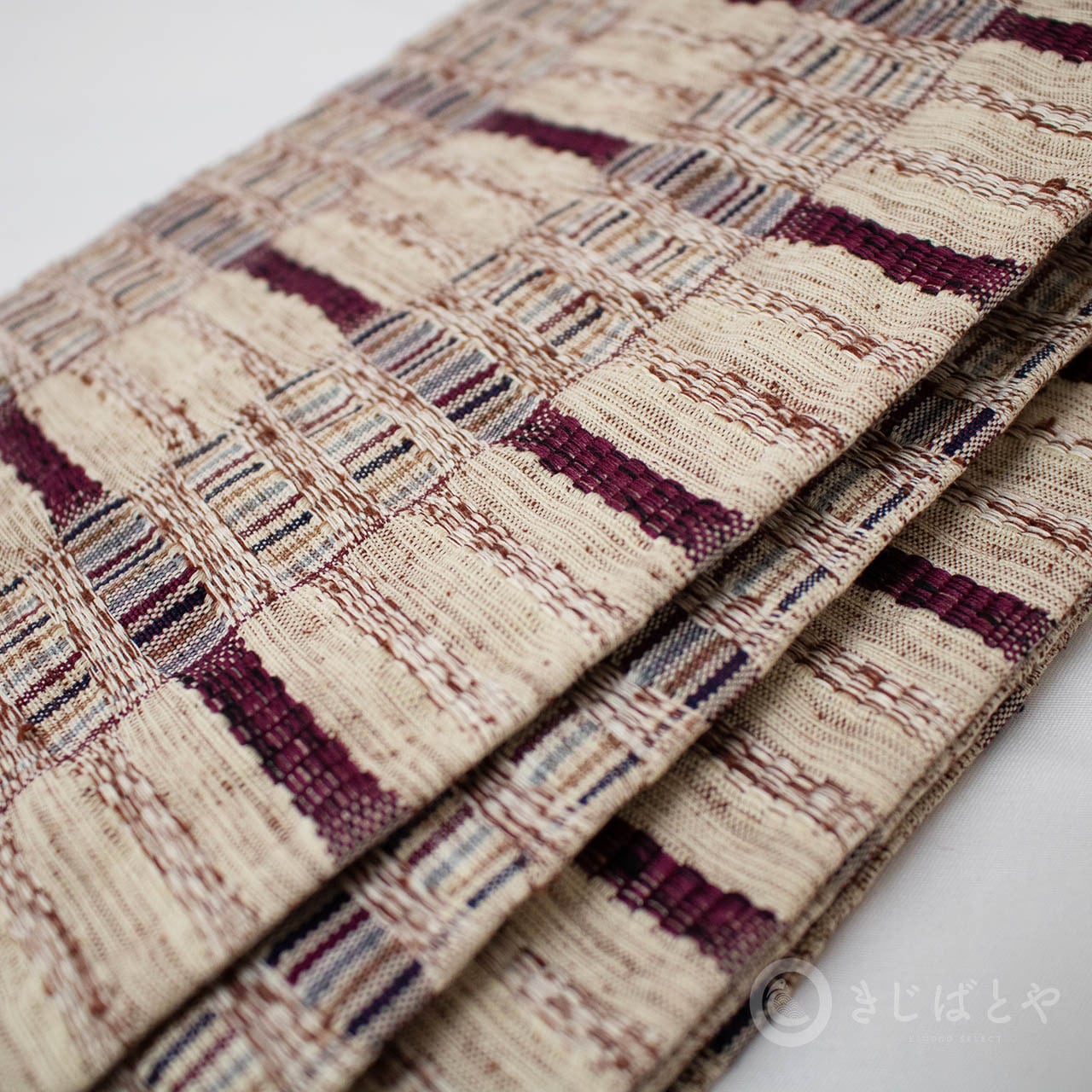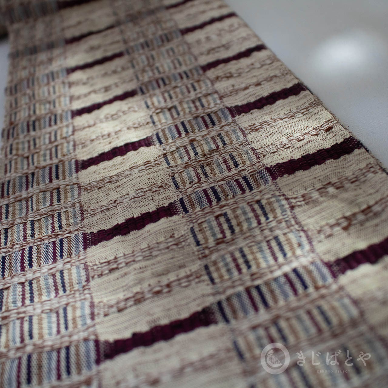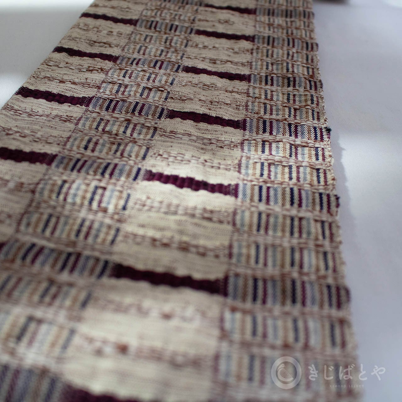 地は白茶(しらちゃ:橙みの明るい灰)で、生成りよりもベージュよりの色みというと近いでしょうか。やわらかな地に、木蘭色(もくらんじき:深く渋い紅)の織りが入っています。