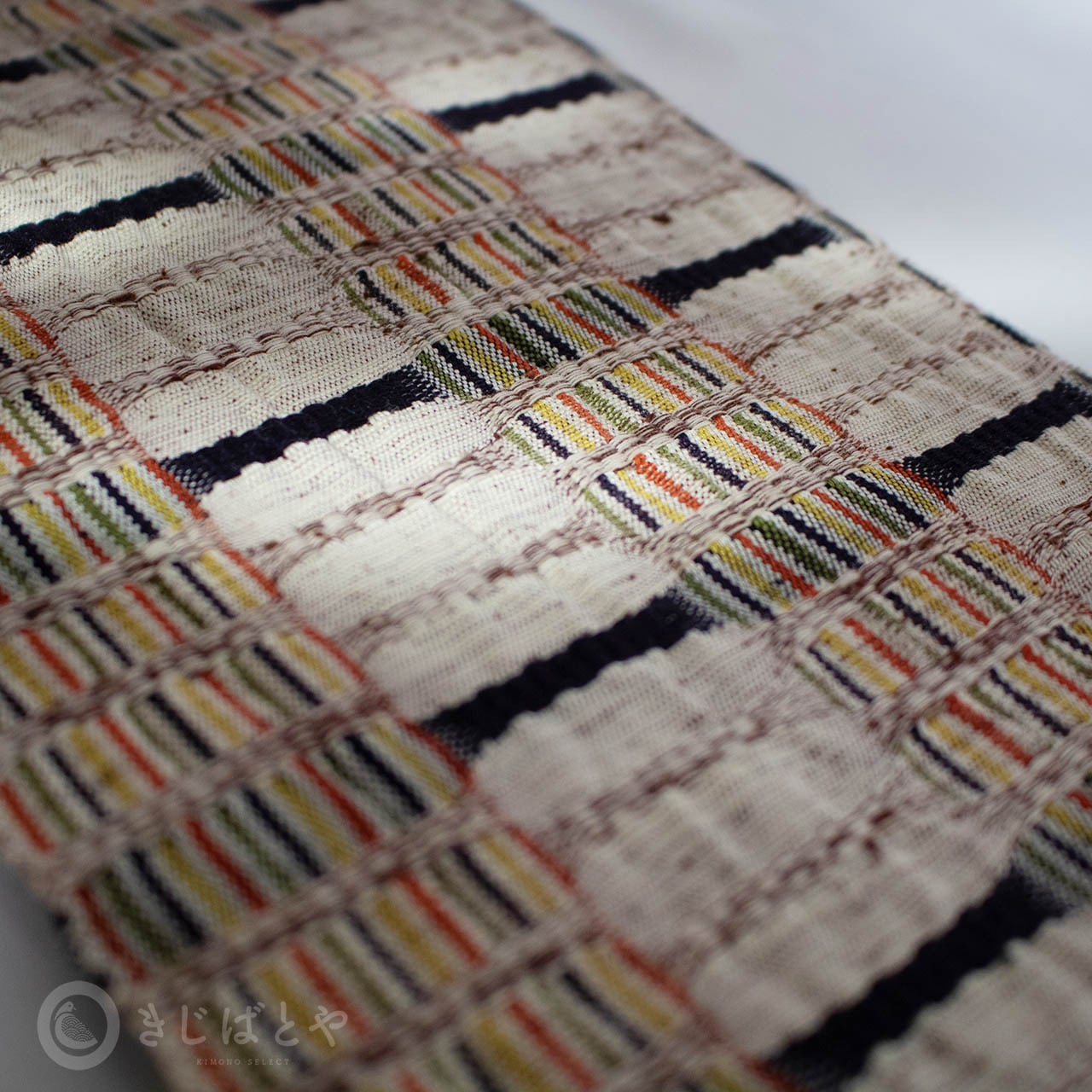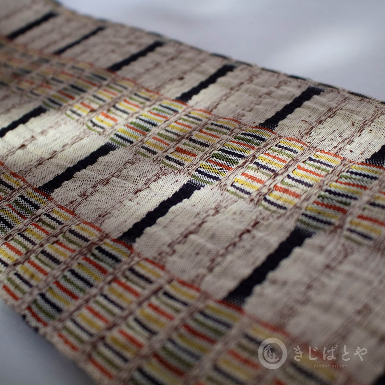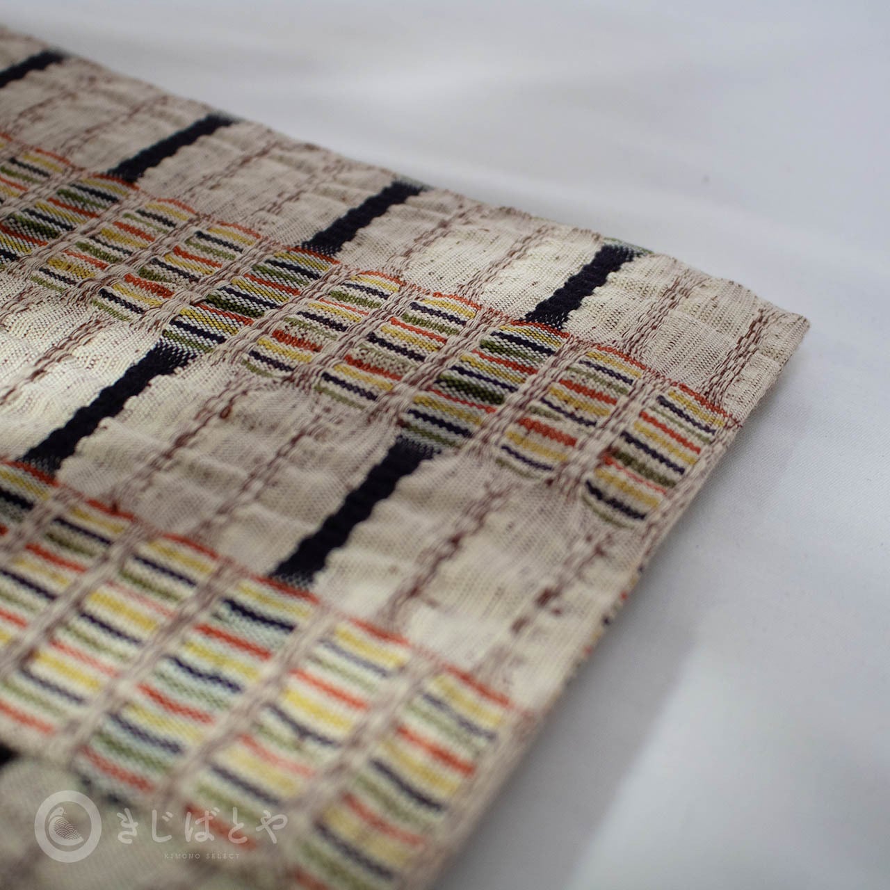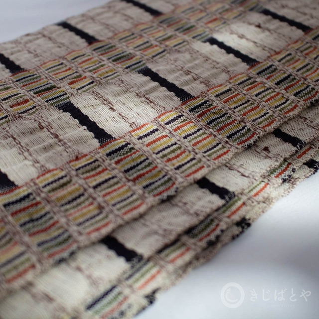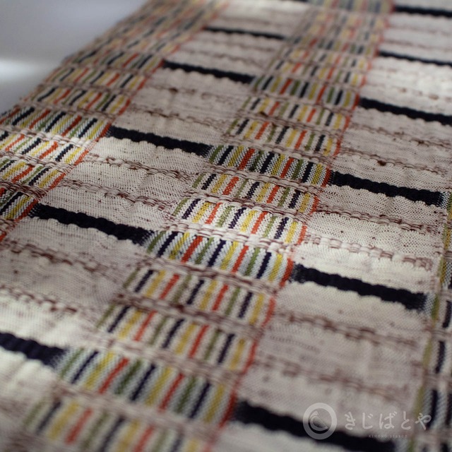 地は白茶(しらちゃ:橙みの明るい灰)で、生成りよりもベージュよりの色みというと近いでしょうか。やわらかな地に、黒の織りが入っています。