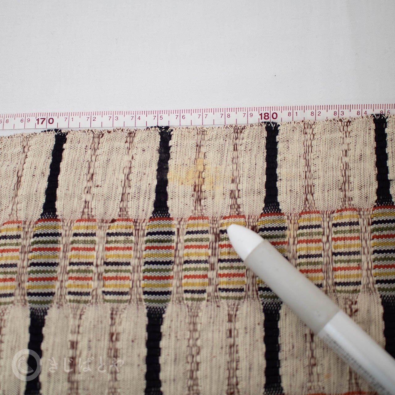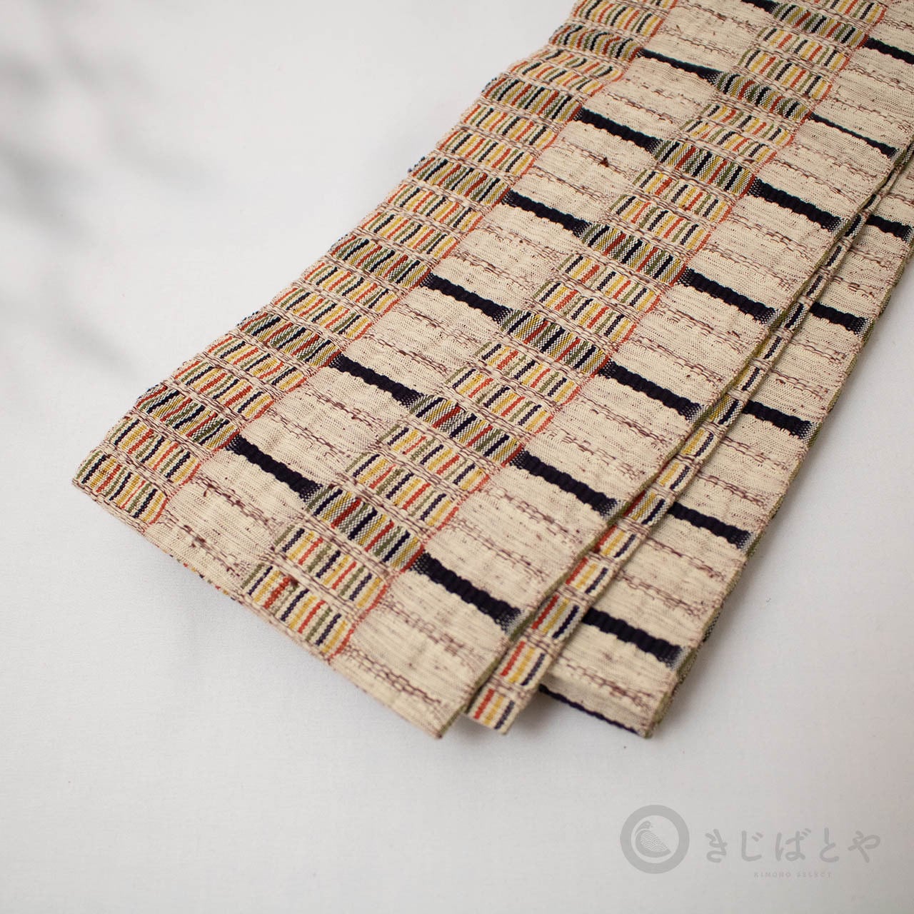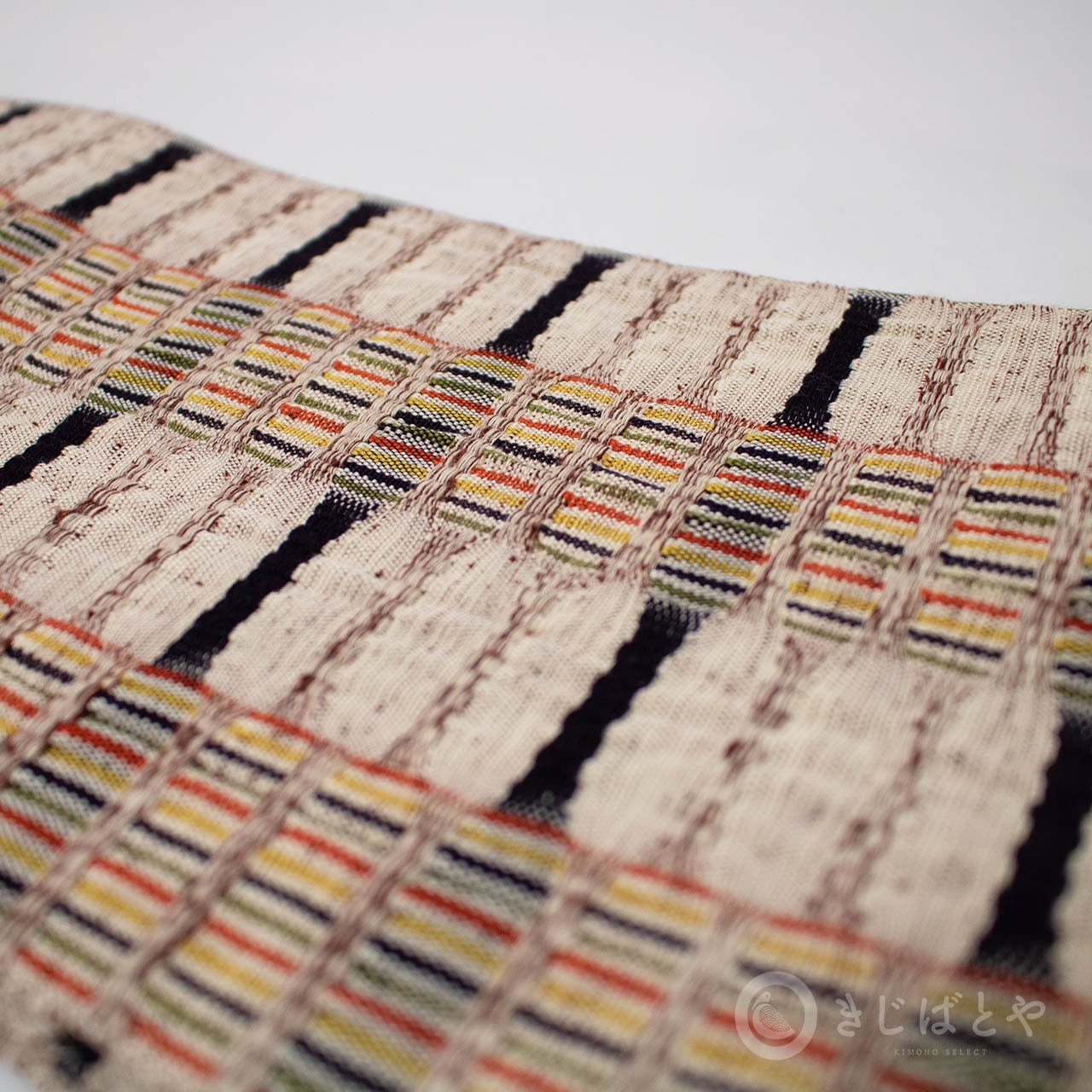地は白茶(しらちゃ:橙みの明るい灰)で、生成りよりもベージュよりの色みというと近いでしょうか。やわらかな地に、黒の織りが入っています。