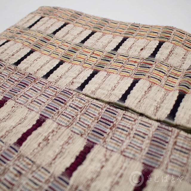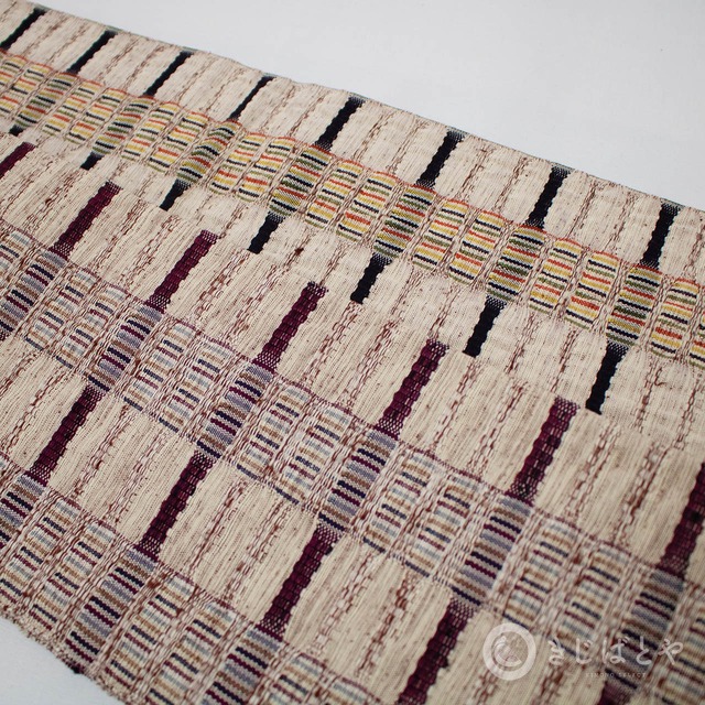 こちらは証紙はないのですが、スワセンイさんの「紬さがの」帯だと思われますが、本当にこちらの帯は一本一本色が違って、それぞれの表情があってとても素敵です。