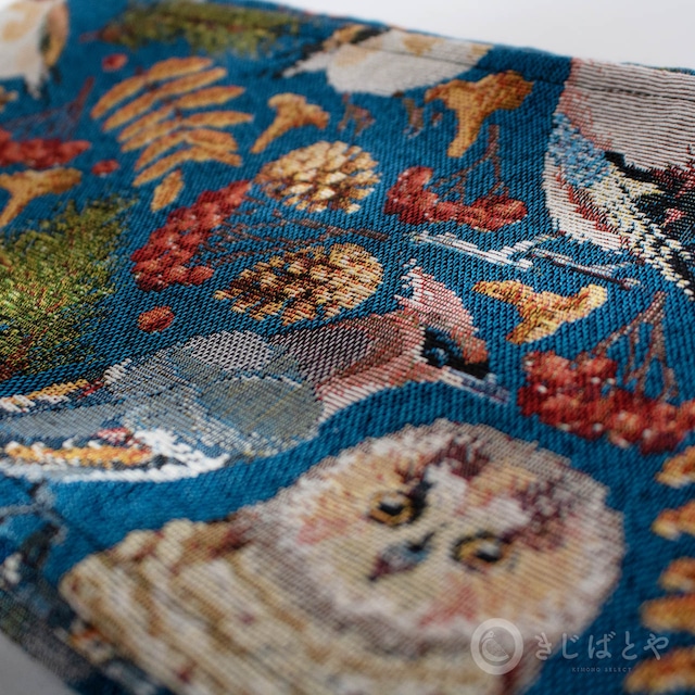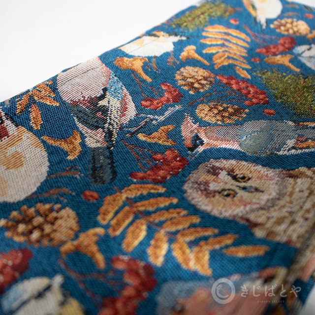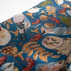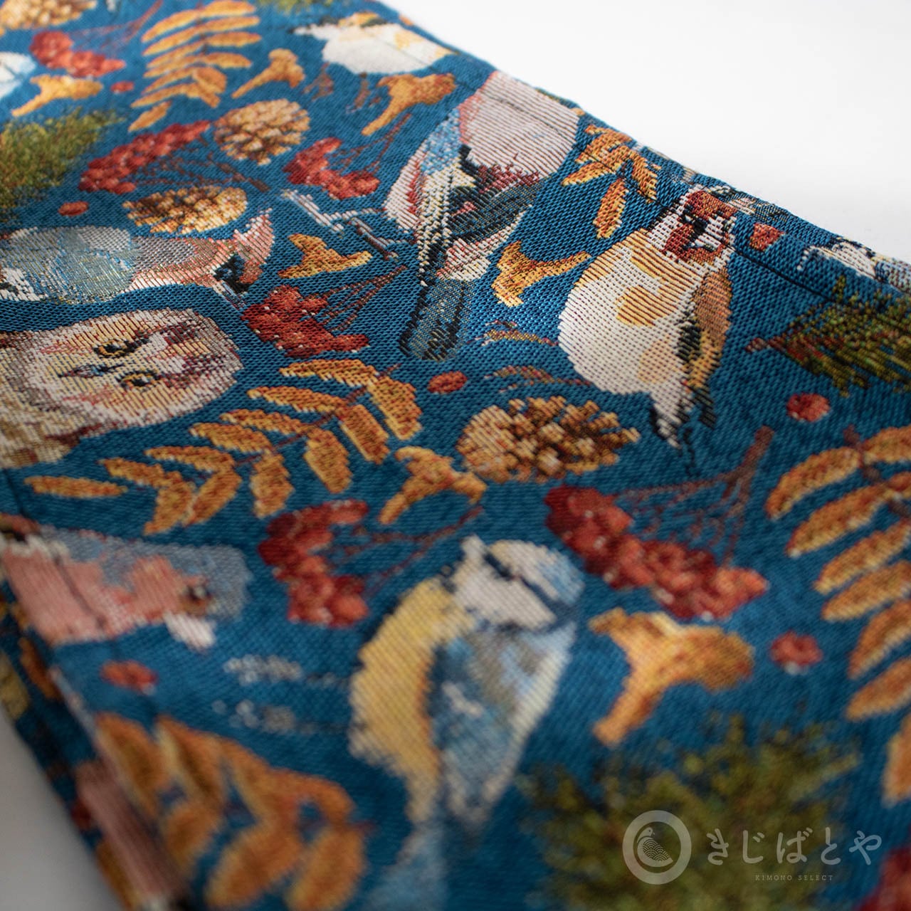 深い青に色とりどりの小鳥たちと木の実が織られています。