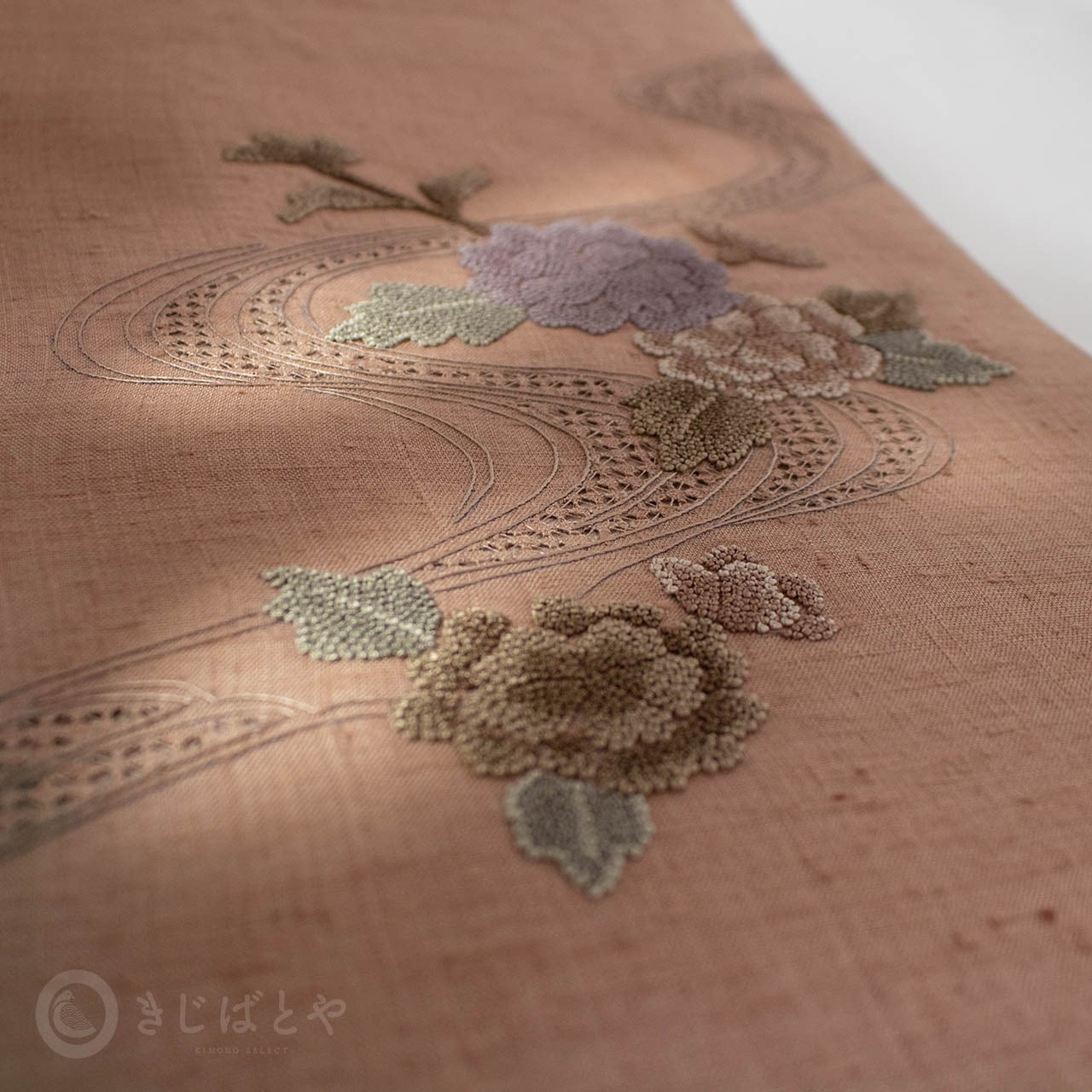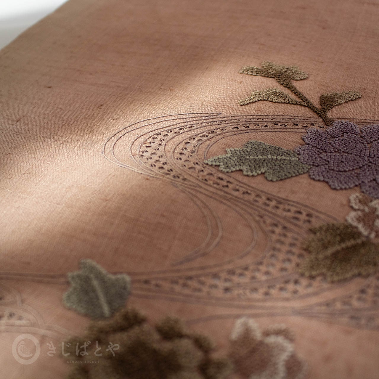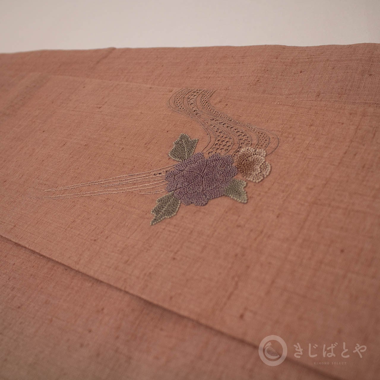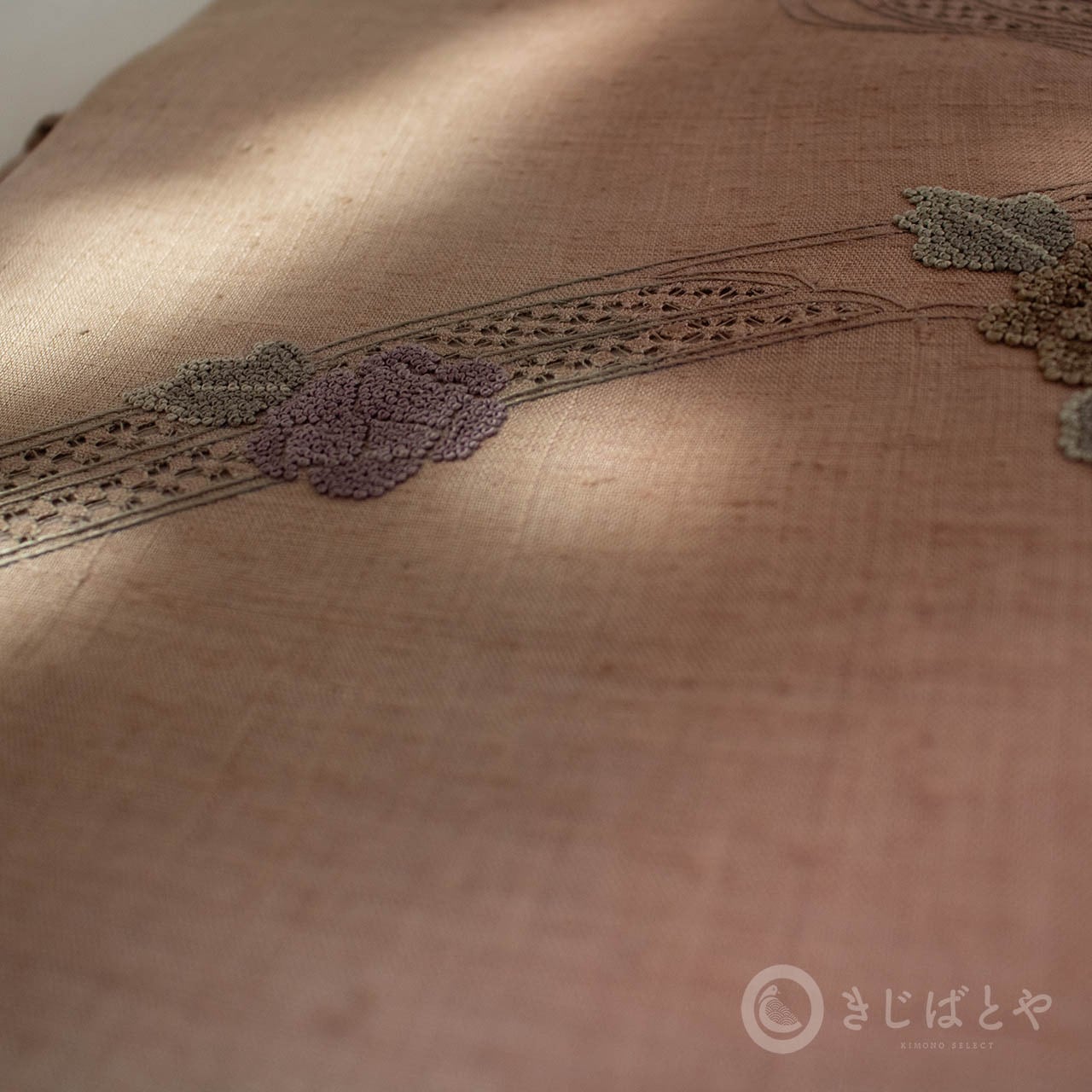 地は紅鼠(べにねず:淡く渋い紅赤)と薄鼠(うすねず:明るい灰)のぼかしになっており、抑えた色みで相良刺繍とドローンワークがほどこされています。