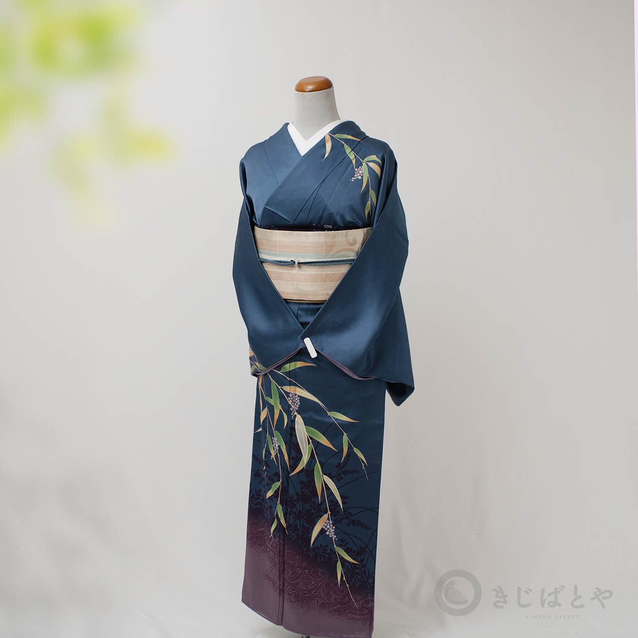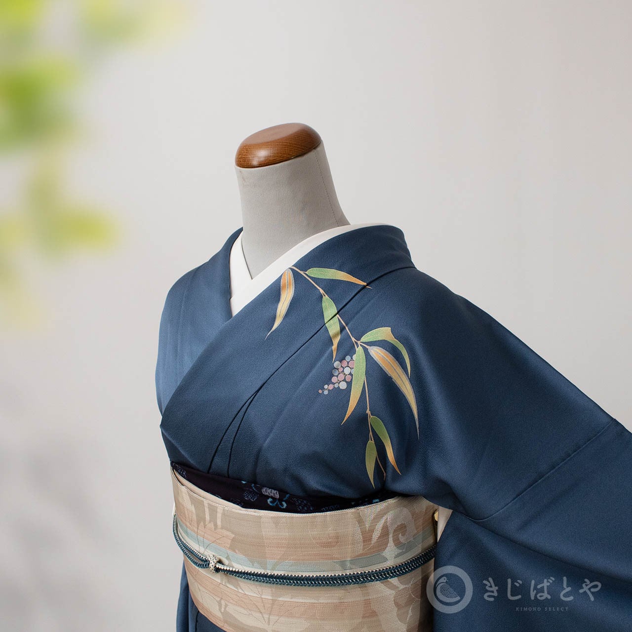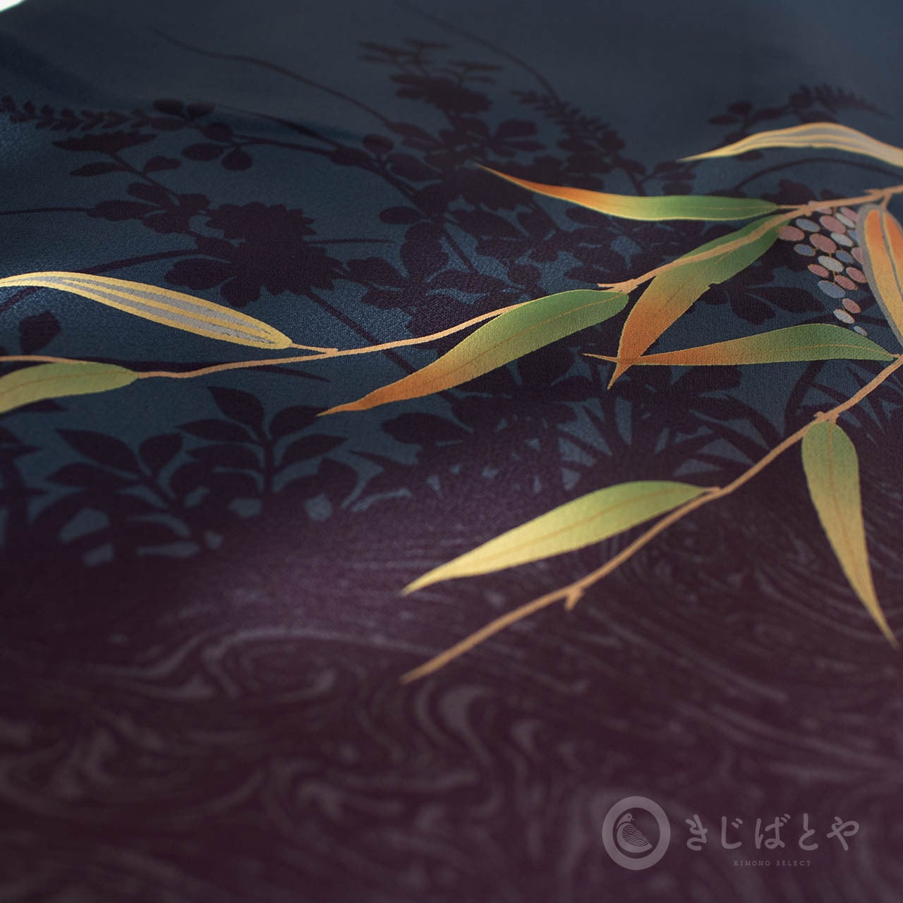 斜めにかかる葉の柄と、深く沈む葉影の柄、袂と裾に入る墨流しの色との調和が素晴らしく、見ていて飽きることがありません。