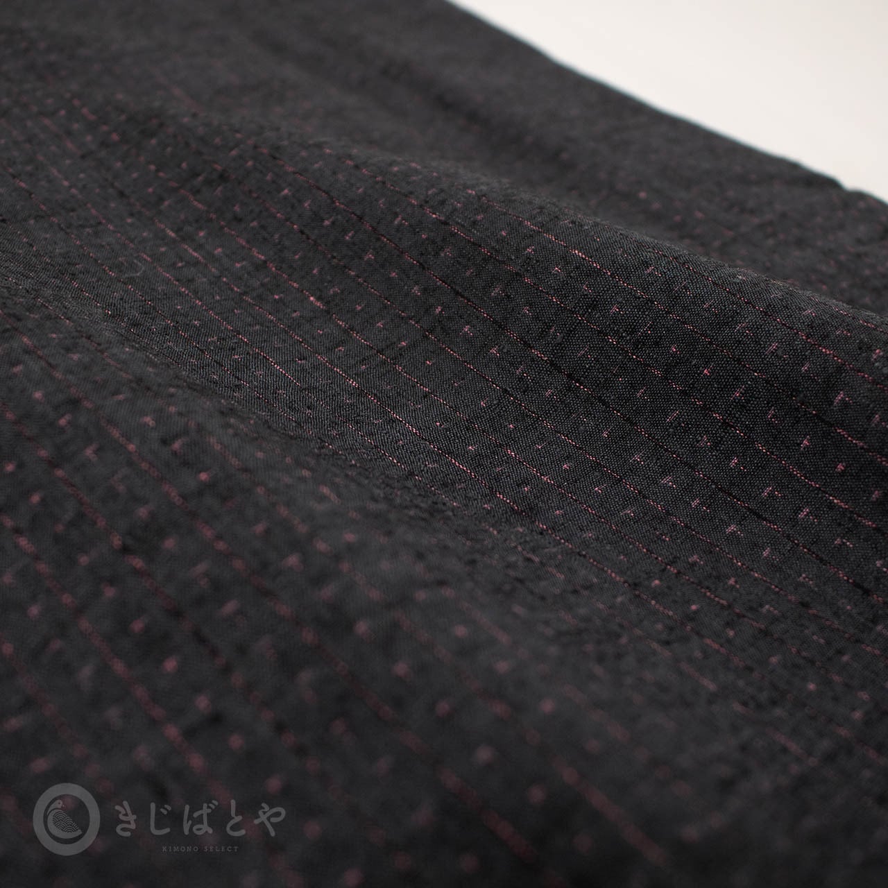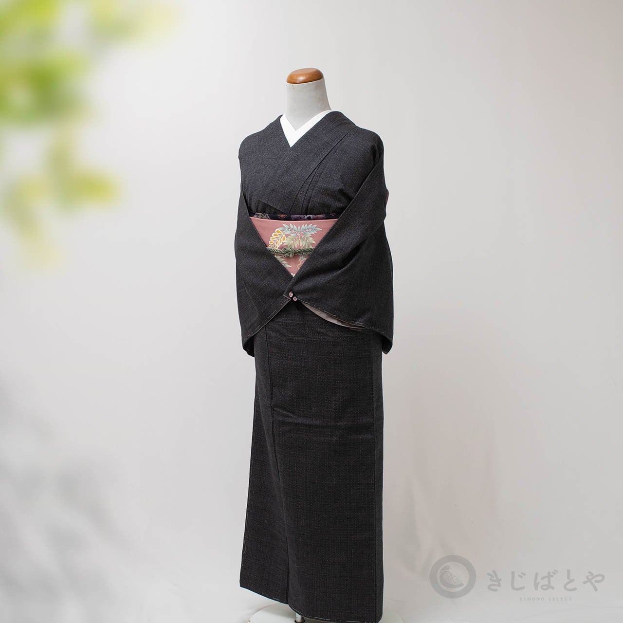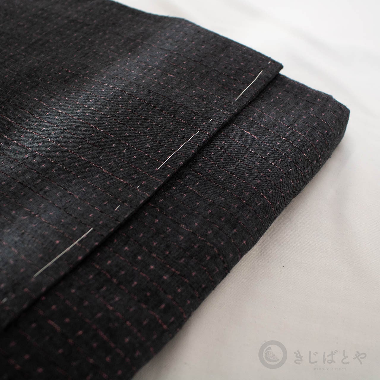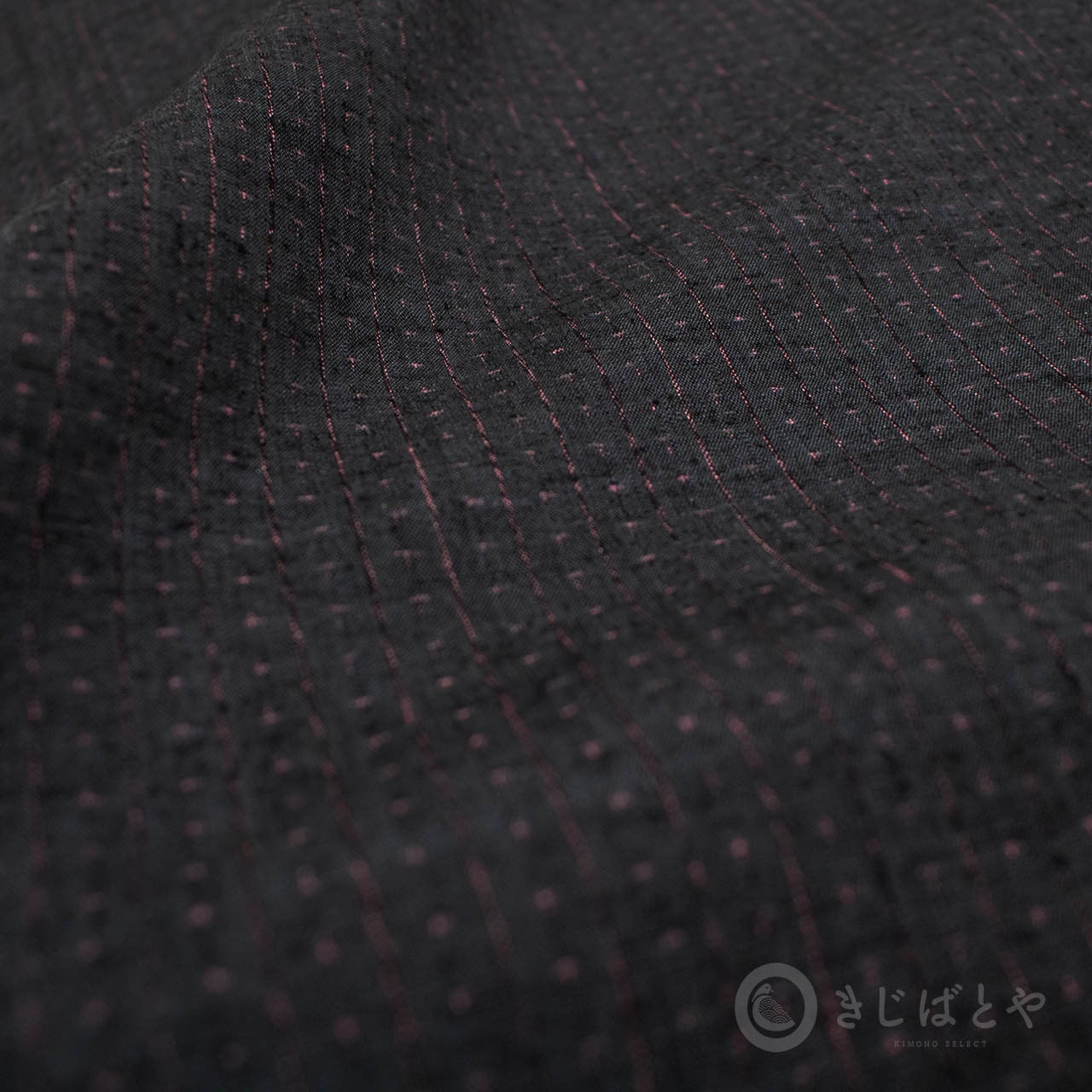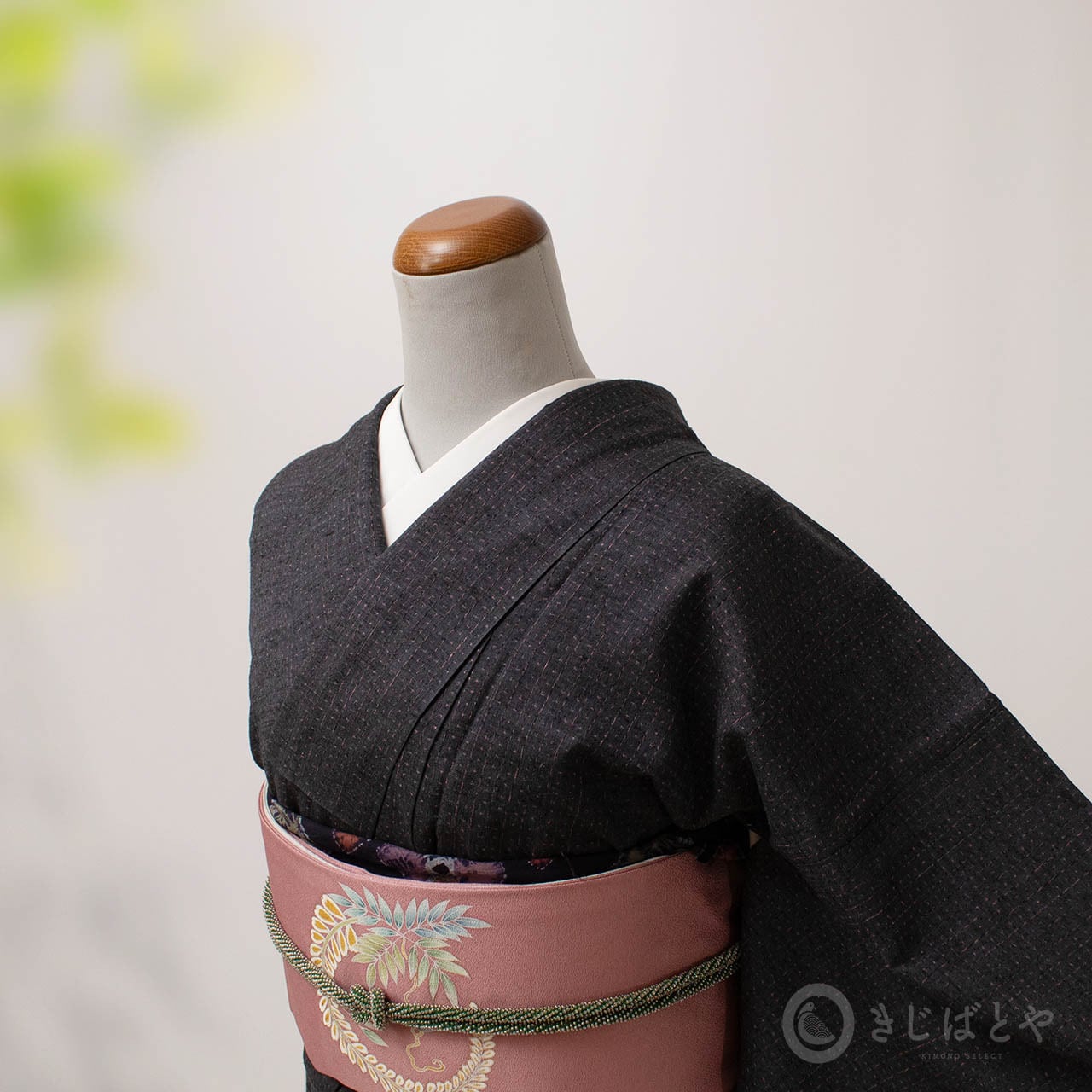 地は深い深い墨色で、積紅(せきこう:明るく渋い紅)の織りが小さく入っています。画像をご覧いただけるとお分かりになるかと思いますが、積紅はごく小さく入っているため、少し離れると無地の印象になります。が、この小さな色が全体の色みをやわらかく深くしてくれ、なんともいい色になります。