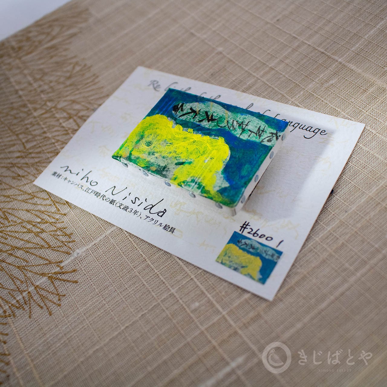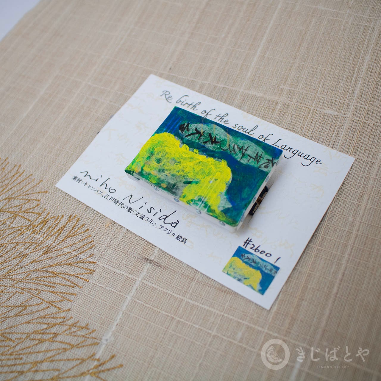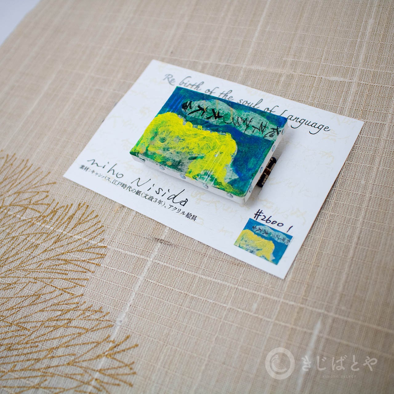そのときはピンバッヂだったのですが、帯の上にカンバスを置けたらどんなに素敵だろうと思い、ぜひきじばとやの10周年記念の棚に帯留めとして並べたいと熱望し、お願いして叶った帯留めです。