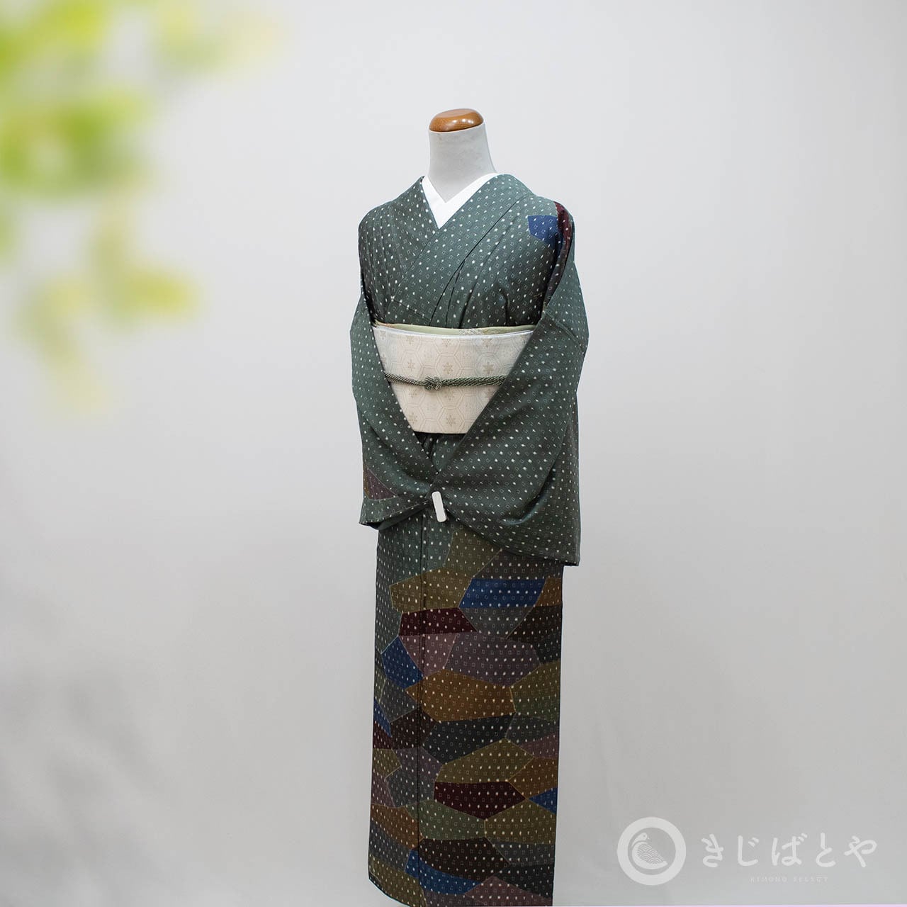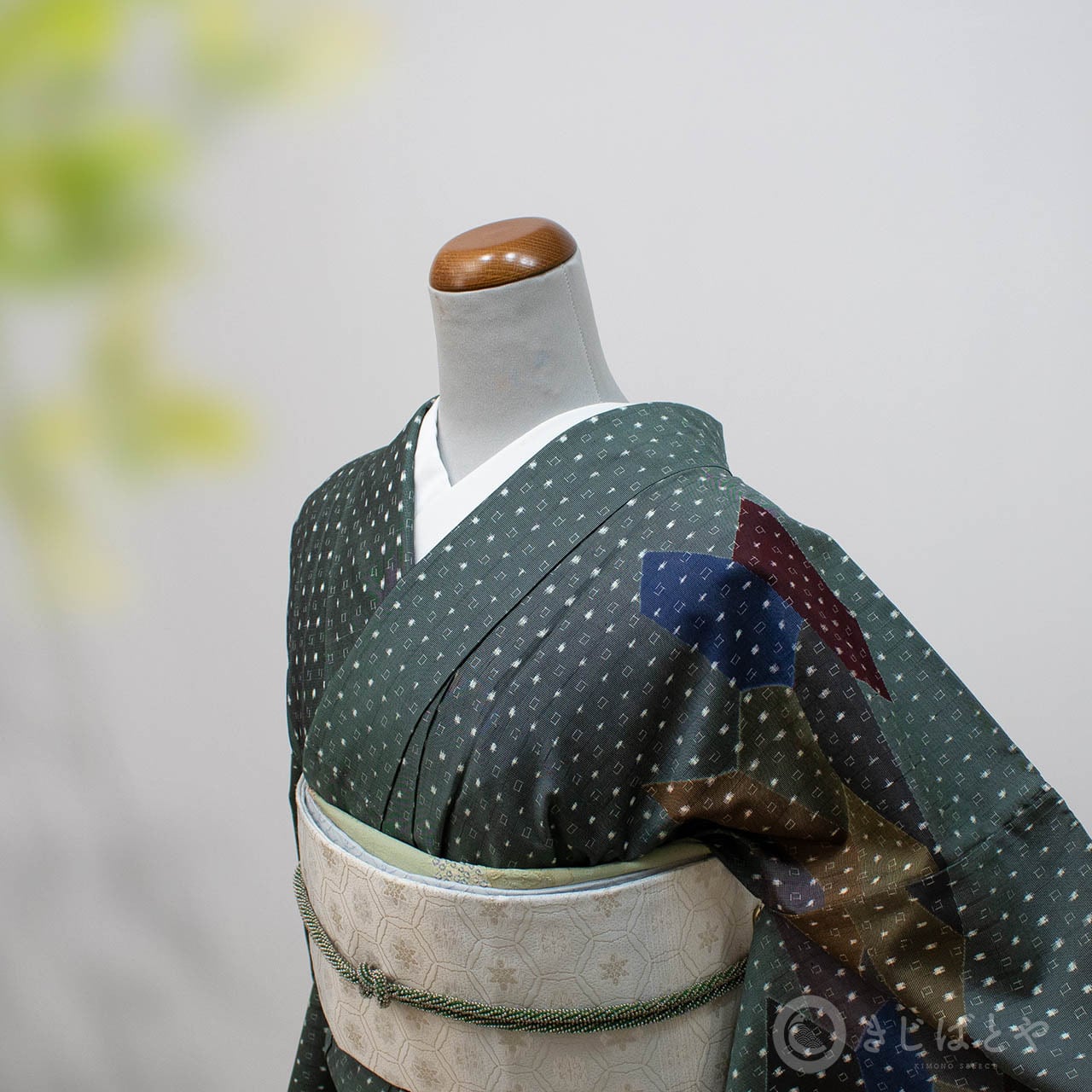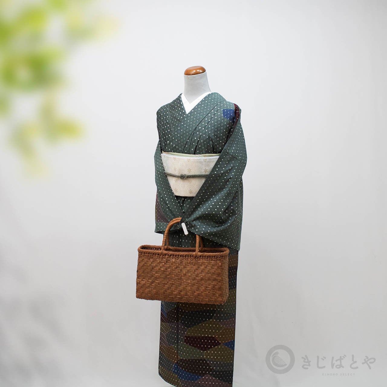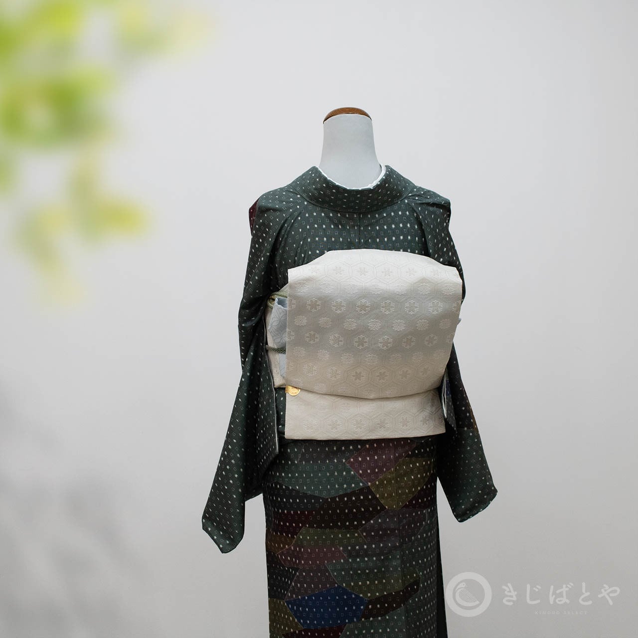 地は青漆(せいしつ:深く渋い緑)で、深くこくのある緑なのですが、織りのために少し白が混じったような、やわらかな深い緑の印象です。