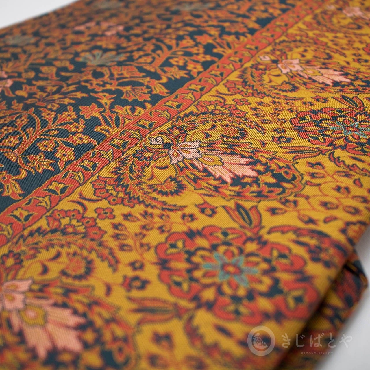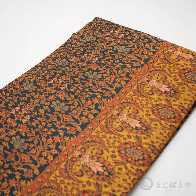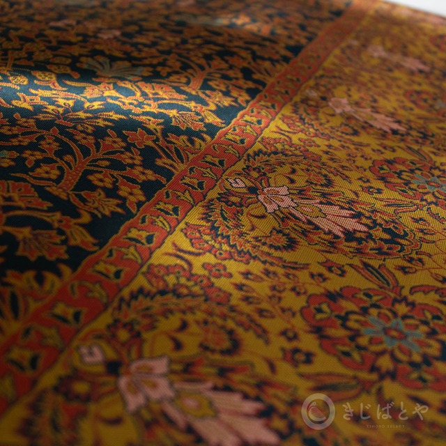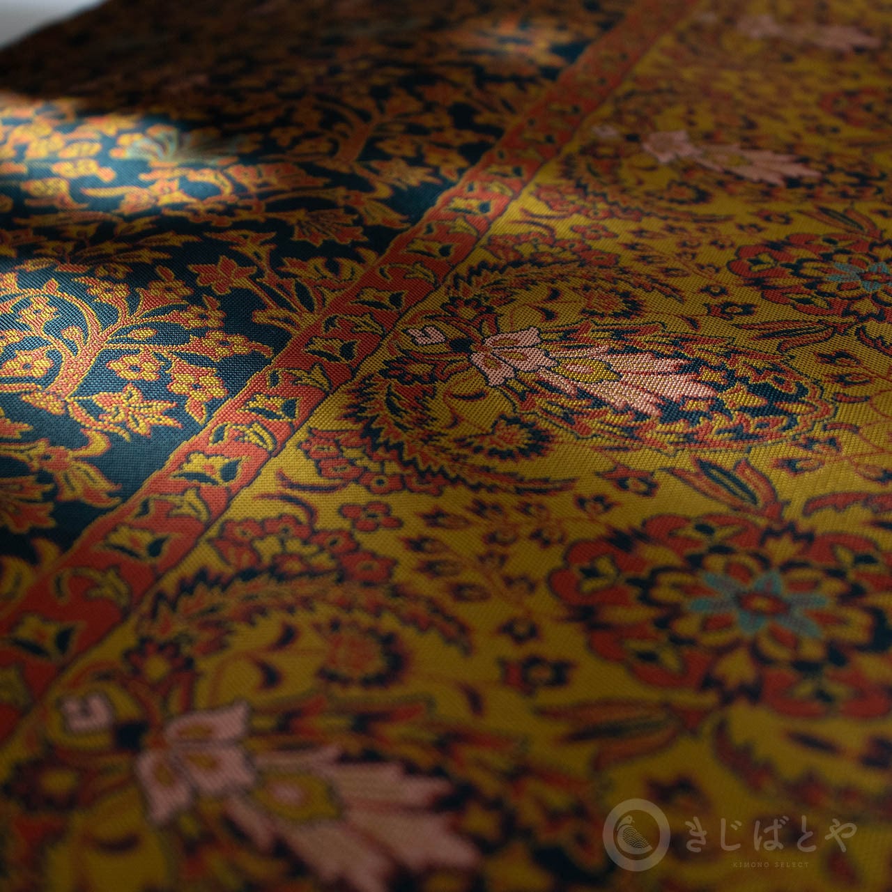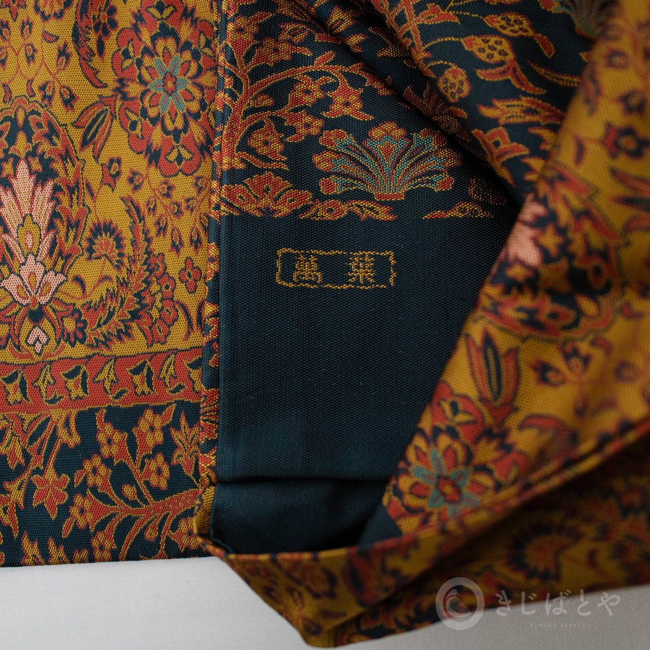 地は海松藍(みるあい:暗い青)と黄櫨色(はじいろ:強い黄)の切り替えになっており、美しい更紗柄が織られています。
