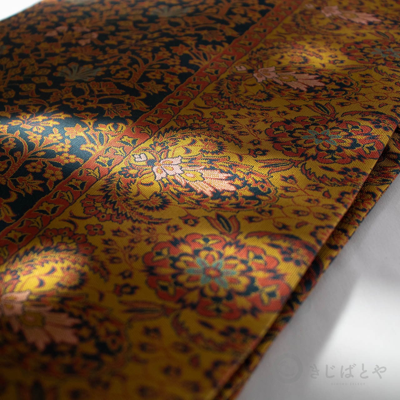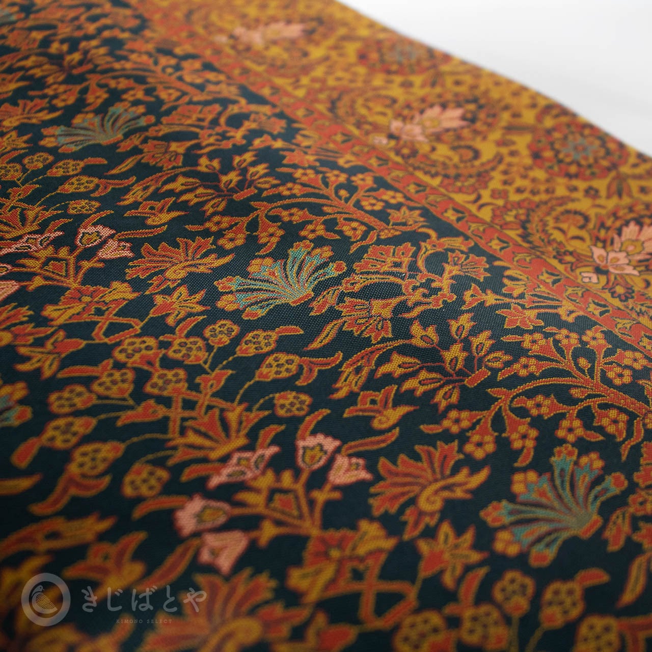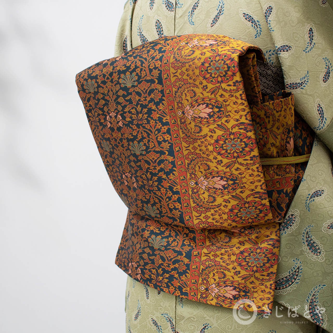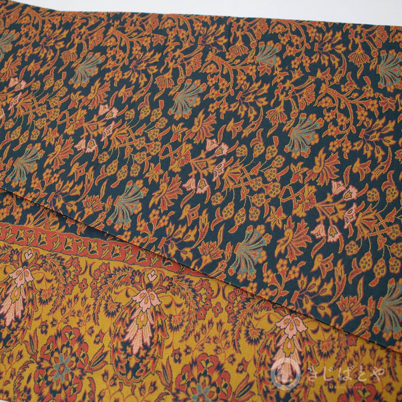 地は海松藍(みるあい:暗い青)と黄櫨色(はじいろ:強い黄)の切り替えになっており、美しい更紗柄が織られています。
